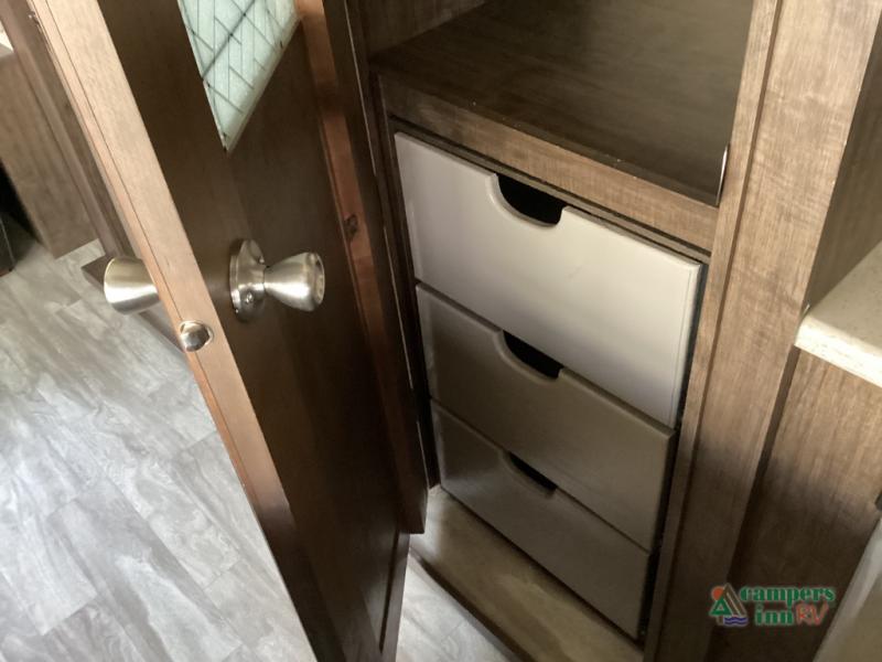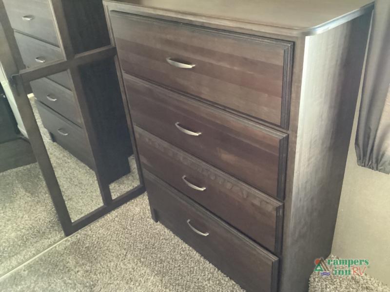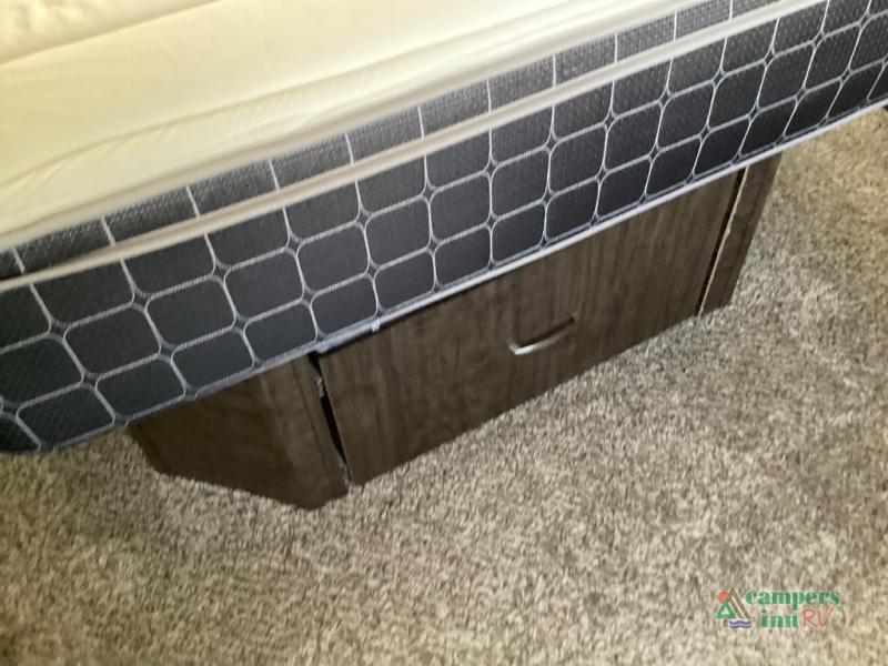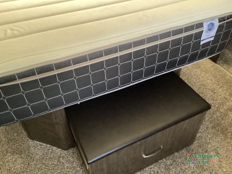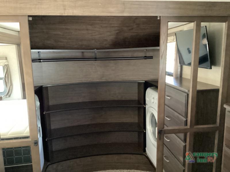 Master Suite Up Front — Spacious bedroom with a slide-out queen bed (optionally king), under-bed storage, dresser, large closet, and washer/dryer prep area.