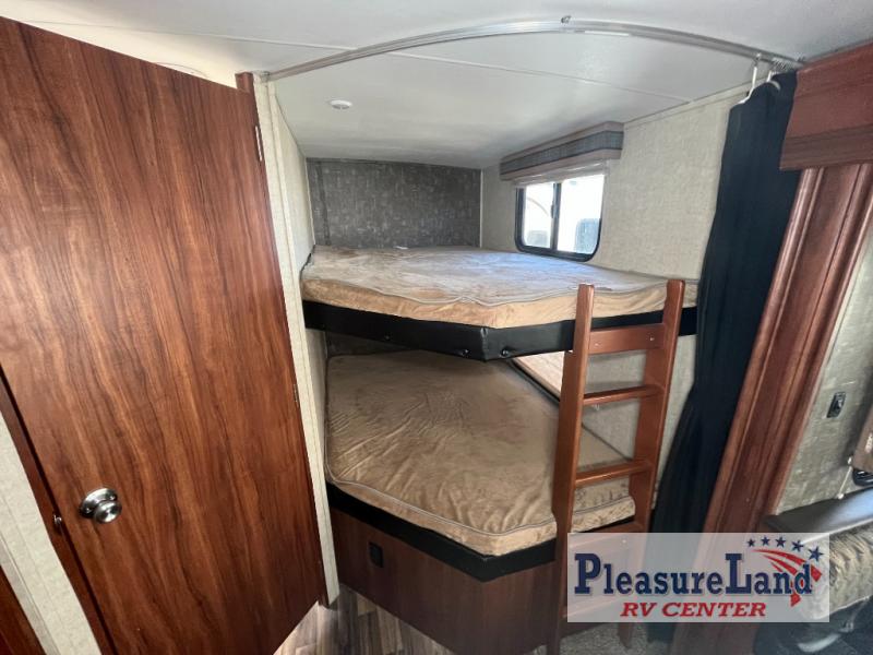 There is a set of queen bed bunks in the opposite rear corner with a ladder for easy access to the top bunk and a curtain that can be pulled for more privacy, plus so much more!