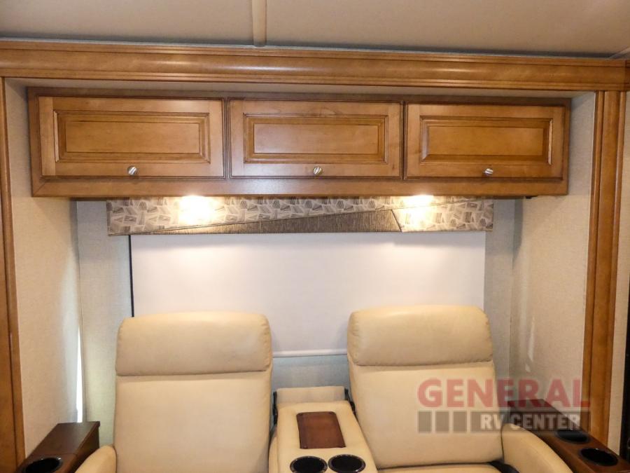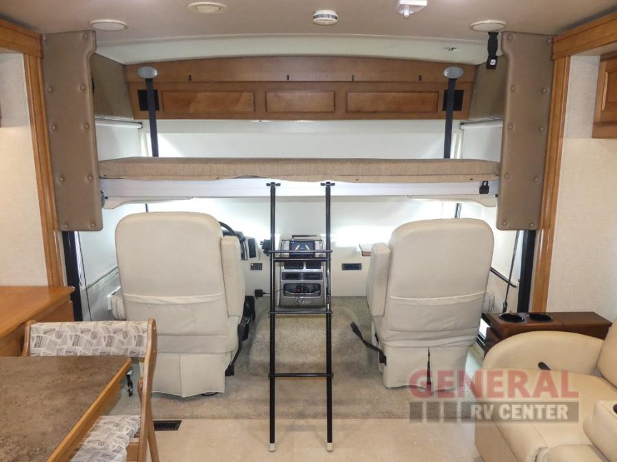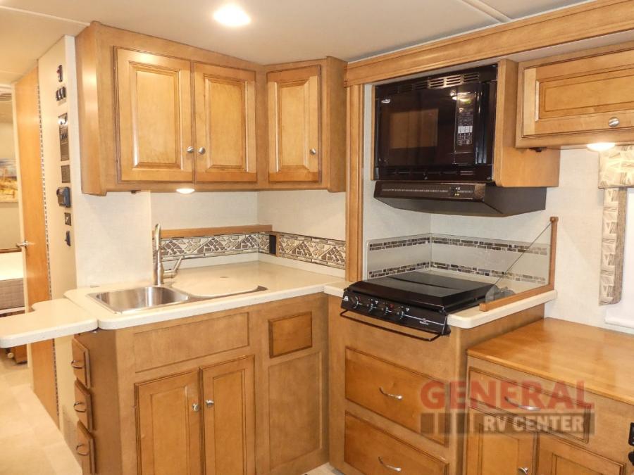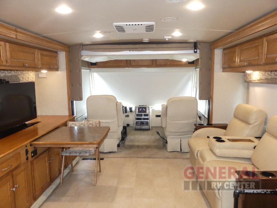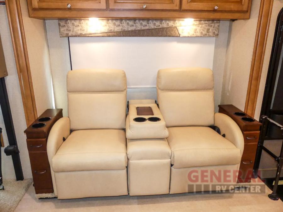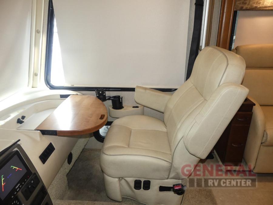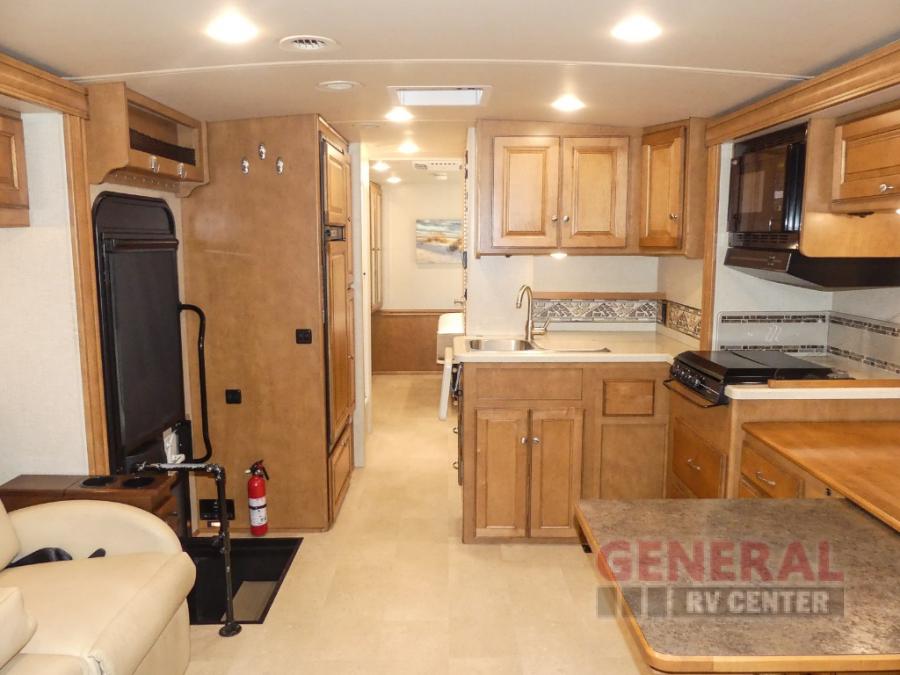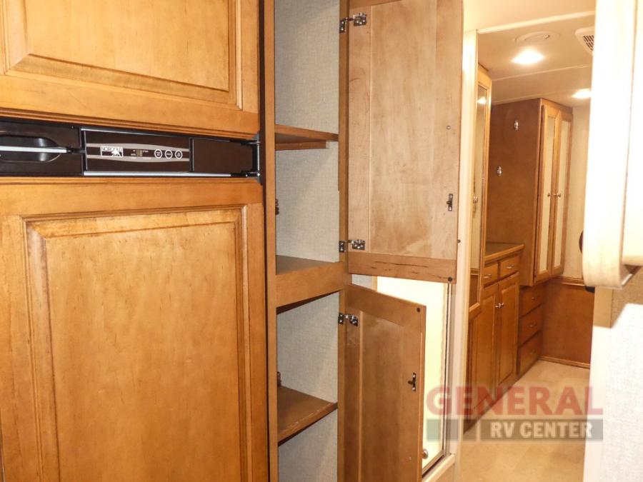 This class A coach features a wide open living area with dual opposing slides just behind the front cab seats that can swivel toward the rear for added seating. On the opposite side there is a slide out three burner range, and 42" x 74" booth dinette with seat belts. A refrigerator is located to the left of the entry door along with a pantry for storage, opposite the dinette slide is a double sink, plus overhead cabinets for storage.