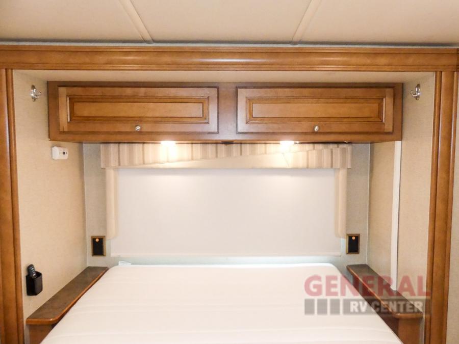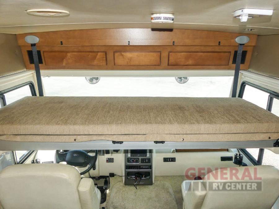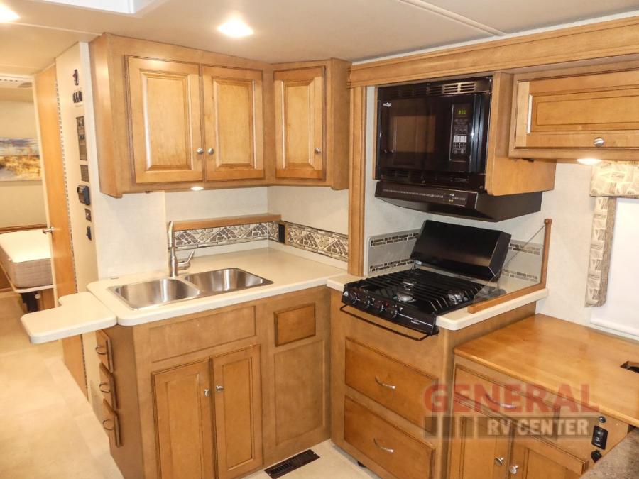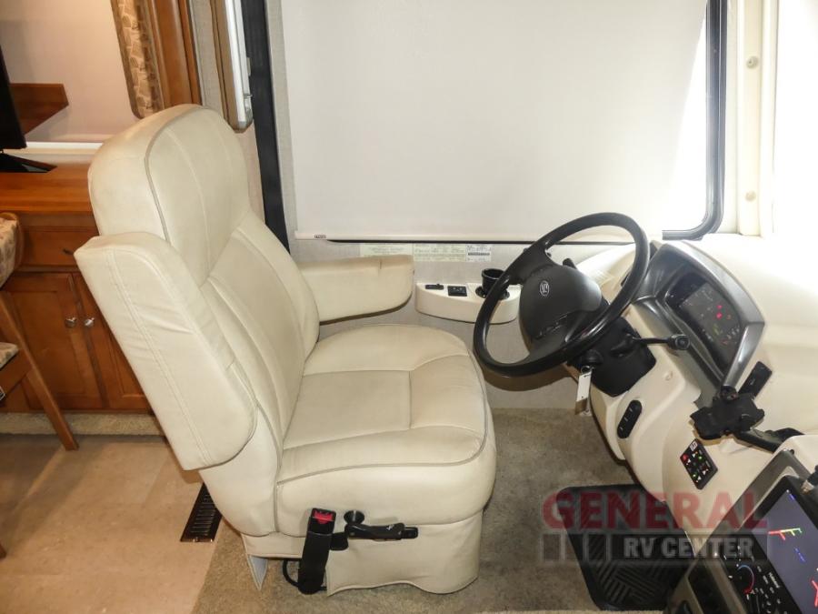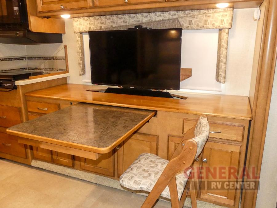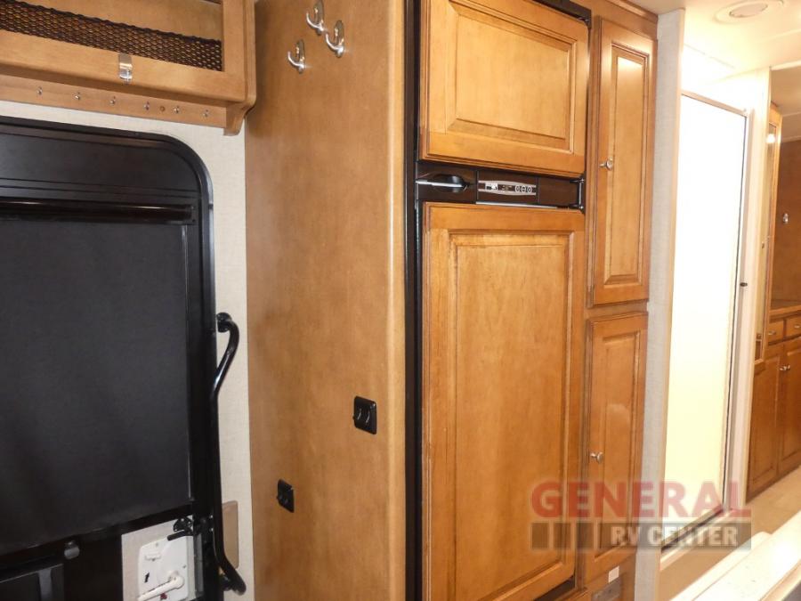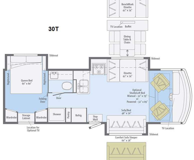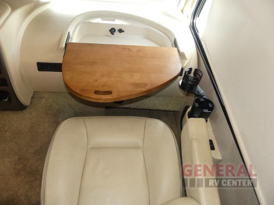 This class A coach features a wide open living area with dual opposing slides just behind the front cab seats that can swivel toward the rear for added seating. On the opposite side there is a slide out three burner range, and 42" x 74" booth dinette with seat belts. A refrigerator is located to the left of the entry door along with a pantry for storage, opposite the dinette slide is a double sink, plus overhead cabinets for storage.