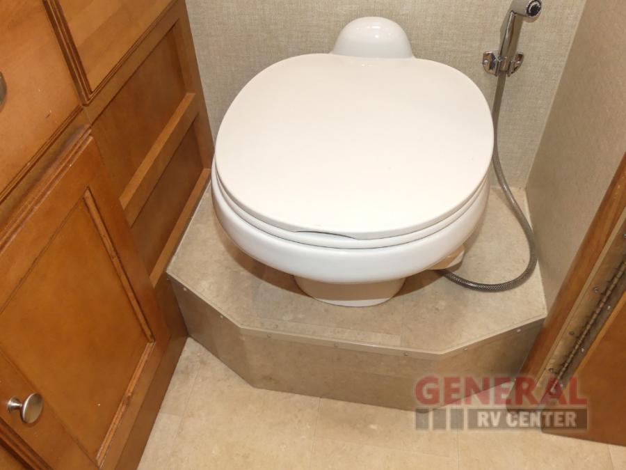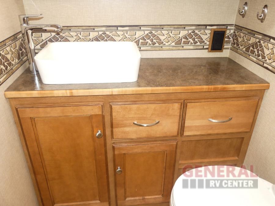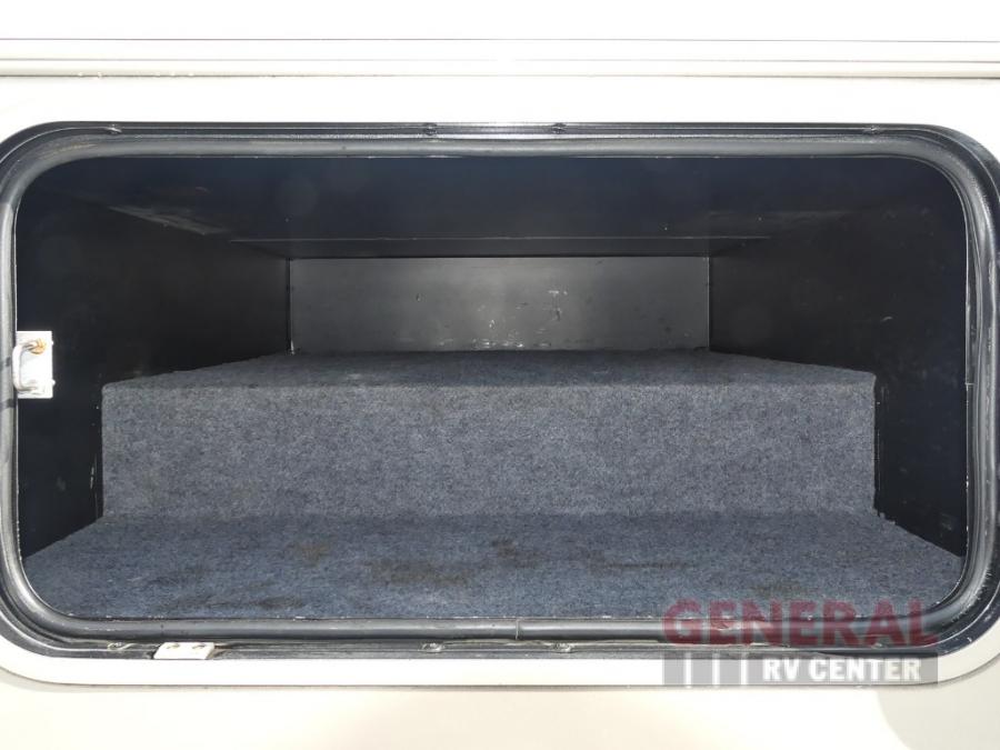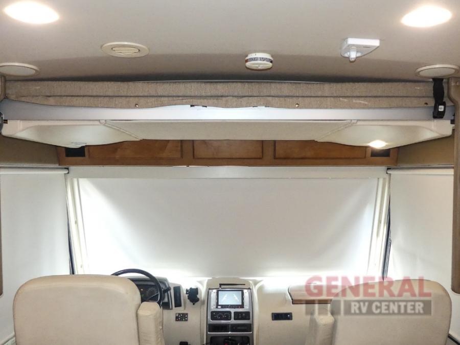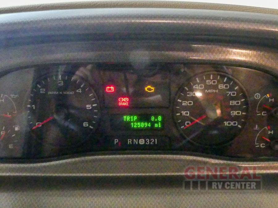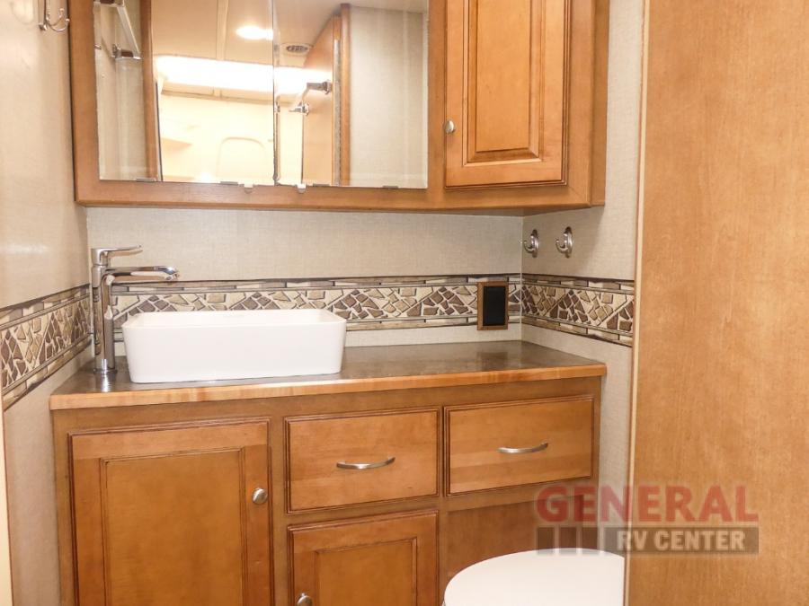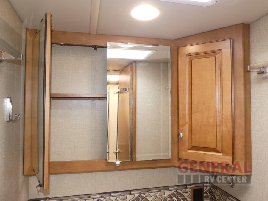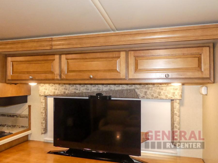This class A coach features a wide open living area with dual opposing slides just behind the front cab seats that can swivel toward the rear for added seating. On the opposite side there is a slide out three burner range, and 42" x 74" booth dinette with seat belts. A refrigerator is located to the left of the entry door along with a pantry for storage, opposite the dinette slide is a double sink, plus overhead cabinets for storage.