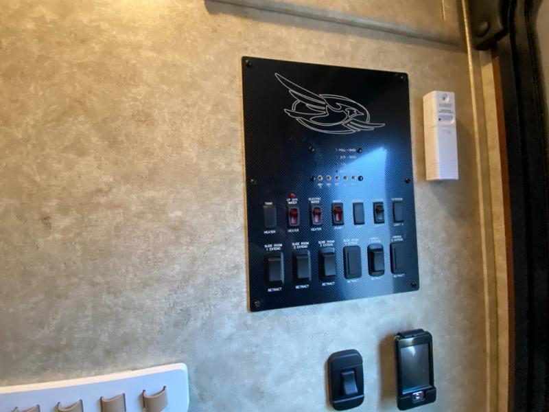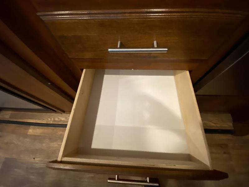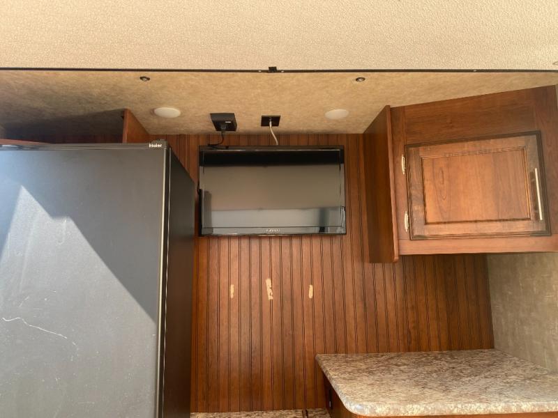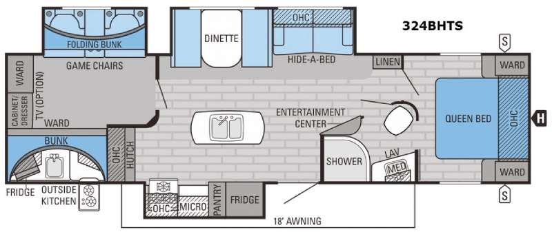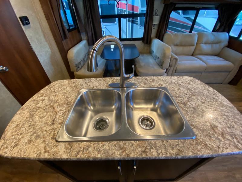 As you step inside to the left is a slide with a refrigerator, pantry, microwave, and three burner range. You will also find a hutch with overhead cabinets along one interior wall. The kitchen island has a double sink and extra countertop space. There is another slide in the kitchen/living area with a booth dinette and a hide-a-bed sofa with overhead cabinets. From the sofa and dinette you can easily view and enjoy the angled entertainment center.