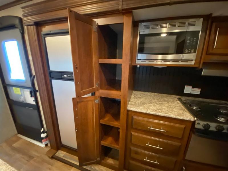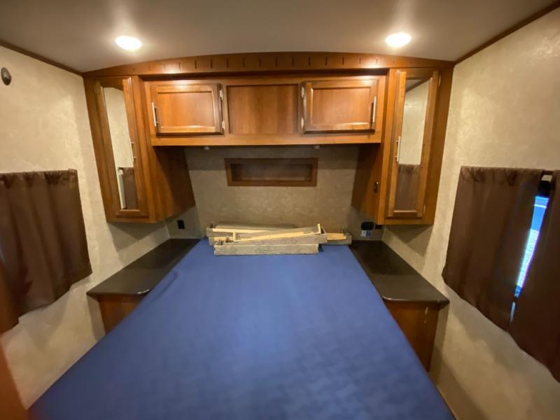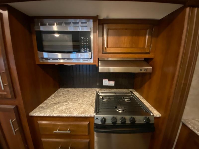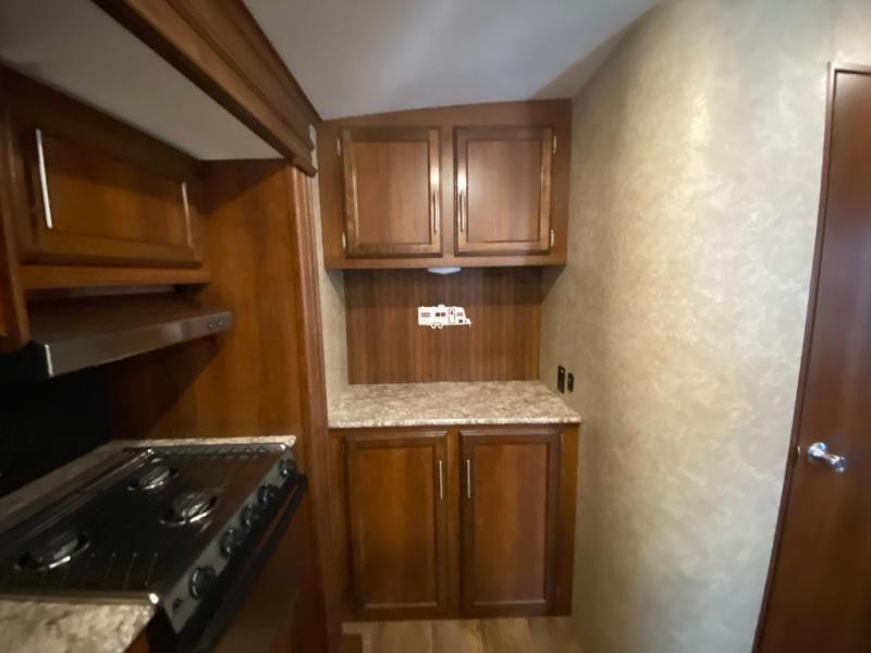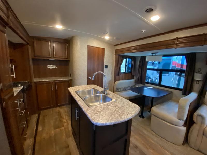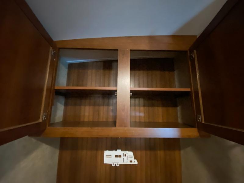 There are plenty of overhead cabinets throughout the travel trailer as well as outside storage. You can even enjoy the outside kitchen which has a refrigerator, sink, and two burner cooktop.