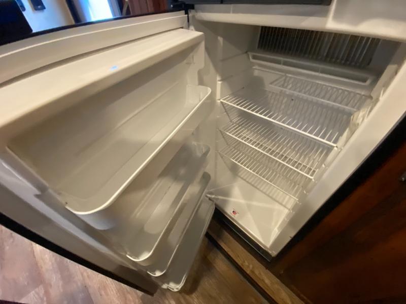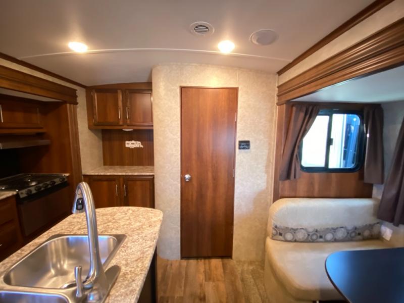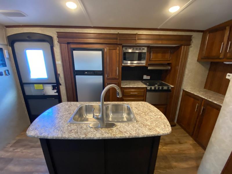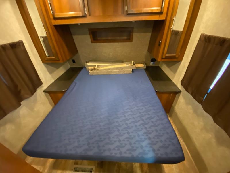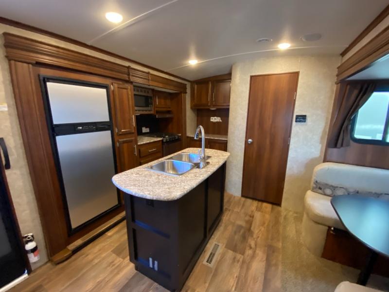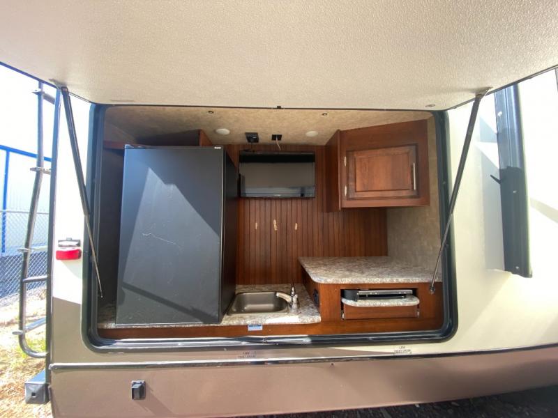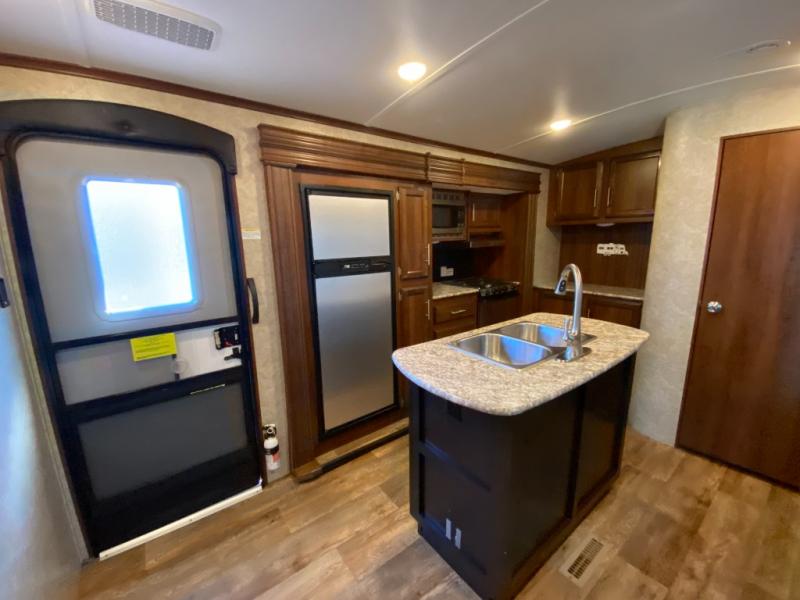 There are plenty of overhead cabinets throughout the travel trailer as well as outside storage. You can even enjoy the outside kitchen which has a refrigerator, sink, and two burner cooktop.