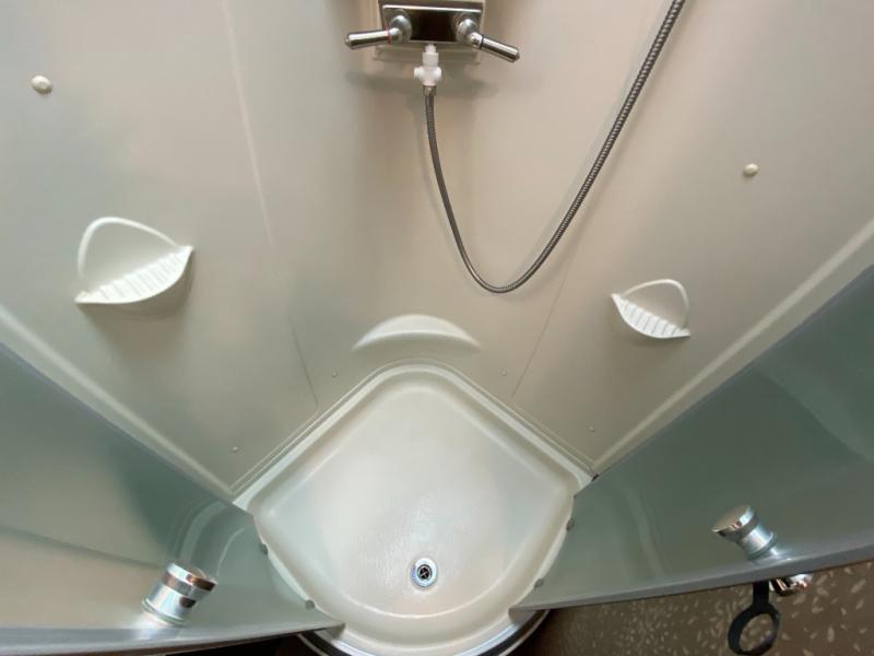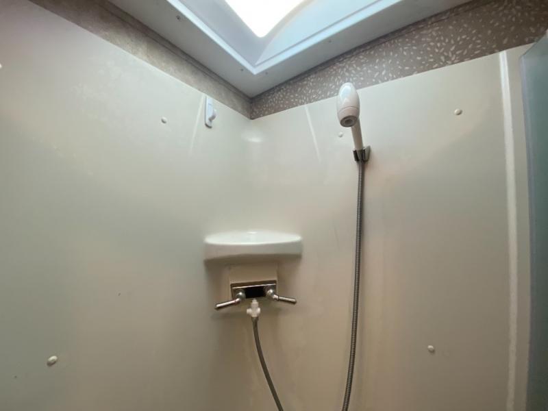 The side aisle bath offers an angled toilet, corner shower, sink, and medicine cabinet. There is linen storage outside the bathroom door. You are able to access the bathroom through the aisle door or the sliding bedroom door.