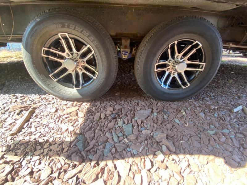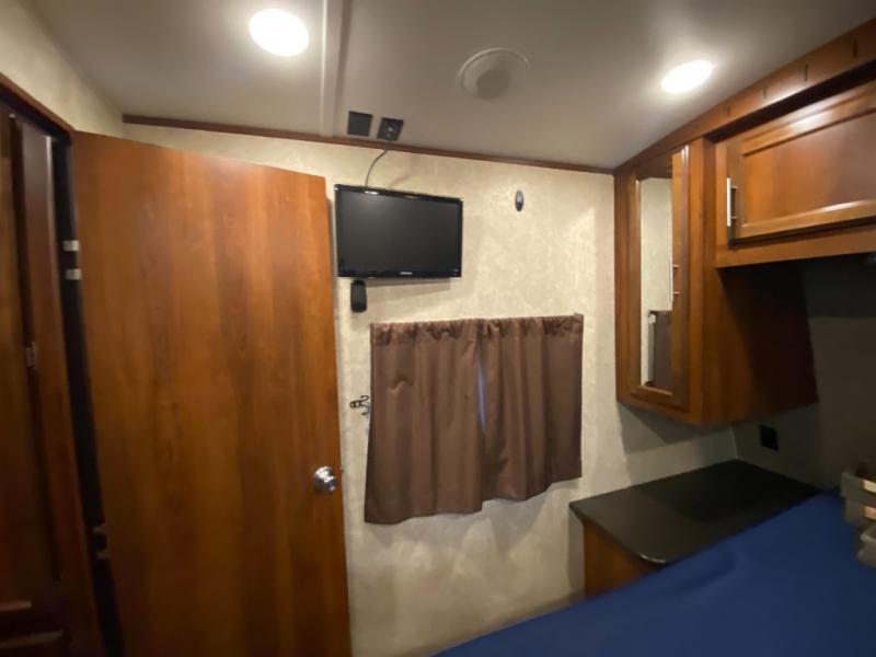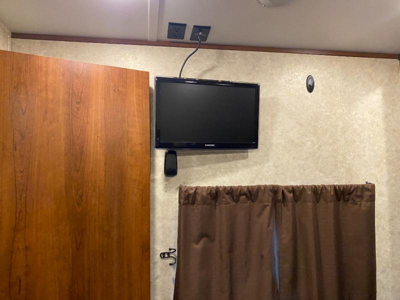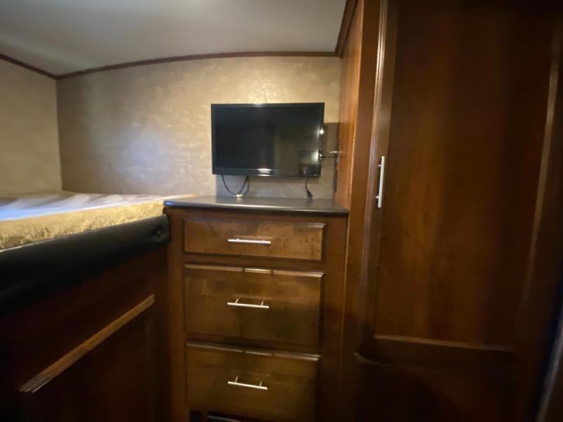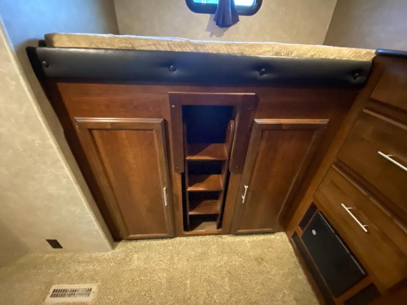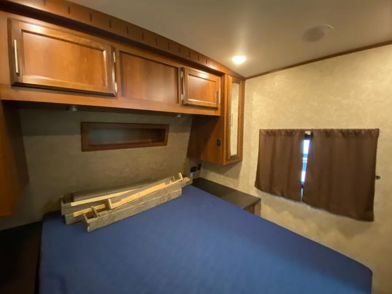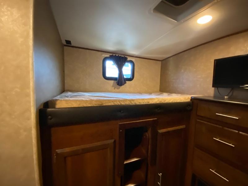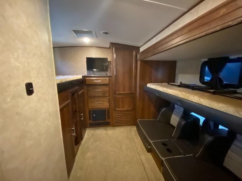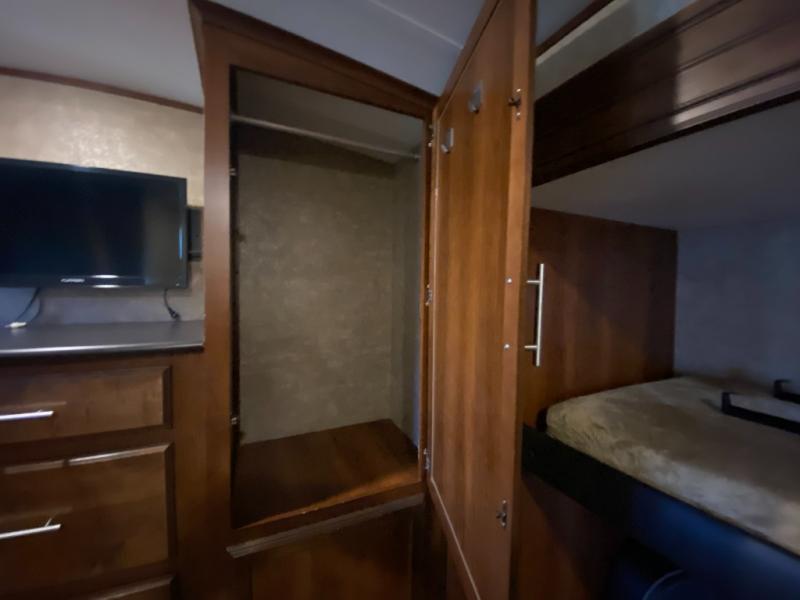 In the rear of the trailer, you will find the bunkhouse. There is a slide featuring game chairs below an upper bunk, a wardrobe, cabinet/dresser, and an additional wardrobe with a bunk above.