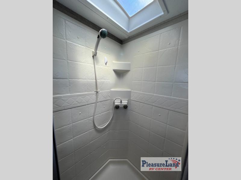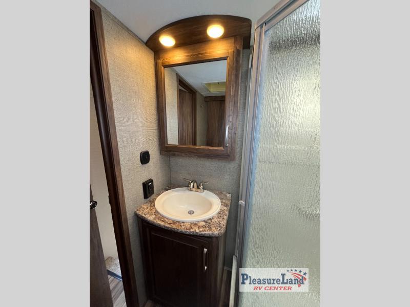Head up the steps in front to a side aisle bath and front bedroom. The bathroom features a neo-angled shower, sink, and toilet, plus a slide out linen cabinet that is found along with the bedroom wardrobe slide.