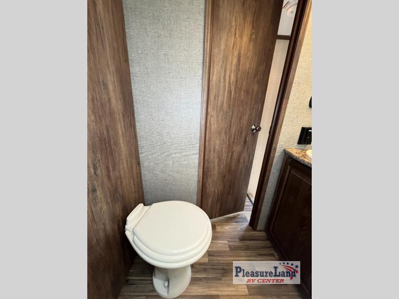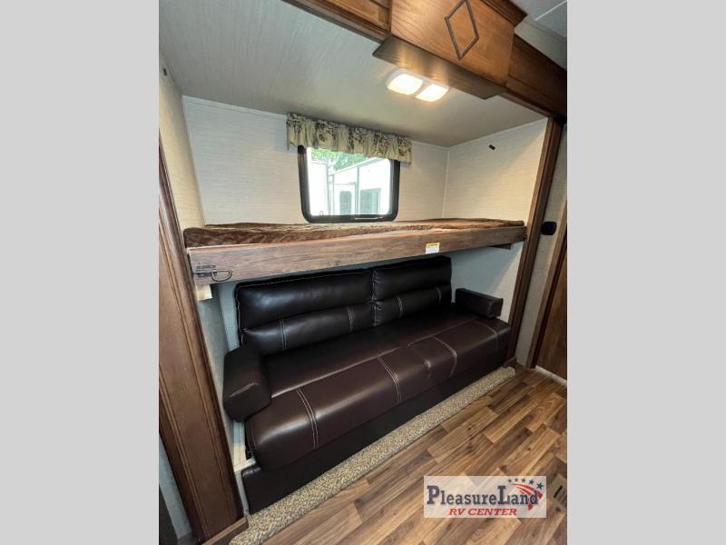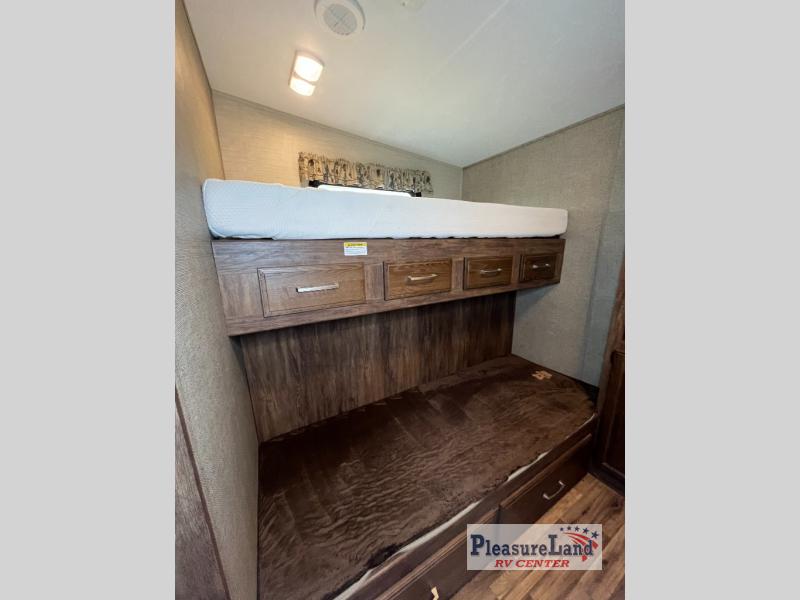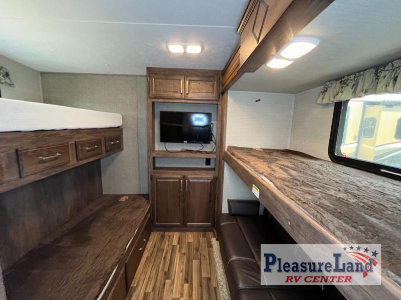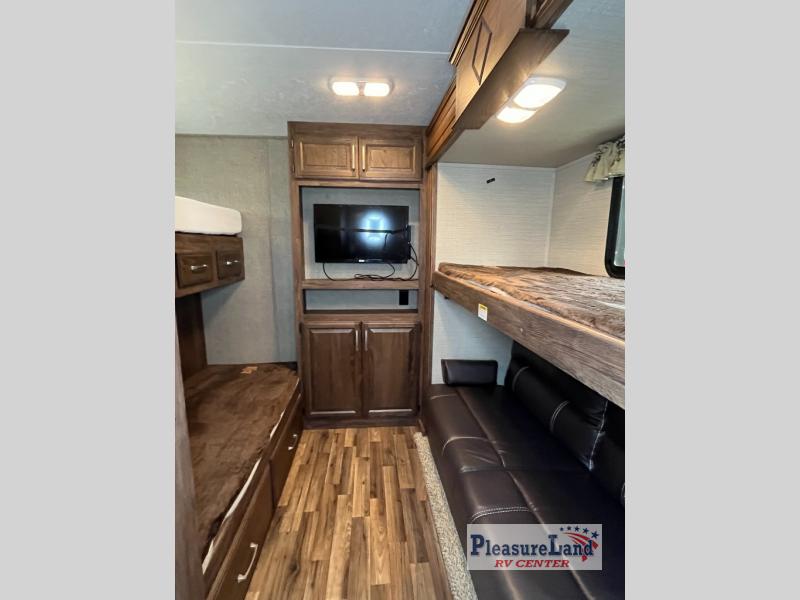 Back through the main living space head to the rear which is where you will most likely find the kids hanging out. There is a slide out jack knife with flip-up bunk above on the right, and a set of bunks on the left. Straight ahead through the bunkhouse door you will see an entertainment center with 32" TV. There is also a wardrobe just inside the door on your left for storage needs, as well as drawers beneath the bunks, and beneath the TV area too.