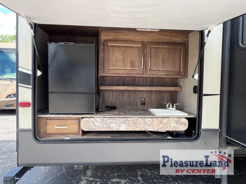 On the outside you will find a rear outdoor kitchen that the chef in the family will love. There is a refrigerator, single sink, plus overhead storage, and so much more!