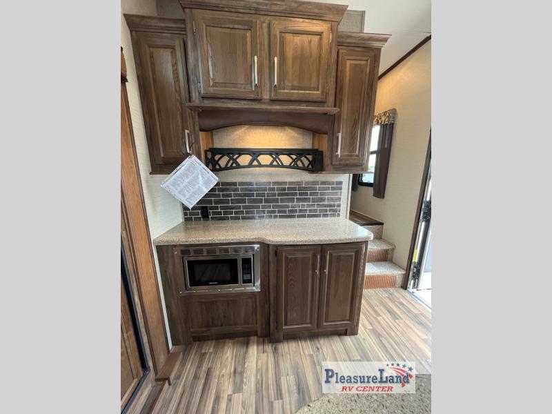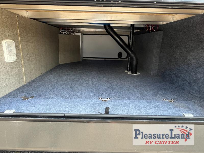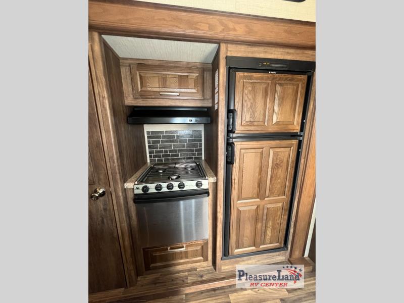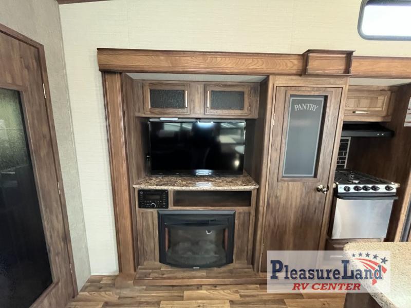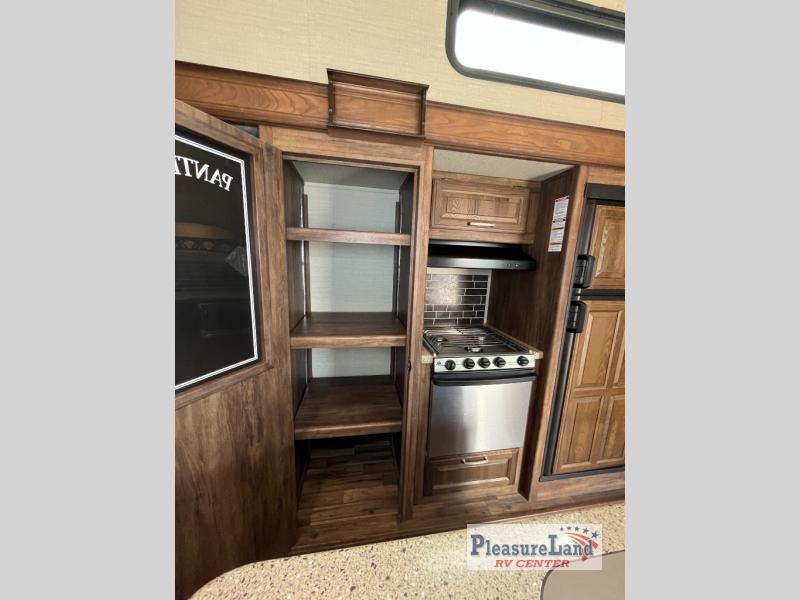 Step inside and see a wide open space with storage straight ahead. There are overhead cabinets, plus lower cupboards as well as a counter space. In the center find an island with more food prep space plus the location of the double kitchen sink. Behind it, find a refrigerator, three burner range with overhead microwave oven, and walk-in pantry with decorative glass top door. This all slides out along with a living area entertainment center including a 40" TV, plus overhead storage, and optional fireplace below.