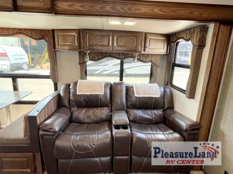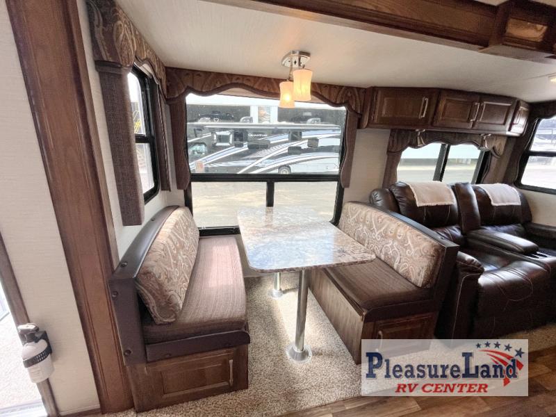 On the opposite side to the left of the main entry door find a booth dinette and tri-fold sleeper sofa slide. This provides ample seating and also additional sleeping space when you have added guests. You can also choose the optional theater seating in place of the sofa if you like.