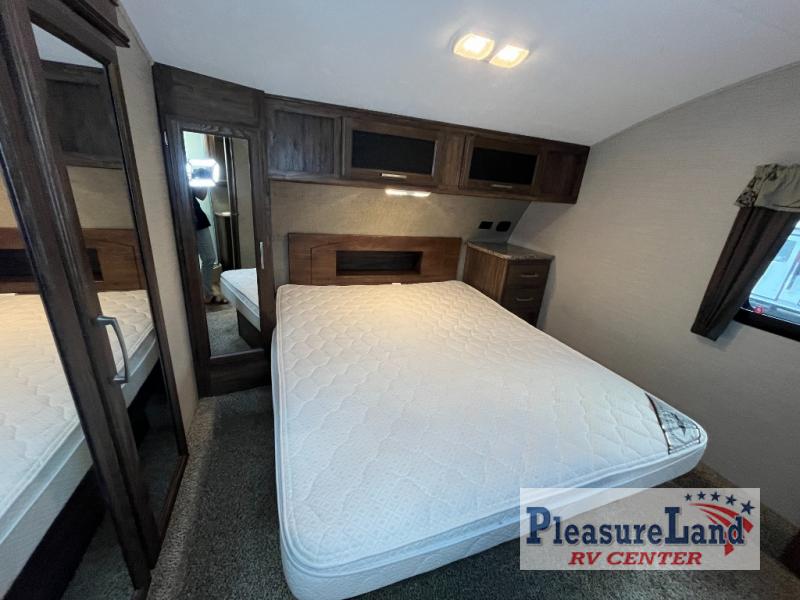 You can enter the front master bedroom through the bathroom, or from a private hallway door. Inside enjoy a comfortable nights sleep on a queen size bed with a nightstand on one side and wardrobe on the other. There is also overhead storage in addition to the slide out wardrobe that is connected to the bathroom linen slide as well.