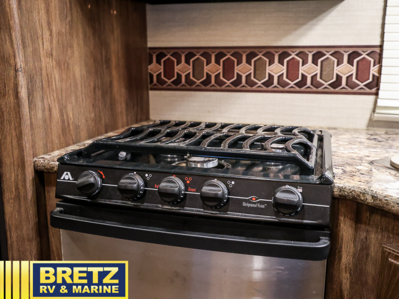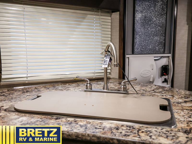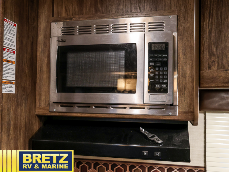 As you step inside you are greeted with an inviting living area including two recliners with an end table and overhead storage space. There is a tri-fold sleeper sofa and booth dinette slide out for plenty of seating during mealtimes and just hanging out. Plus, both can be quickly converted to sleeping space for family or guests. A nearby entertainment center can be easily viewed from anywhere in the room.