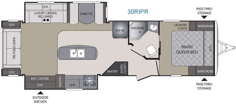 Step inside this Premier Ultra Lite travel trailer 30RIPR by Keystone RV. It features a rear living layout, double slides, luxury cinema recliners, and a convenient kitchen island.