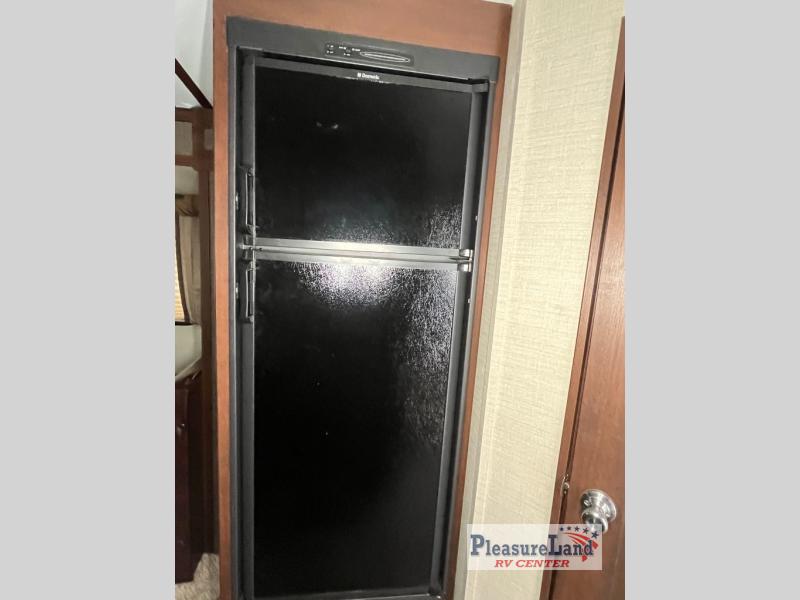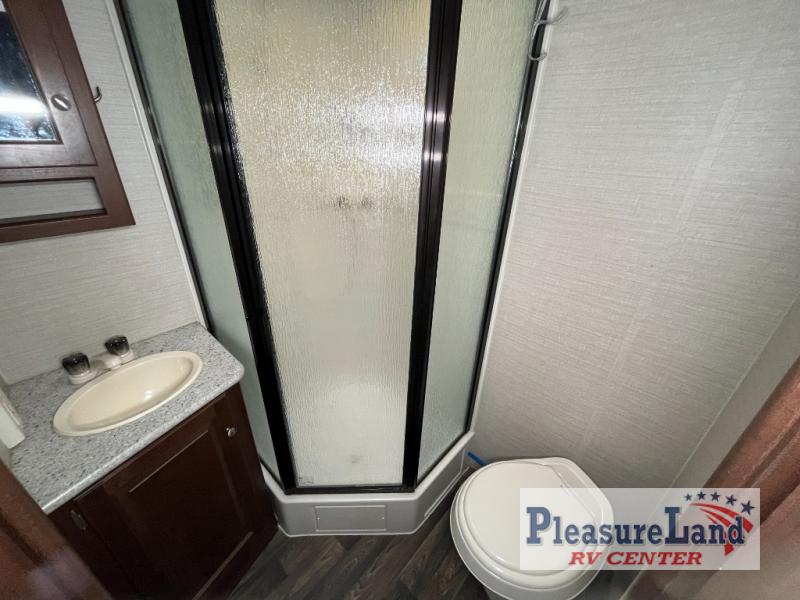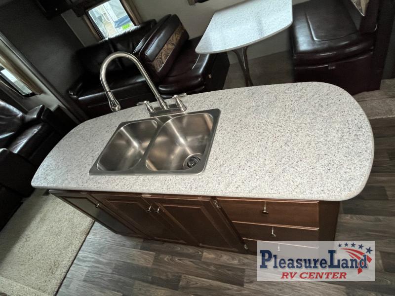 On the road side, you will find luxury cinema recliners for two, and a booth dinette slide. The refrigerator is located just off the slide near the booth dinette. There is also a convenient island in the middle that features a double kitchen sink for clean up and extra counter space for prep work.