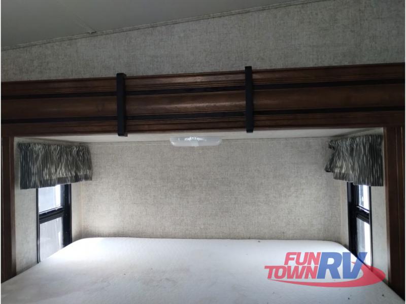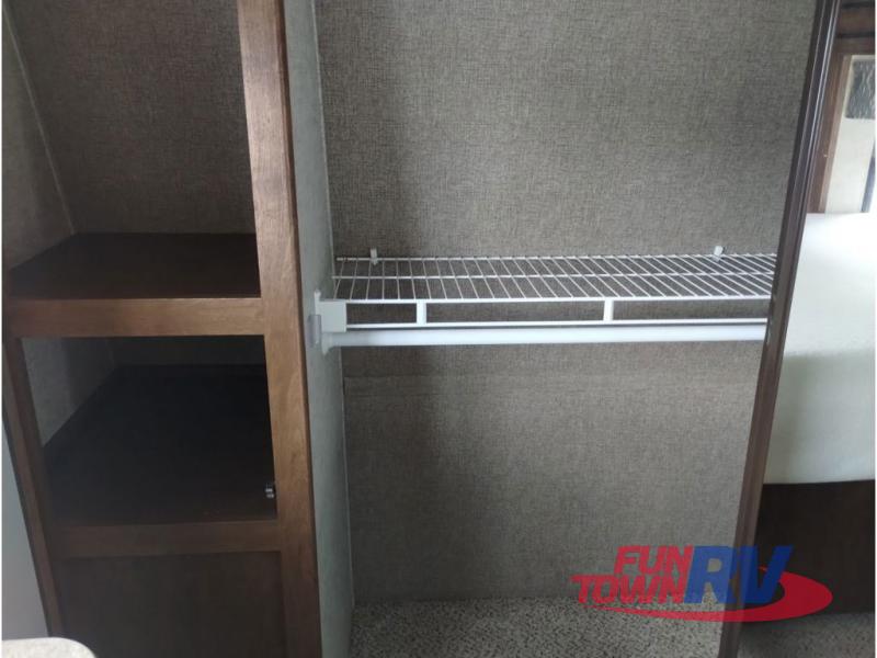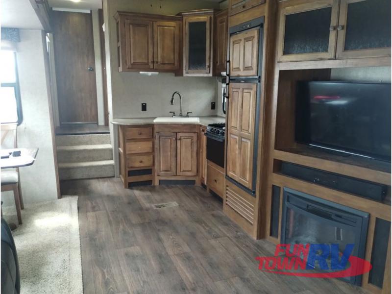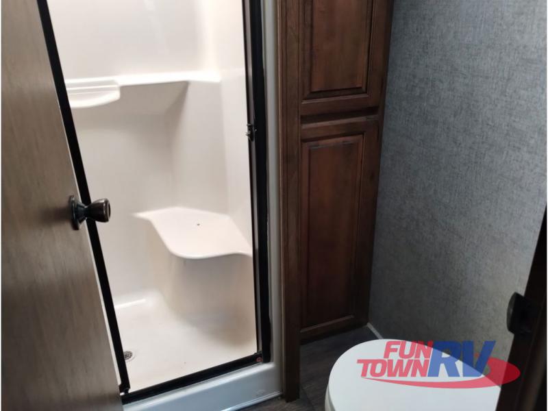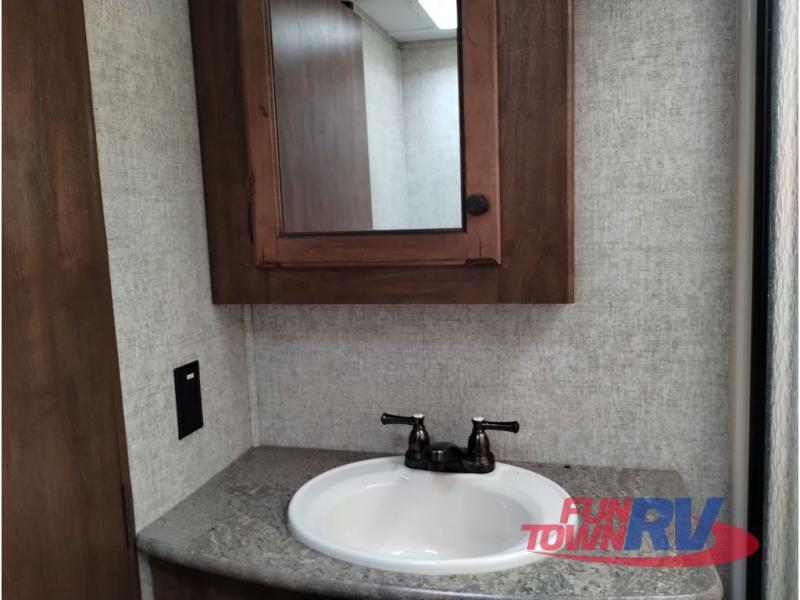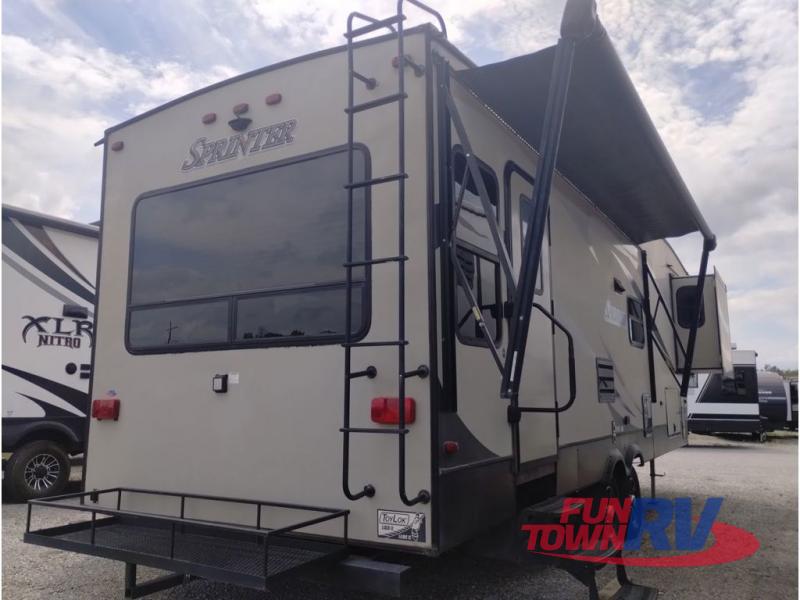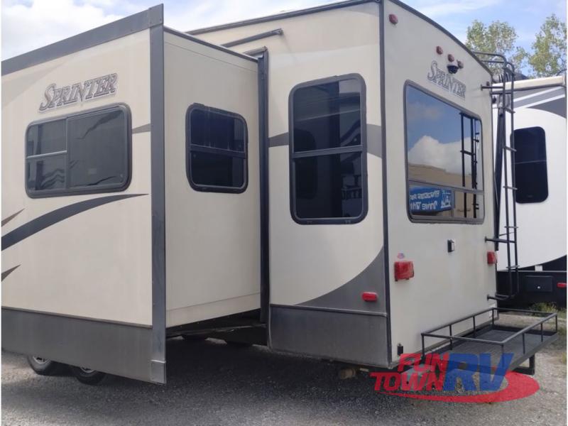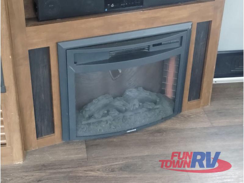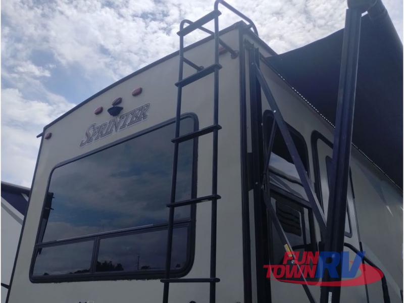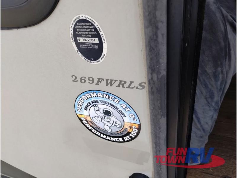 This Sprinter fifth wheel model 269FWRLS features a wide body design with an 8'4" width for added space. You will enjoy a rear living layout, double slides with the living area slide being 42" deep, and a fireplace also!