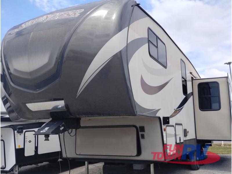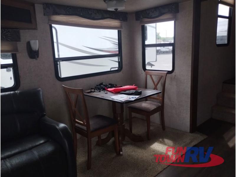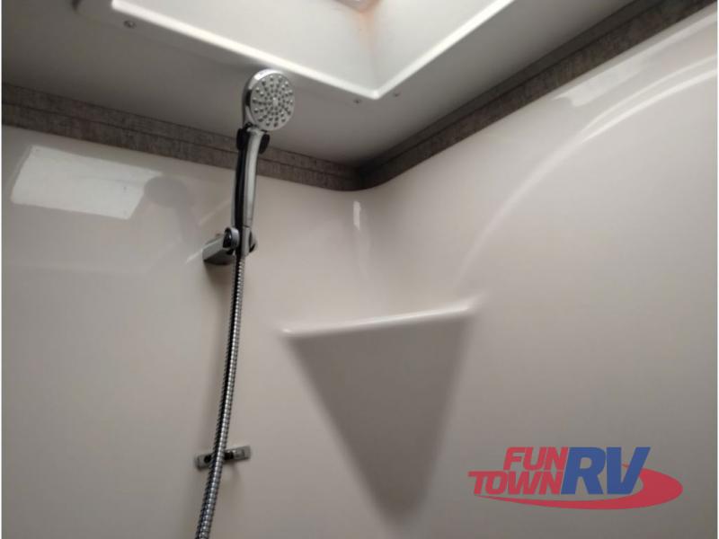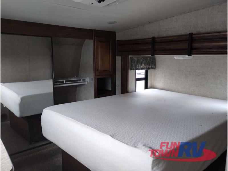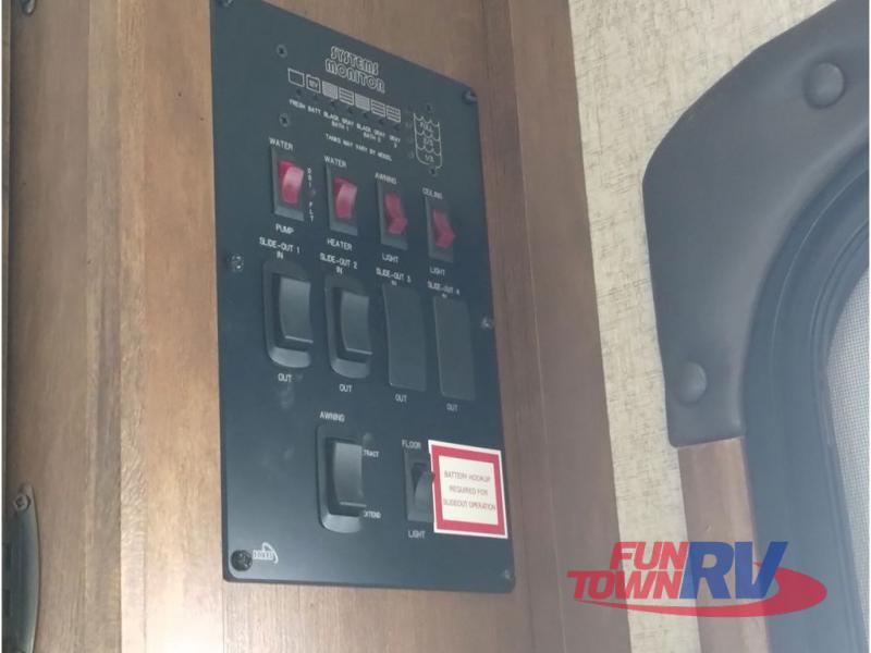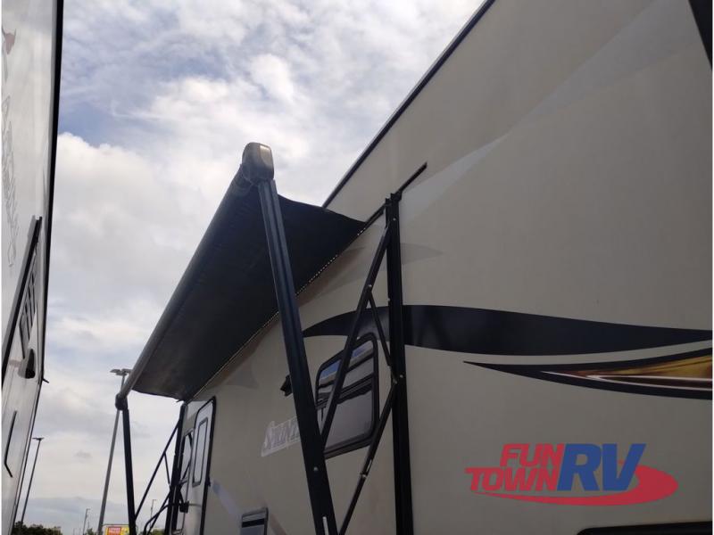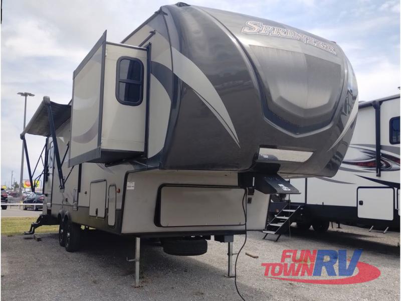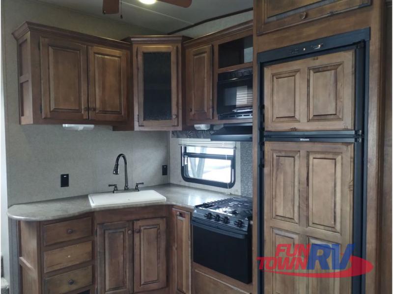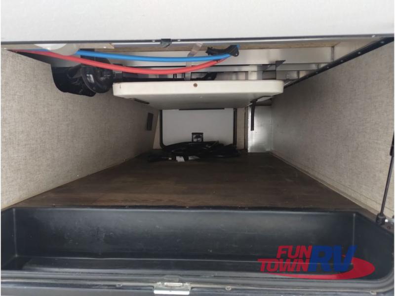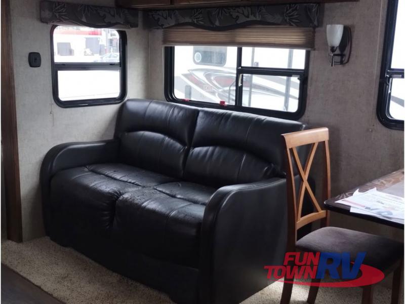 This Sprinter fifth wheel model 269FWRLS features a wide body design with an 8'4" width for added space. You will enjoy a rear living layout, double slides with the living area slide being 42" deep, and a fireplace also!