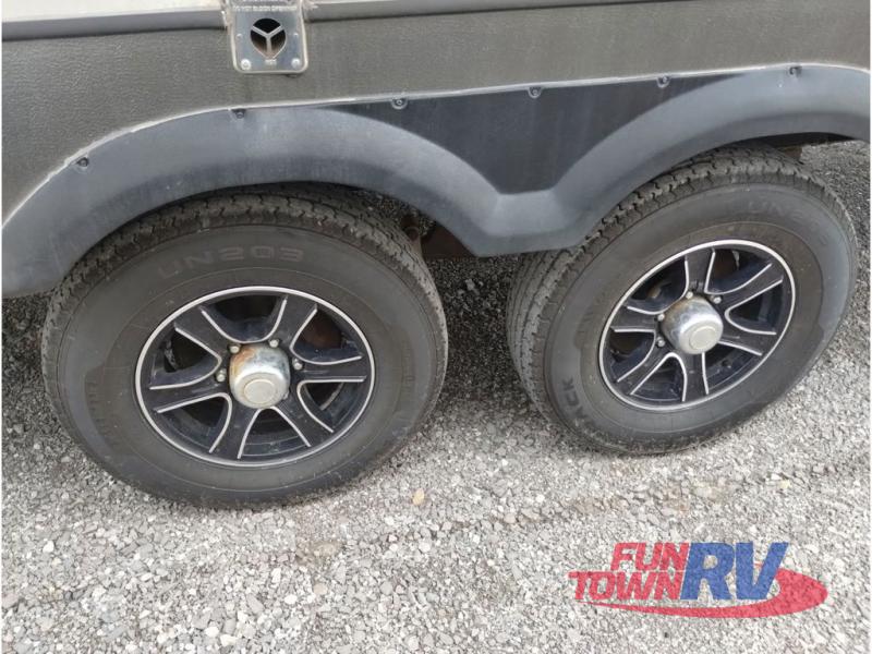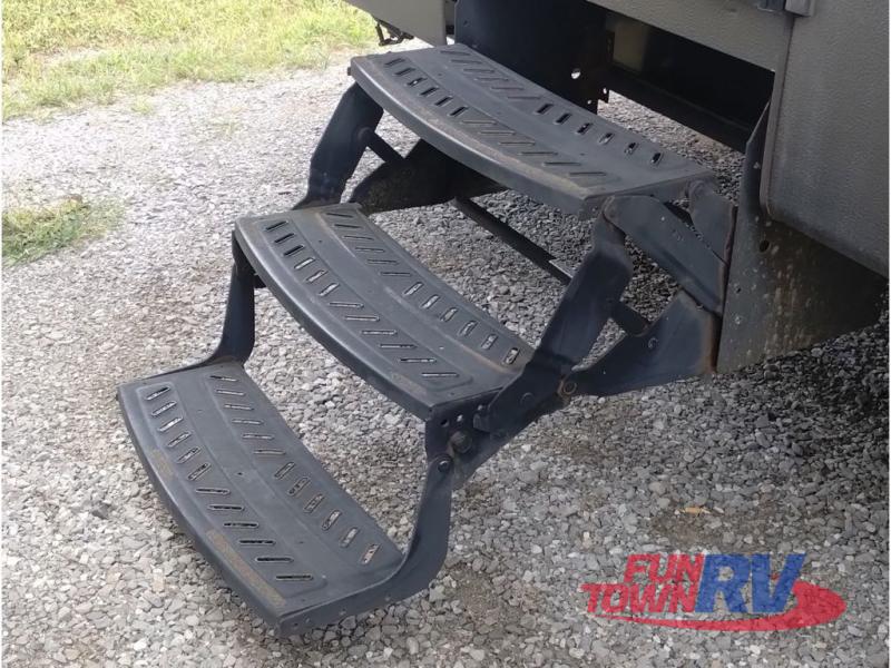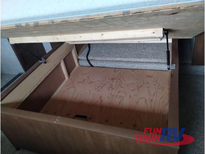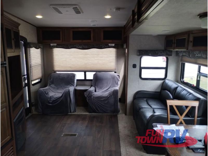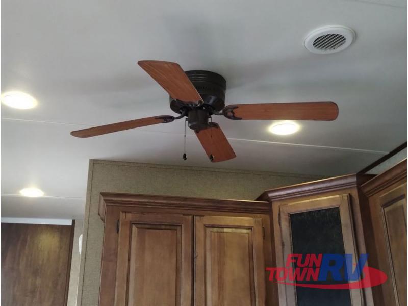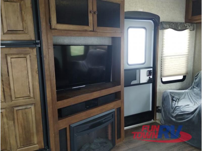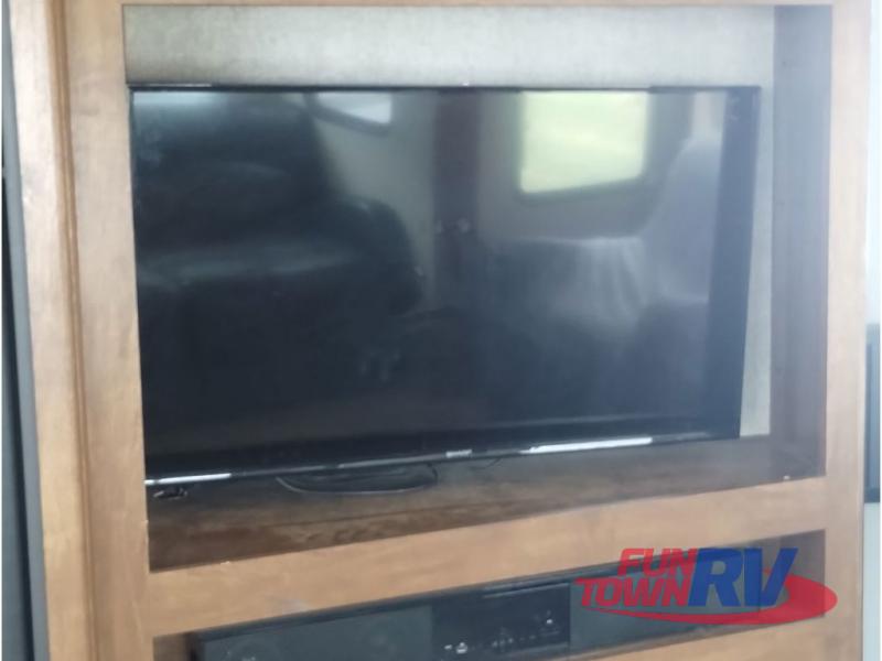 Step inside and be greeted by a wide open living area featuring two swivel rocking chairs along the rear wall that also includes a end table and overhead storage cabinets. You can choose two optional rocker recliners instead. There is a tri-fold sleeper sofa and booth dinette slide opposite the door side. Enjoy the entertainment center featuring a 40" TV and fireplace just to the right of the entry door for your inside camping days.