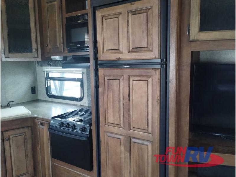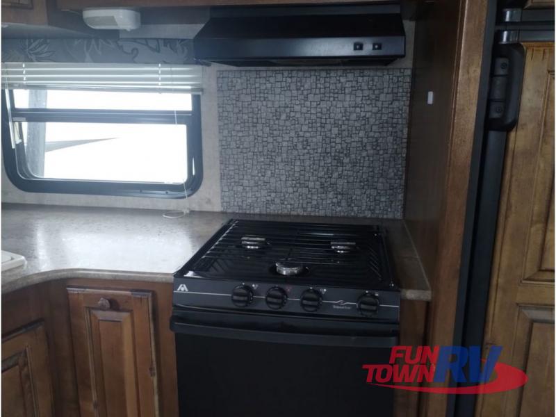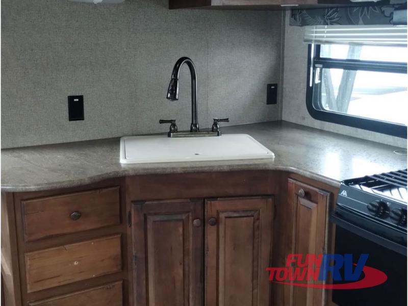 The kitchen features everything needed to create meals and snacks while away from home. There is a refrigerator, three burner range, a counter space for food prep, and a large kitchen sink. You will also find plenty of overhead storage for dishes and things.