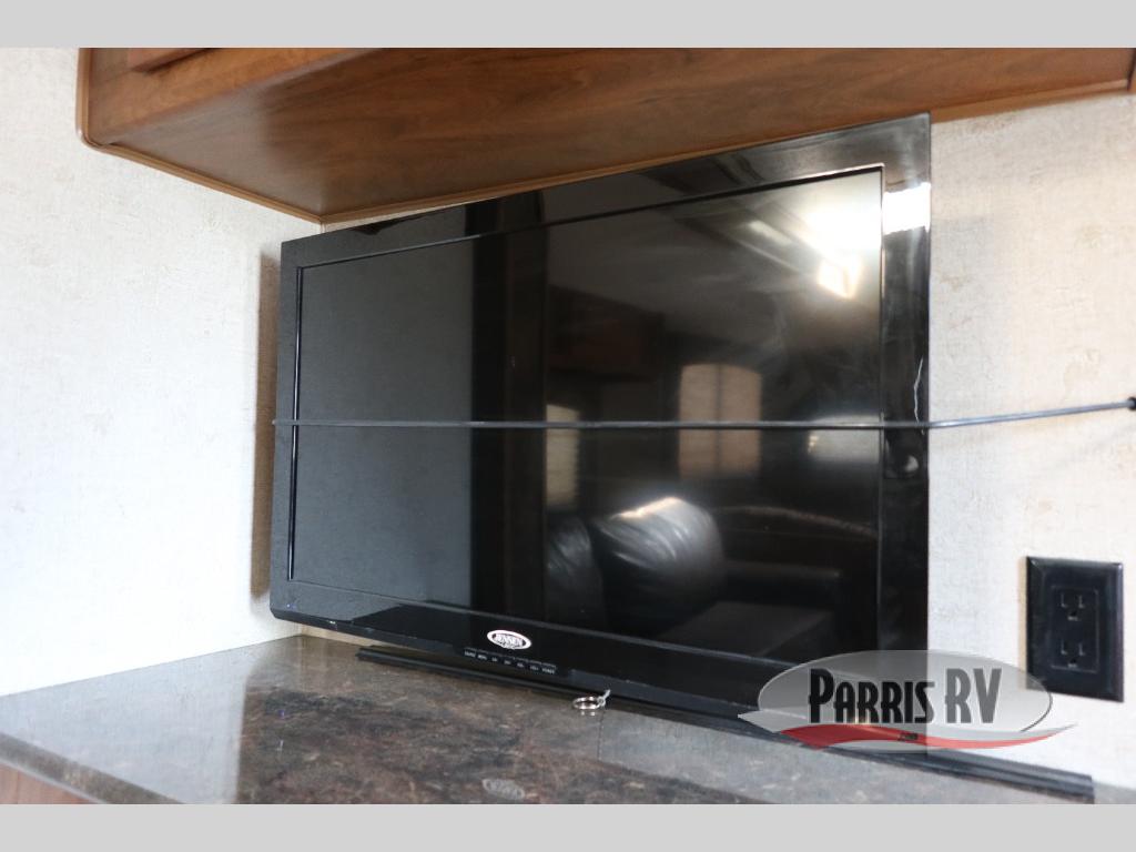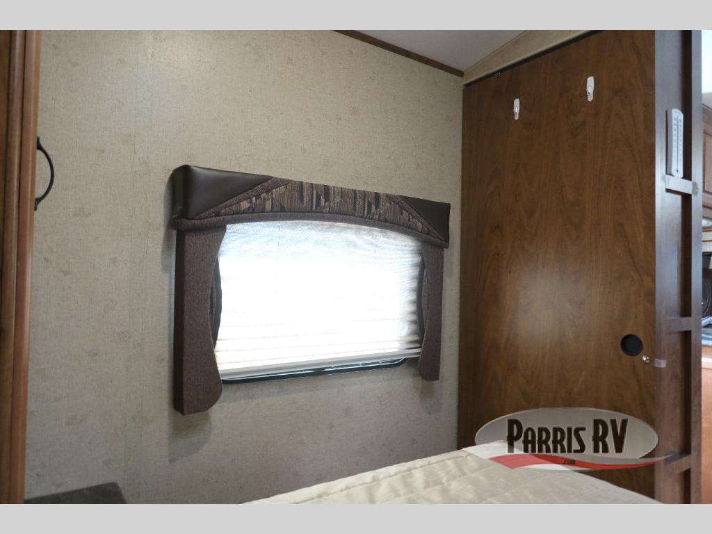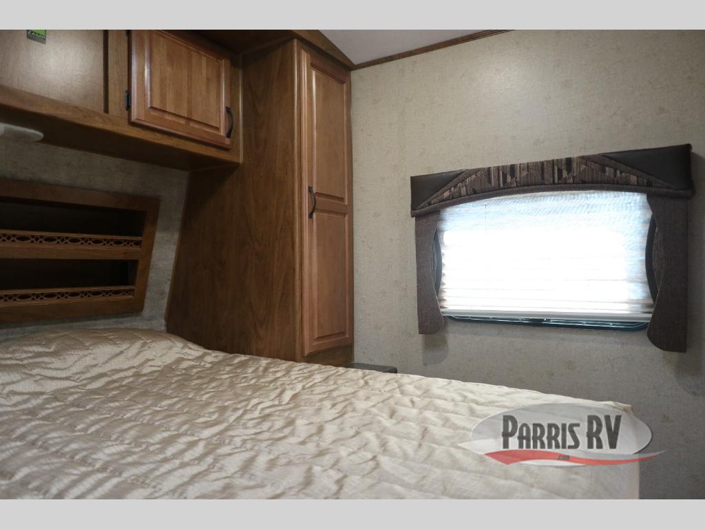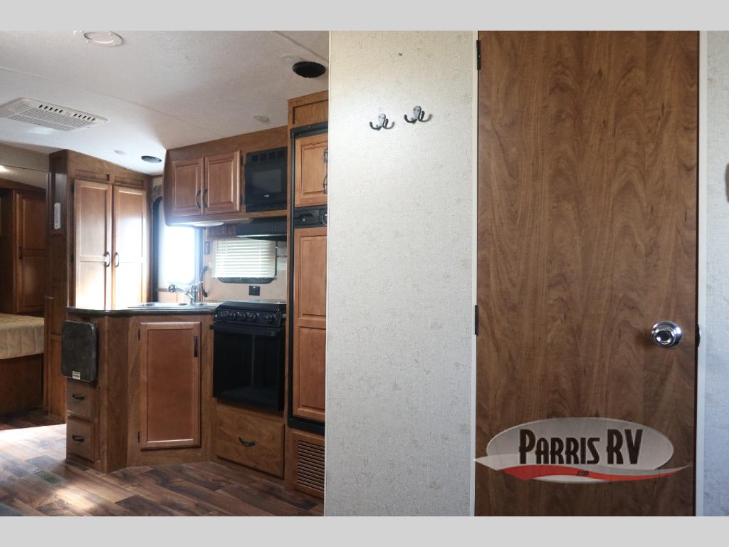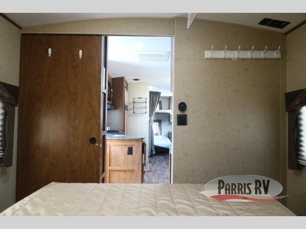 As you enter through the front entry of the travel trailer, to your right along the outside of the bedroom wall you will find a wardrobe and a pantry. Beyond the bedroom door, you find an entertainment center with a TV.