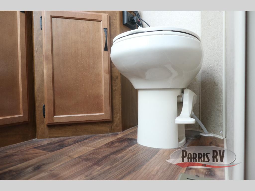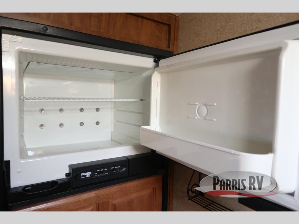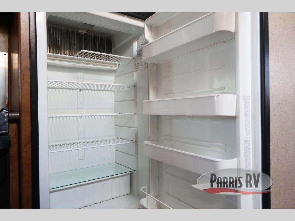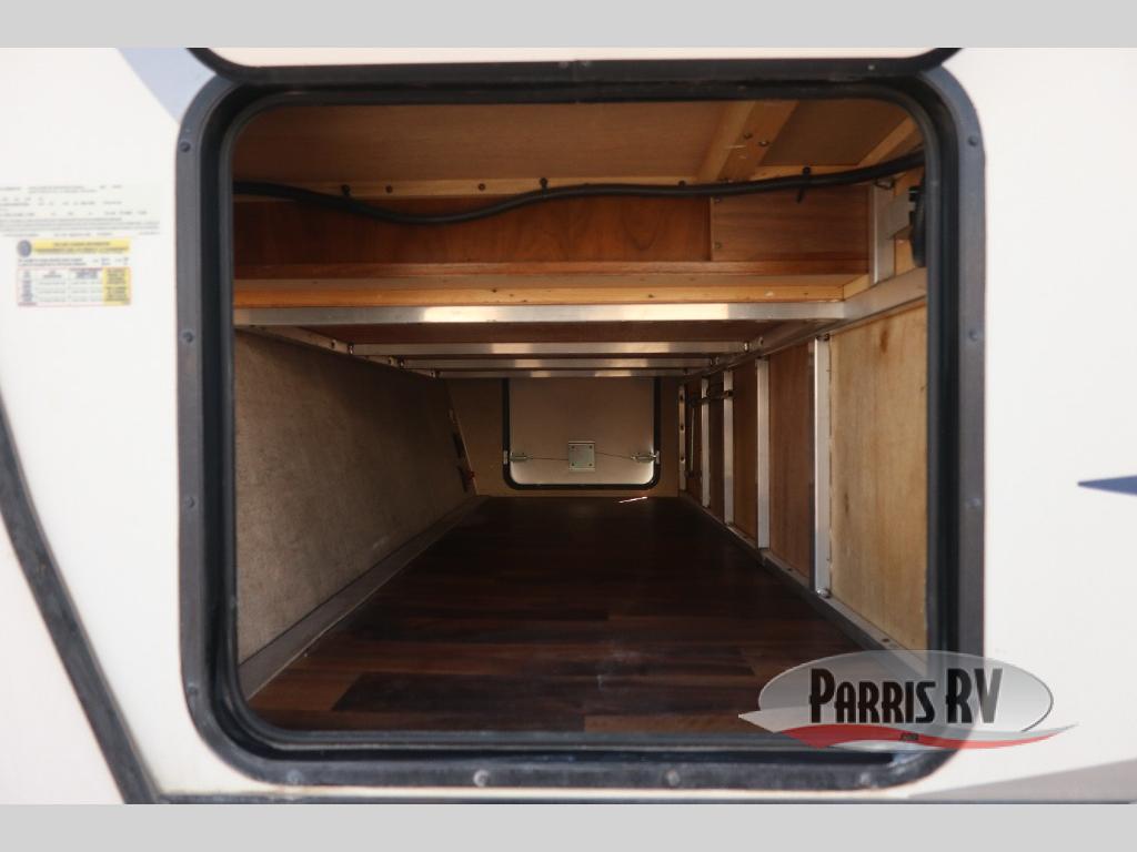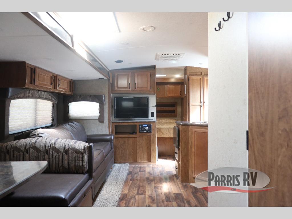 As you enter through the front entry of the travel trailer, to your right along the outside of the bedroom wall you will find a wardrobe and a pantry. Beyond the bedroom door, you find an entertainment center with a TV.