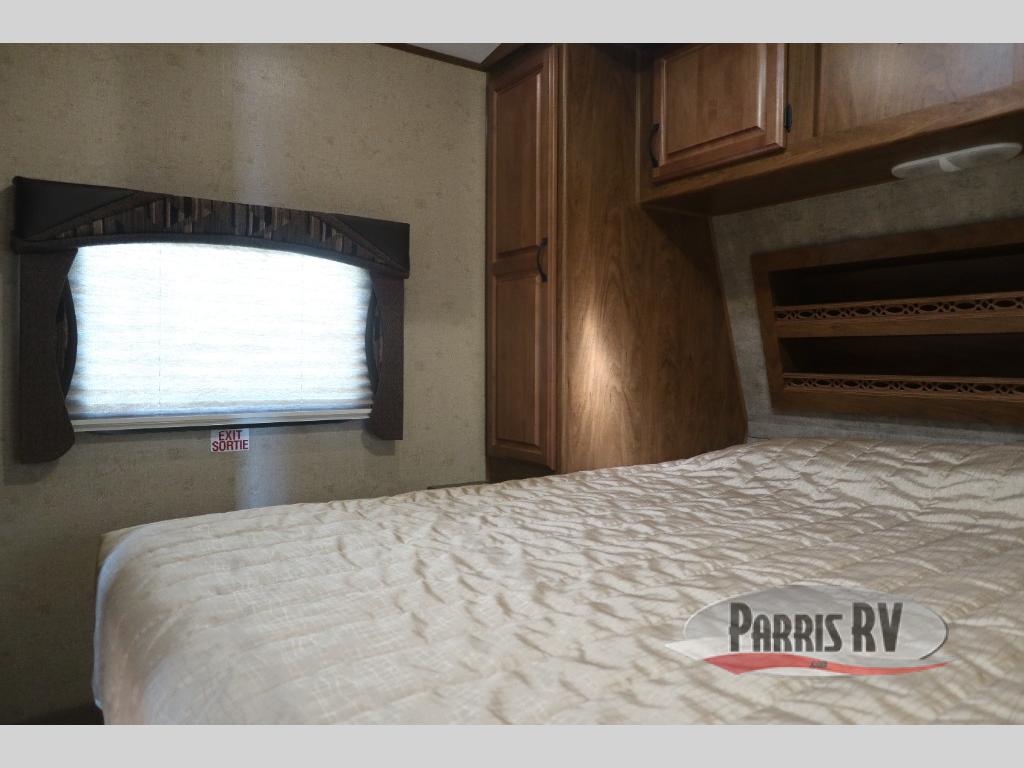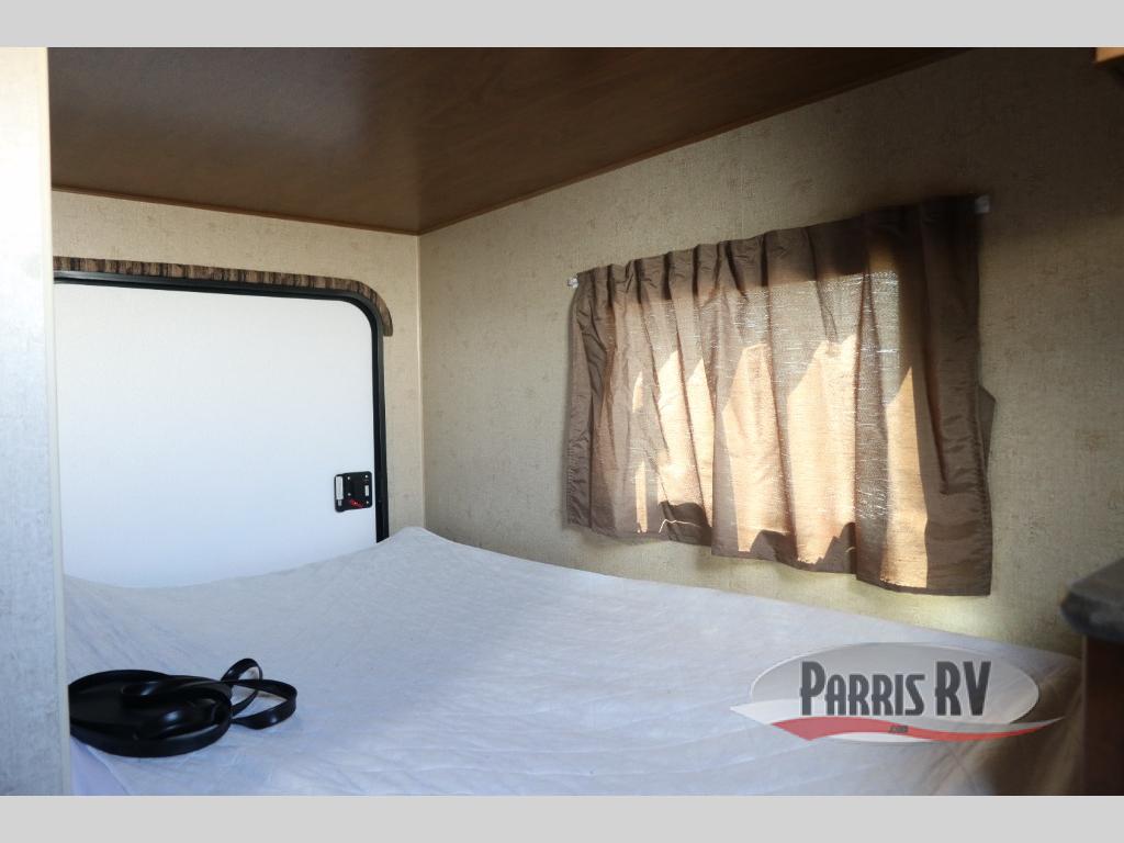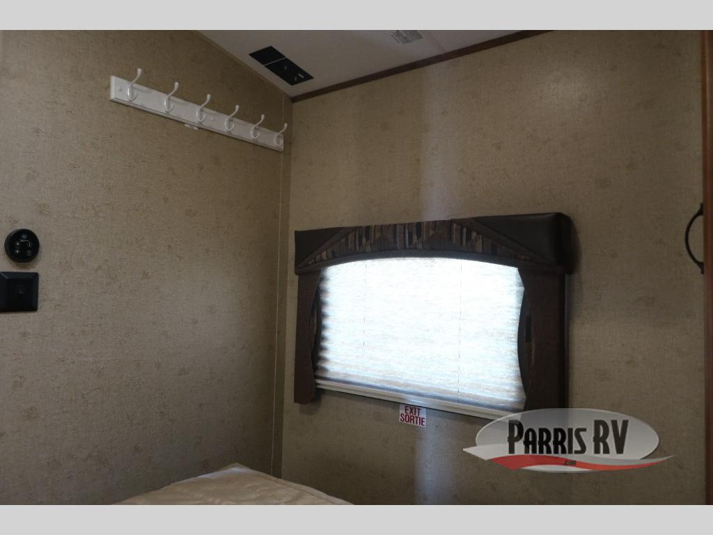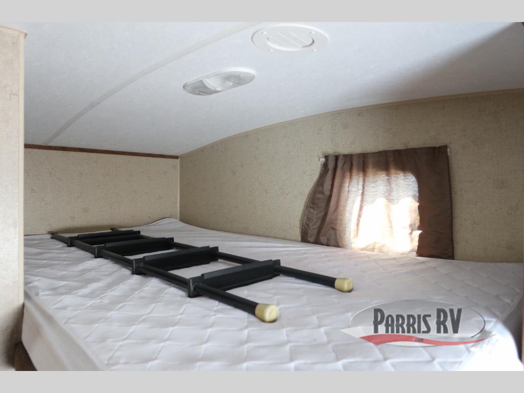 Near the rear of the trailer, there is an entry/exit door on the road side within the bunk house area. There is a curtain for some privacy in the bunk house as well as a wardrobe and nightstand, a bunk ladder and generous 42" x 74" upper and lower bunk beds. The lower bunk will even fold up for extra storage area access.
