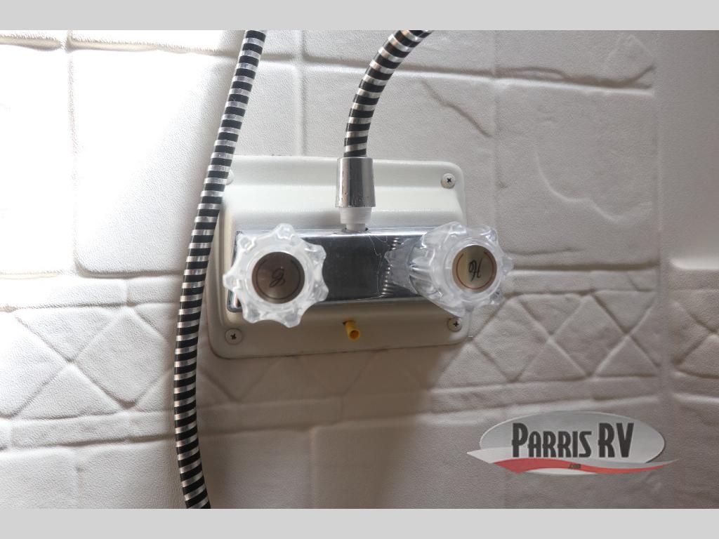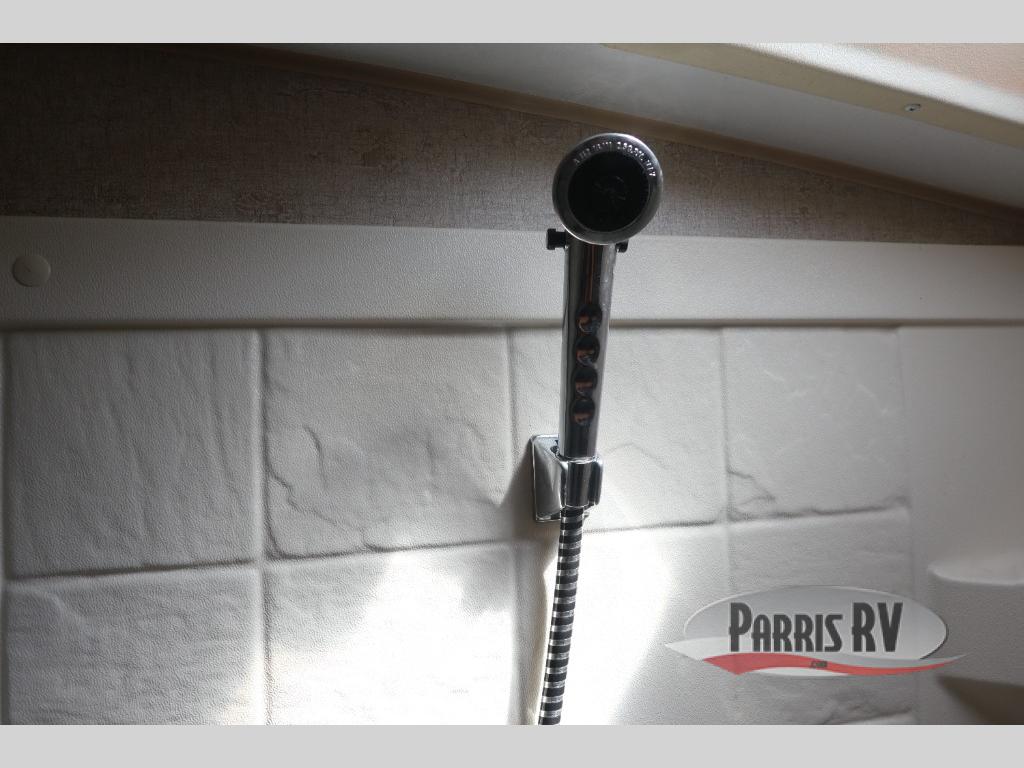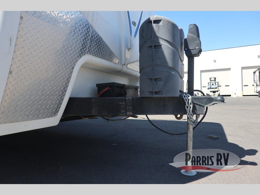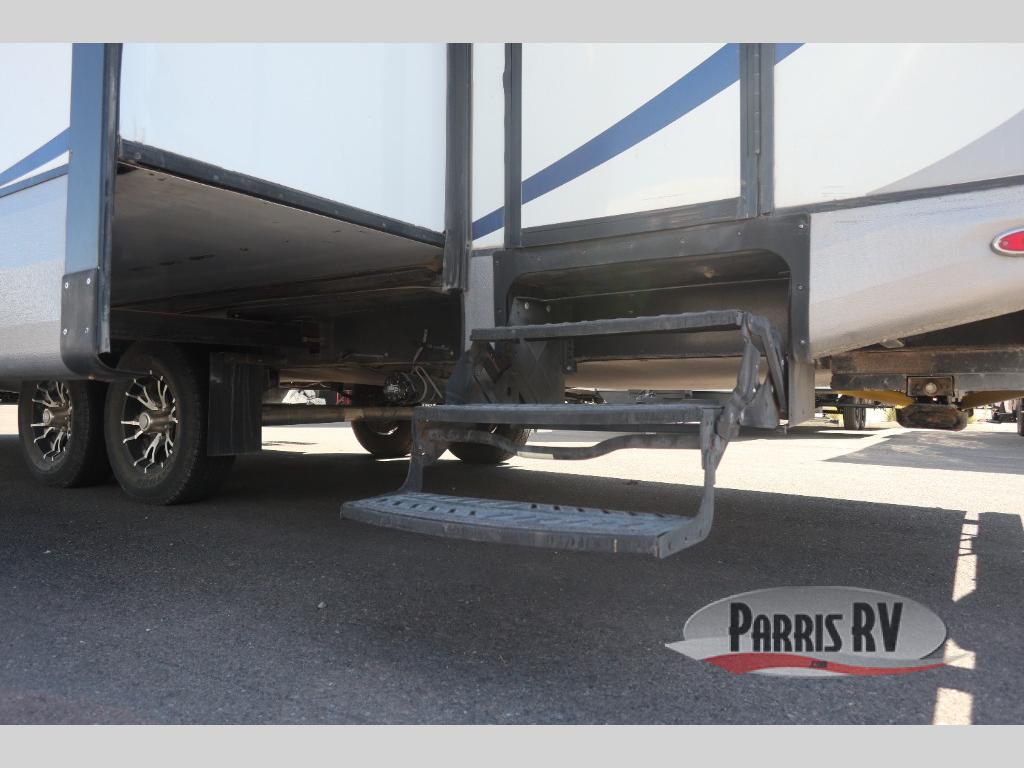 Near the rear of the trailer, there is an entry/exit door on the road side within the bunk house area. There is a curtain for some privacy in the bunk house as well as a wardrobe and nightstand, a bunk ladder and generous 42" x 74" upper and lower bunk beds. The lower bunk will even fold up for extra storage area access.