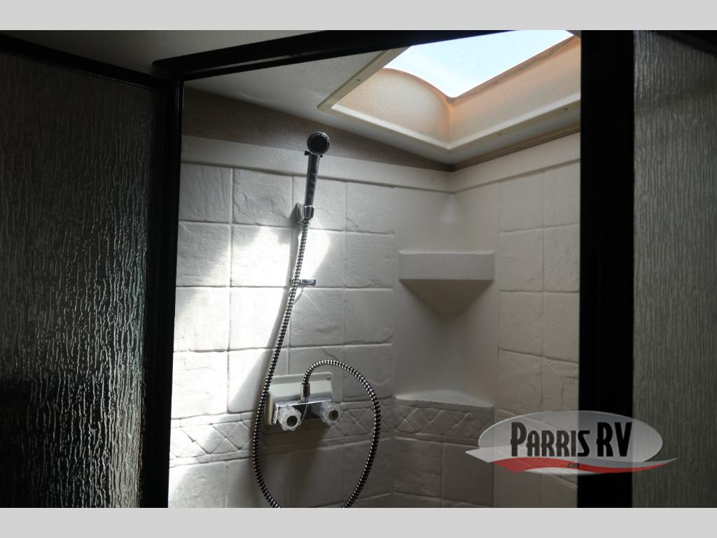 A side aisle full bath includes a toilet, vanity sink, medicine cabinet, corner shower with skylight, and linen storage.