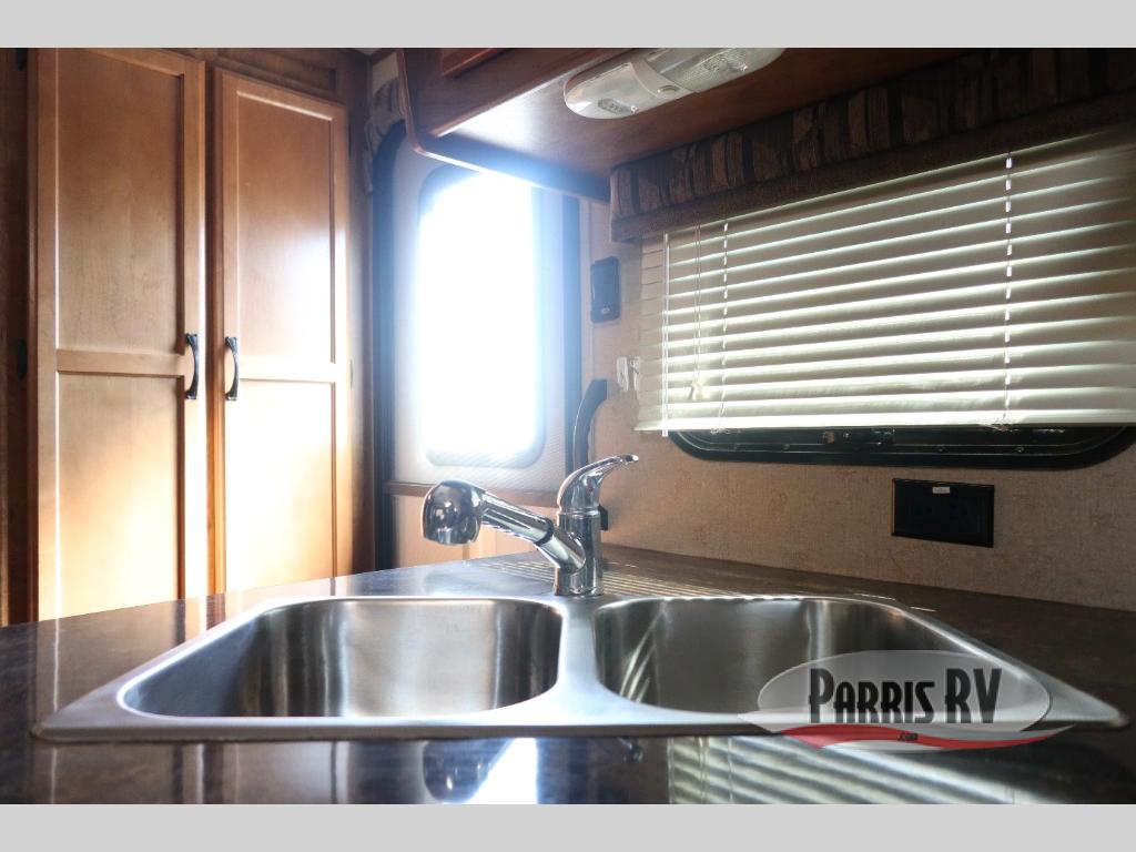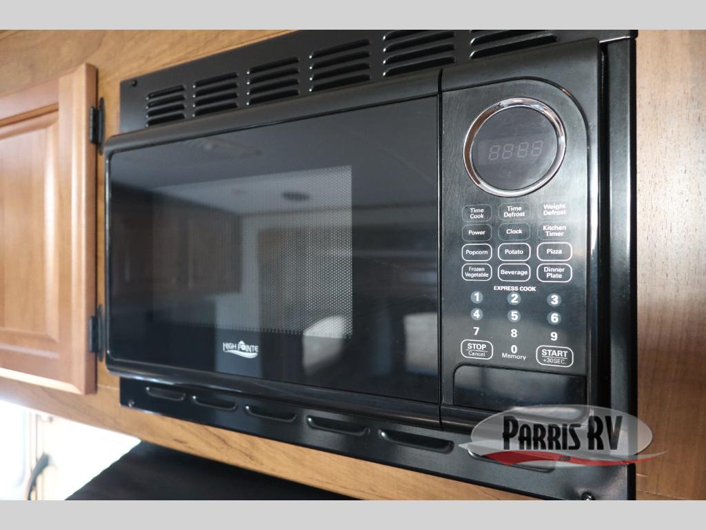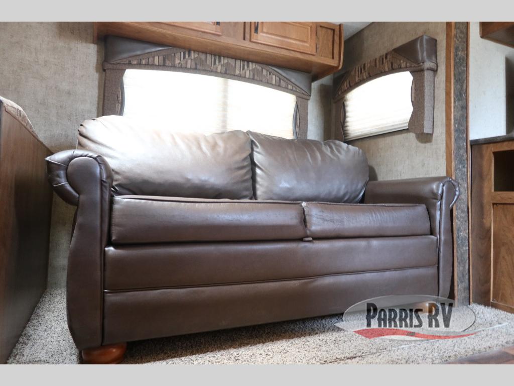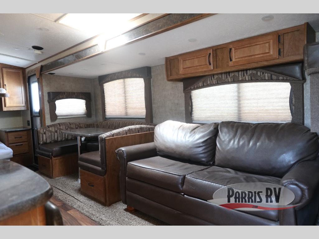 Continuing around the far wall, a generous slide includes a sleeper sofa with overhead cabinets, plus a skylight above for natural lighting. A u-shaped dinette with a rolling ottoman completes the slide out.