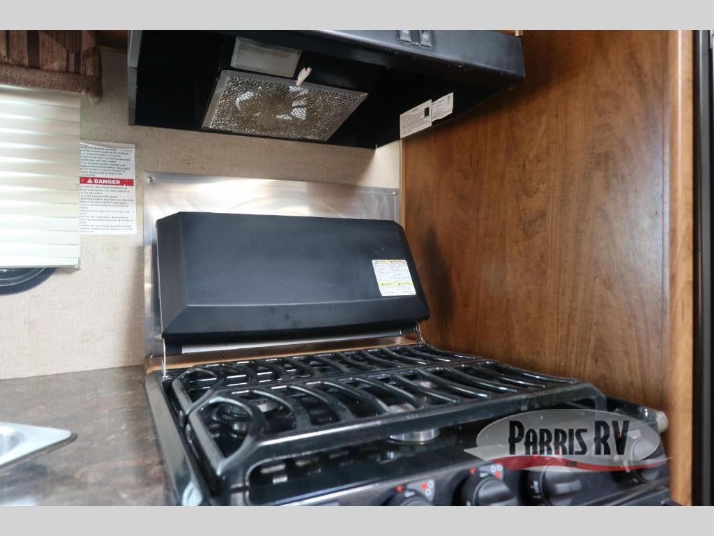 The kitchen includes a refrigerator, three burner range, angled double sink, flip-up counter extension, and overhead cabinets.