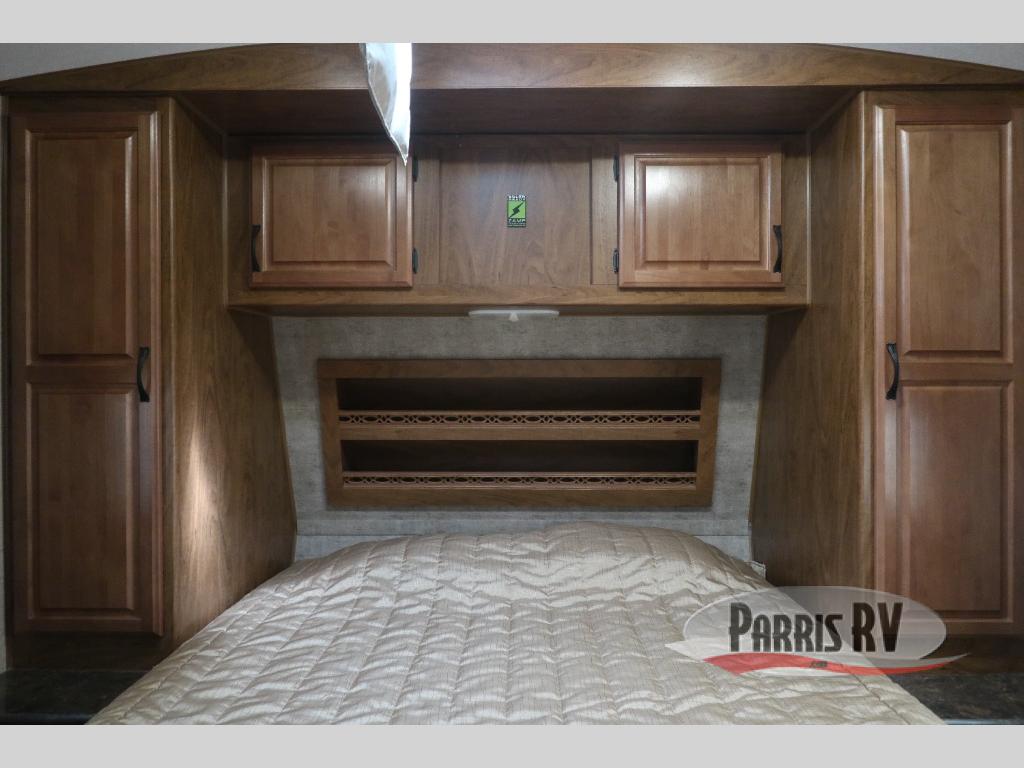 A front bedroom provides a walk around queen bed with wardrobes and nightstands at each side of the bed as well as overhead storage above the head of the bed, and a TV in the corner.