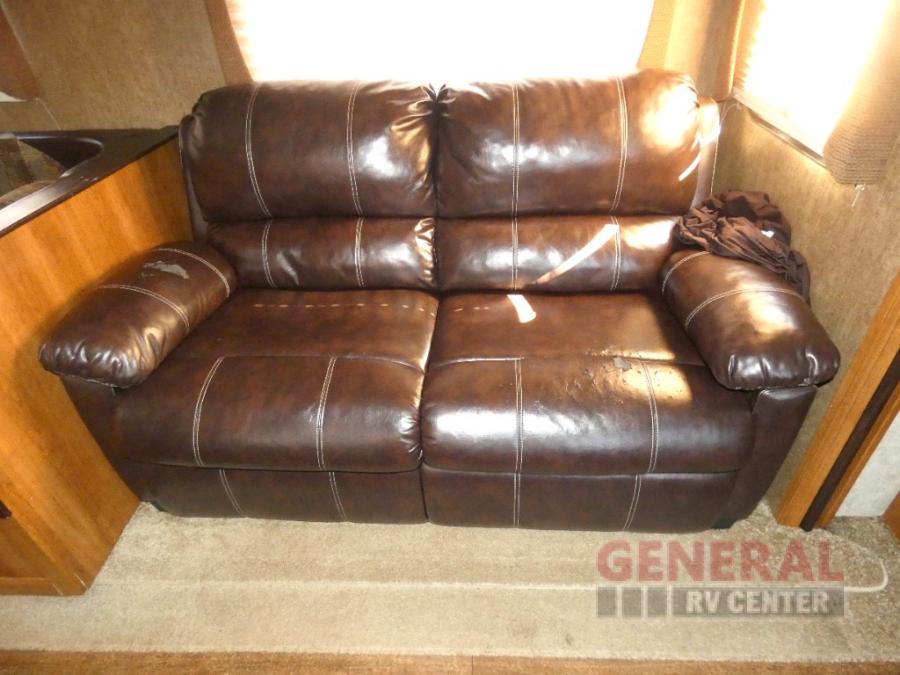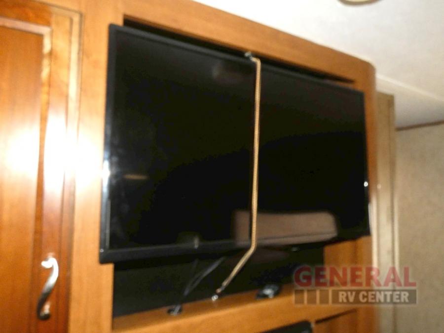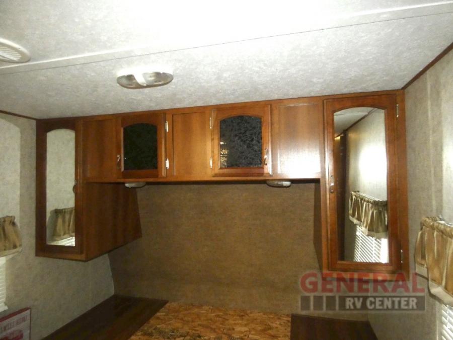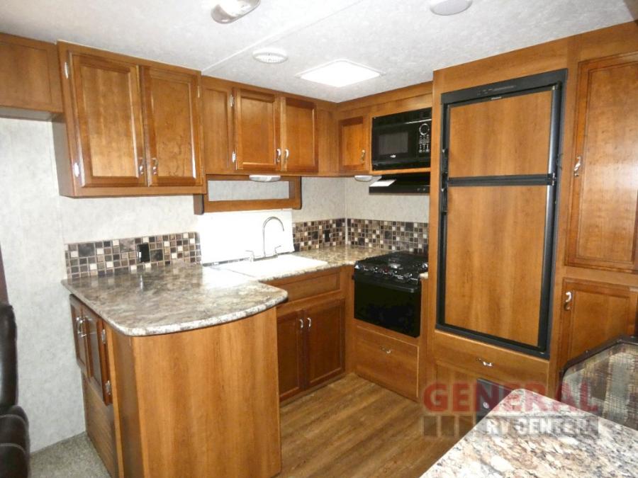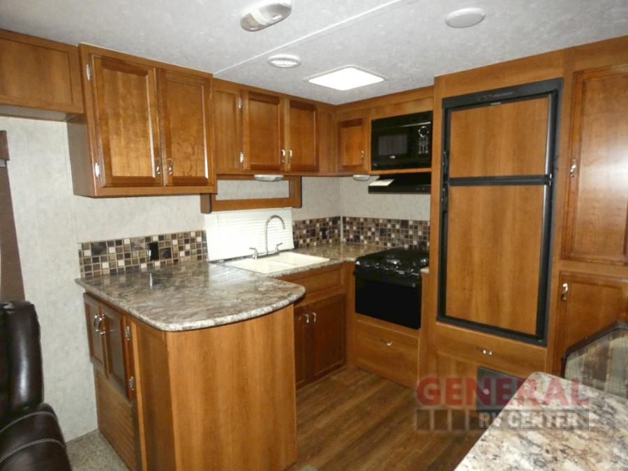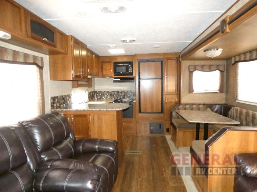 As you enter the 28RKS you will notice two lounge chairs to your left with an overhead cabinet above the chairs. There is a large counter space, double kitchen sink, three burner range, refrigerator, and pantry. The slide has a u-shaped dinette and sofa. Along one wall there is an entertainment center that you are sure to enjoy.
