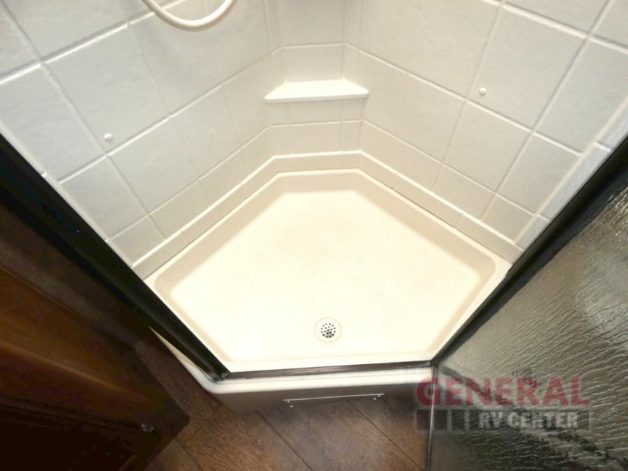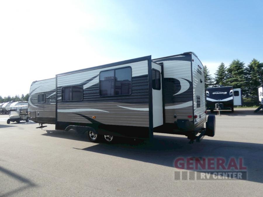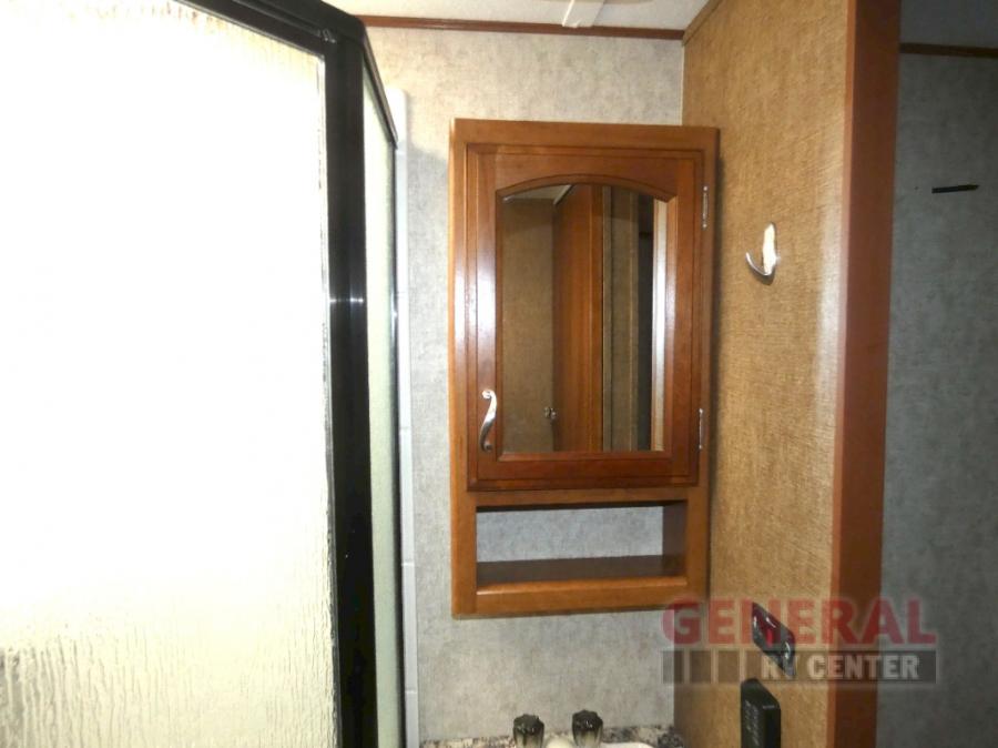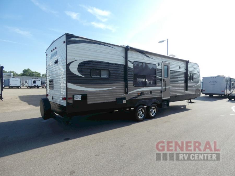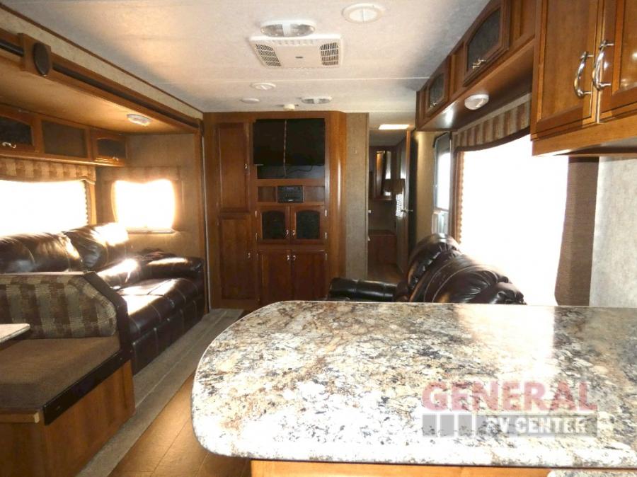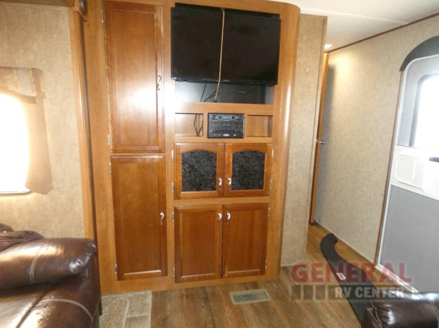 As you enter the 28RKS you will notice two lounge chairs to your left with an overhead cabinet above the chairs. There is a large counter space, double kitchen sink, three burner range, refrigerator, and pantry. The slide has a u-shaped dinette and sofa. Along one wall there is an entertainment center that you are sure to enjoy.