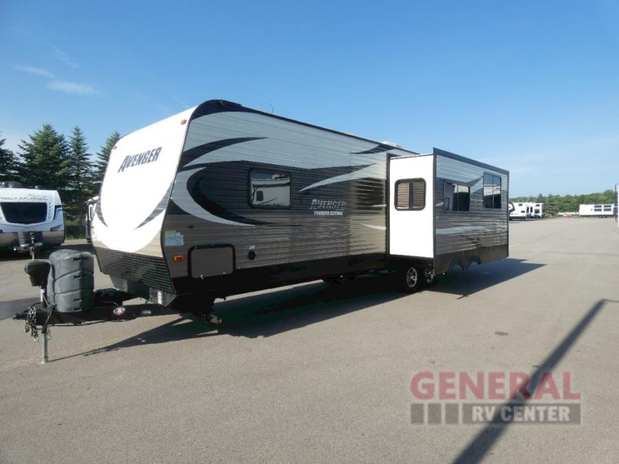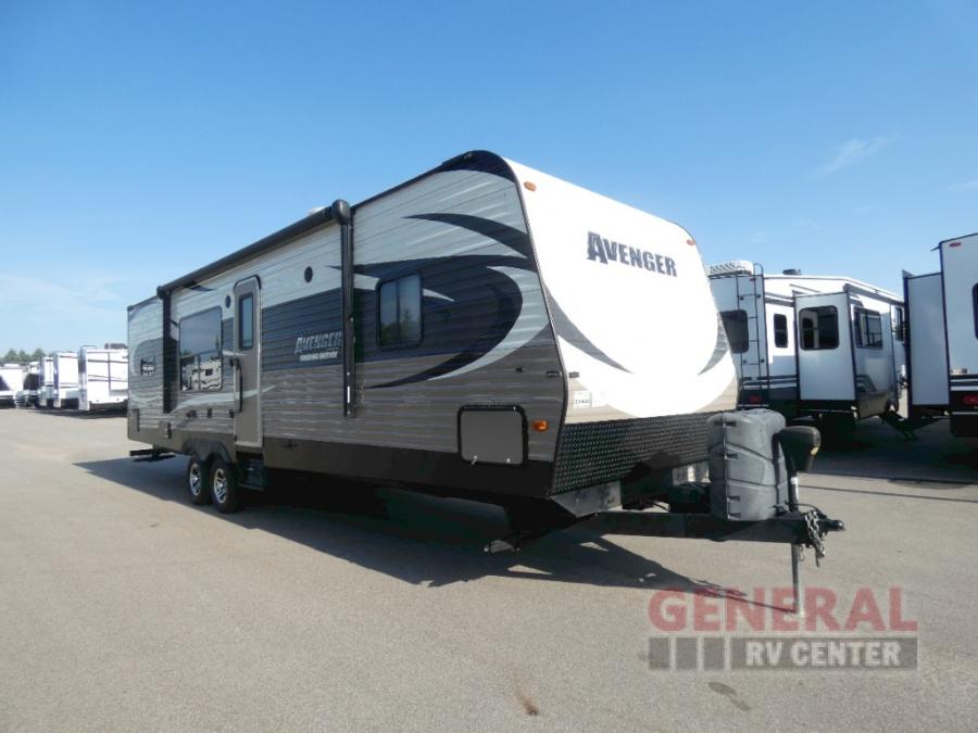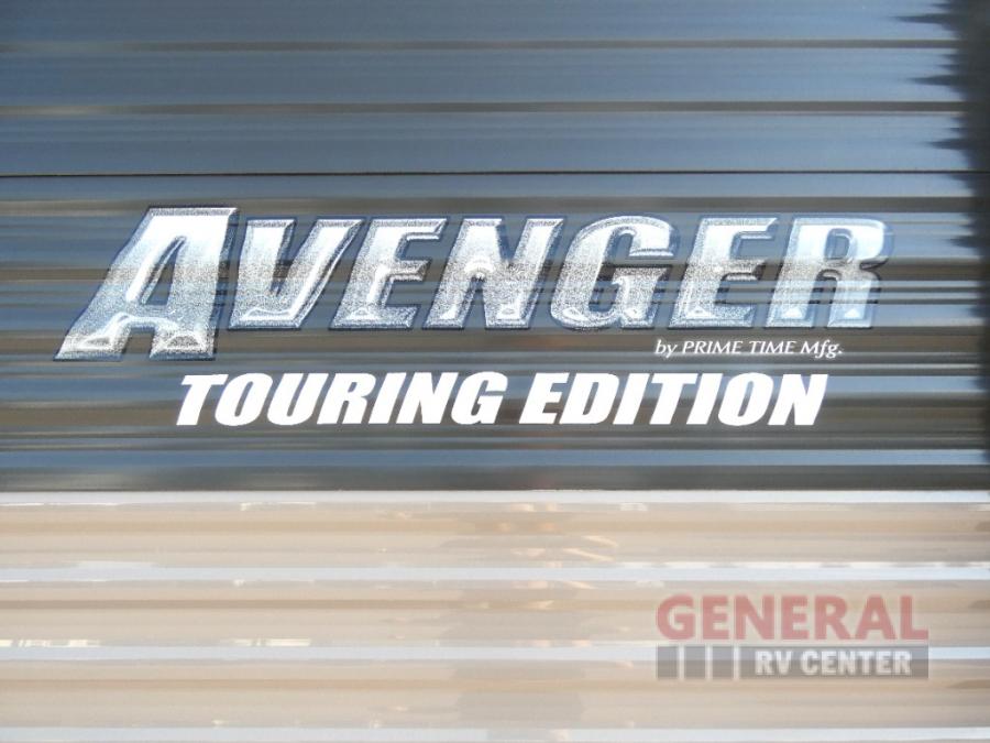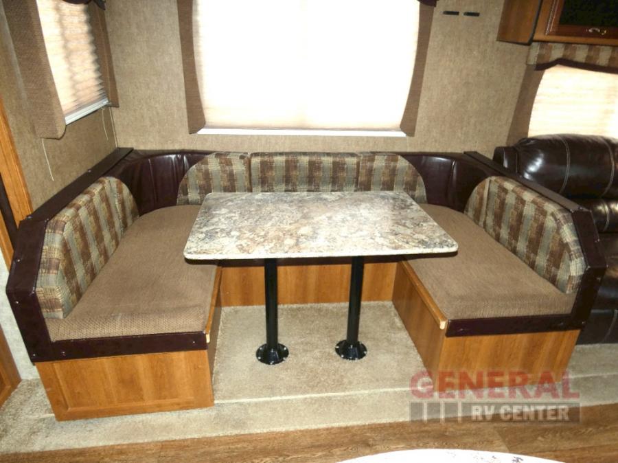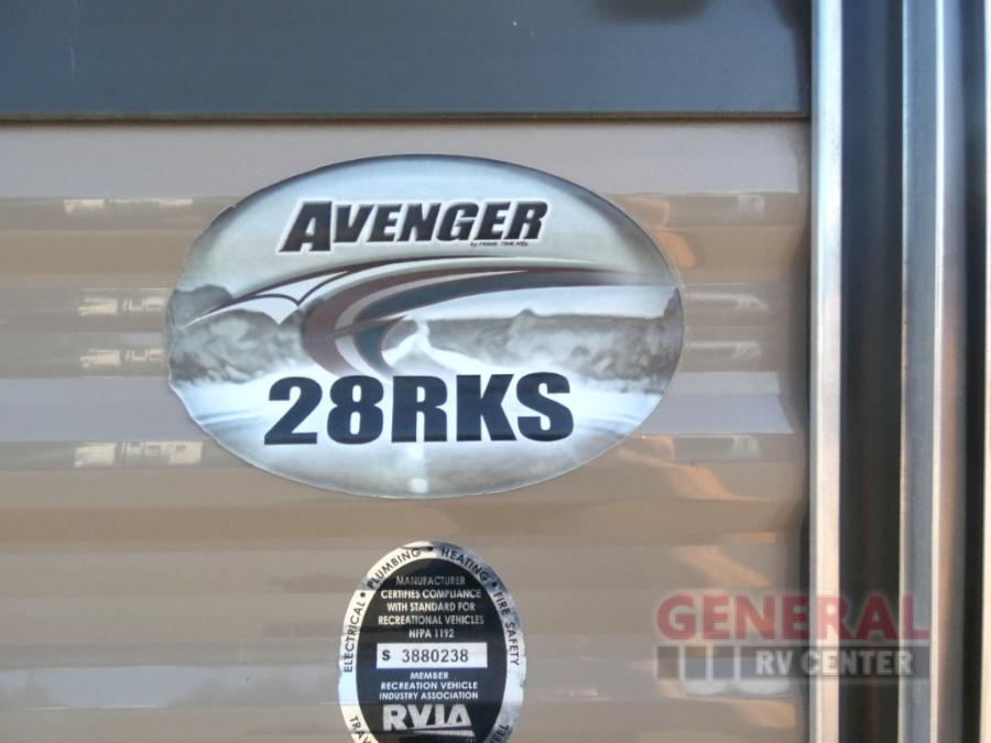 The single slide 28RKS Avenger travel trailer by Prime Time Manufacturing features a u-shaped dinette and a rear kitchen area.