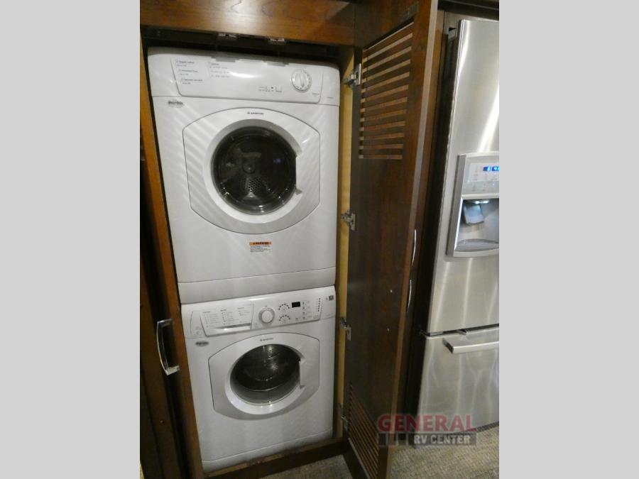 The second slide out offers a sofa, a 48" LED TV mounted above the sofa, a dining table & chairs, a residential refrigerator with ice maker, a pantry, a stackable washer and dryer, and continuing in the bedroom there are two wardrobes and a dresser with a 32" LED TV.