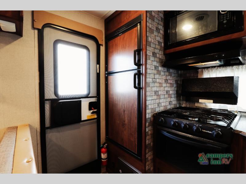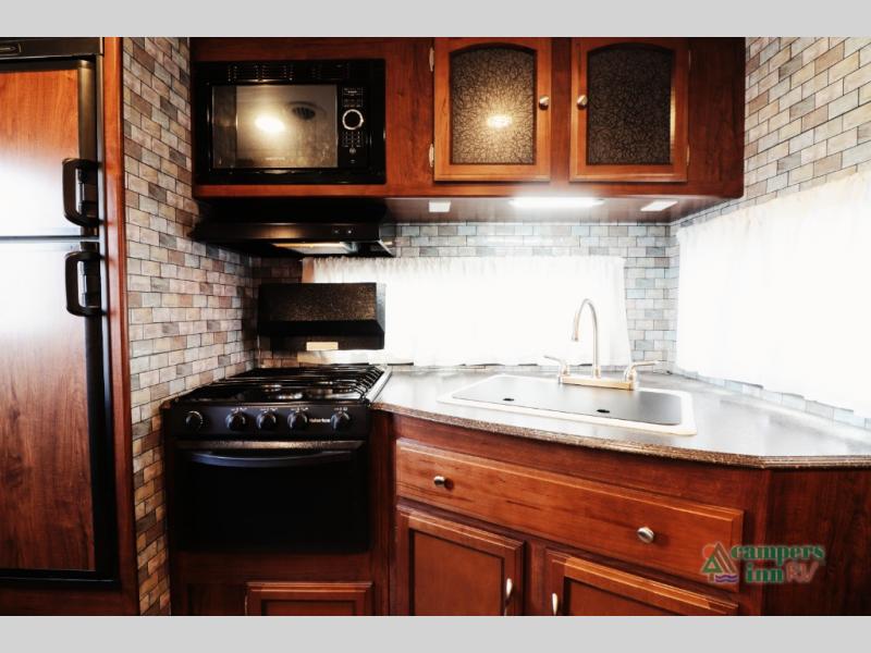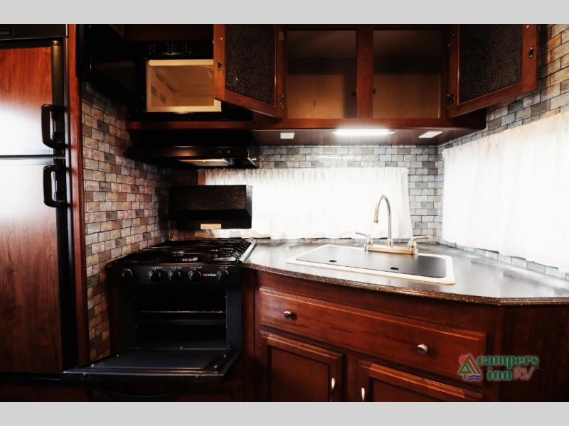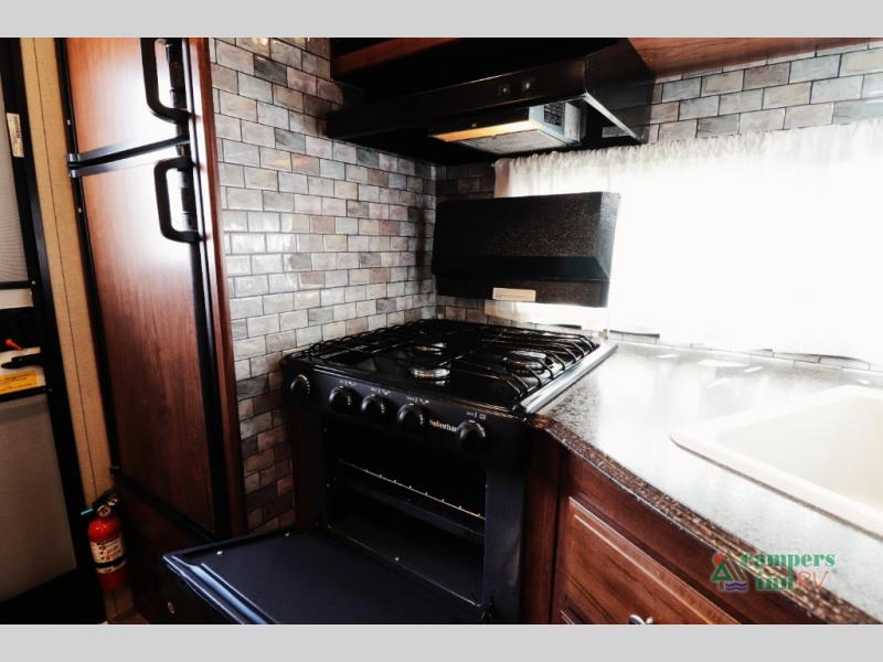 Three-burner cooktop with oven in the rear kitchen, making on-the-road meals easy.