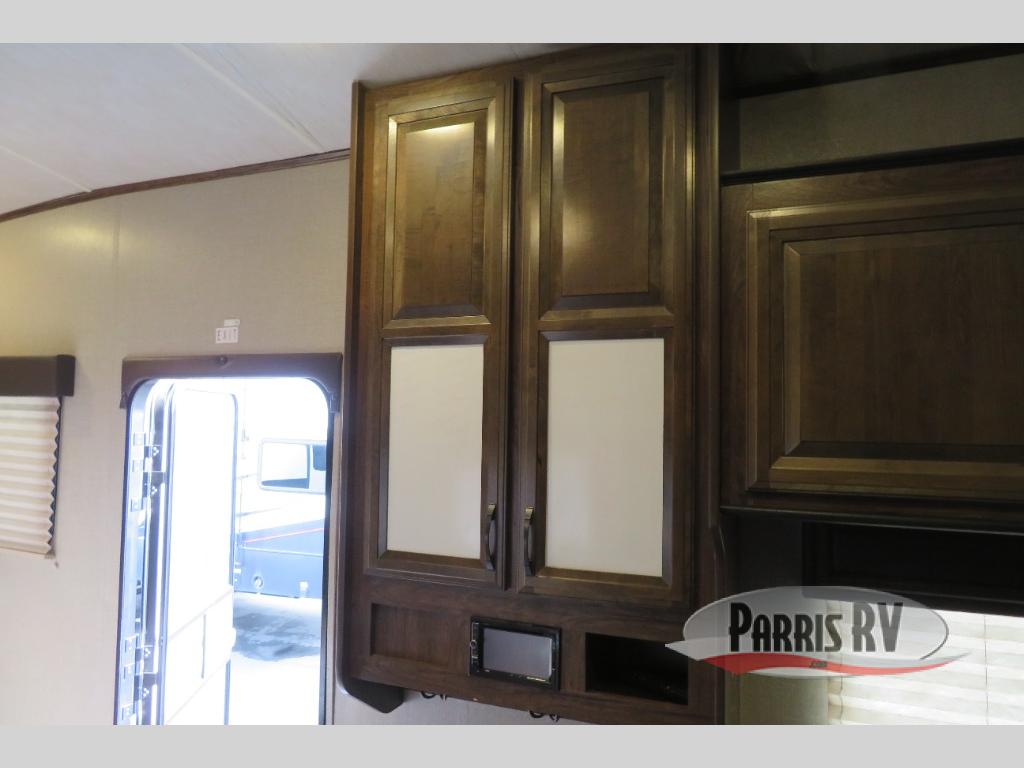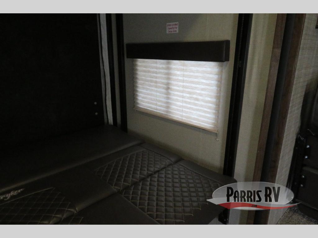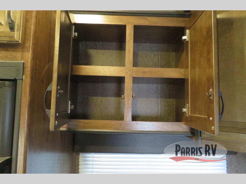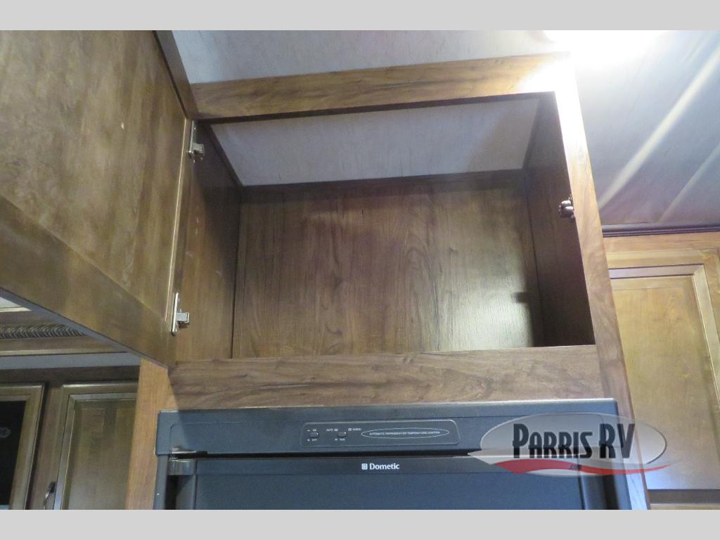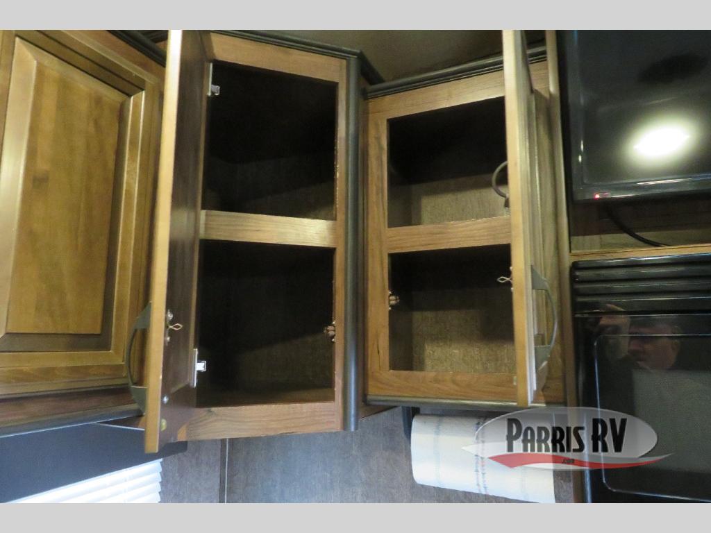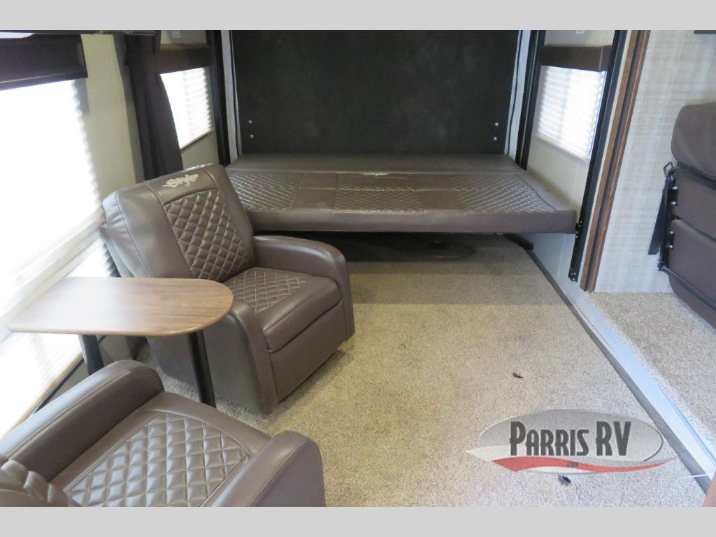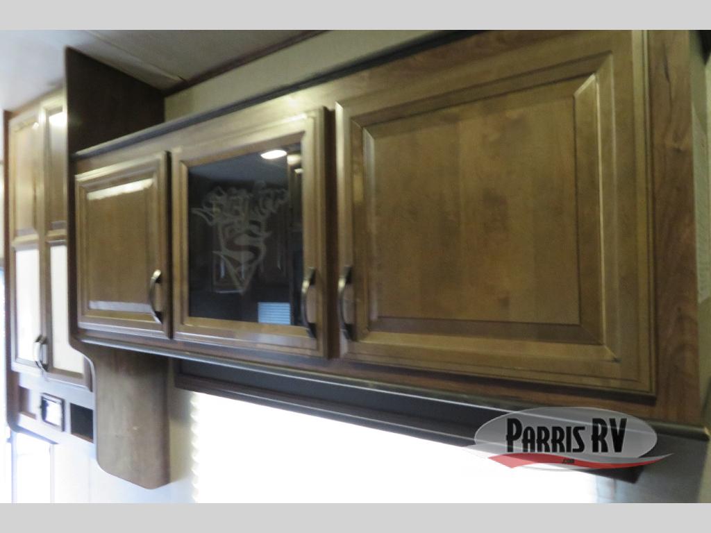 Above the rear sofas there is an electric bed which neatly stores near the ceiling when not in use. A sofa with an overhead cabinet and a table are located within the road side slide out, and two swivel rockers along the door side make for comfortable seating when you just want to kick back and reminisce about the days adventure. There are also plenty of overhead cabinets throughout the unit to keep things tucked away and organized.