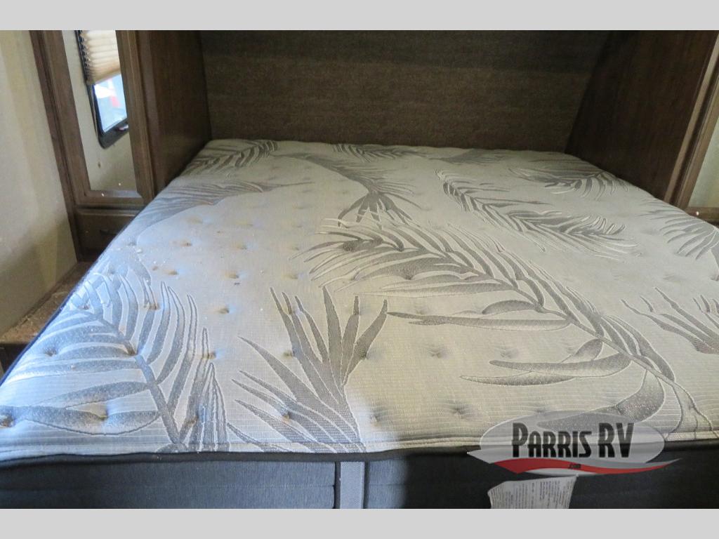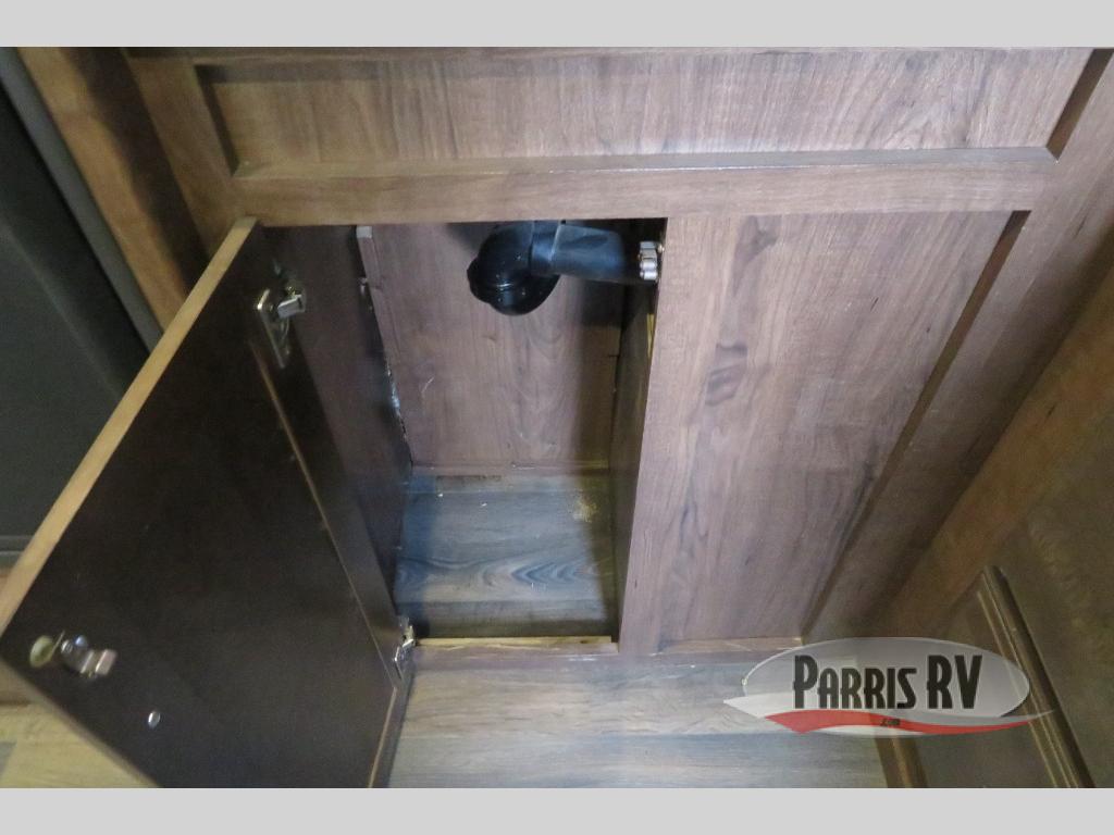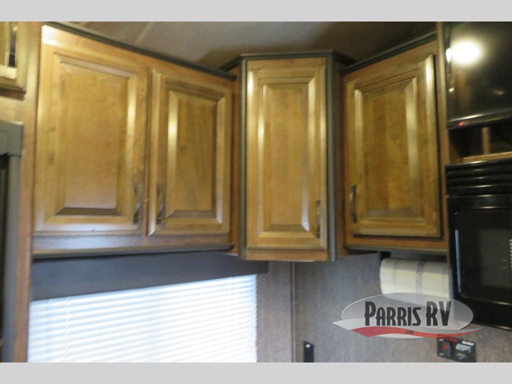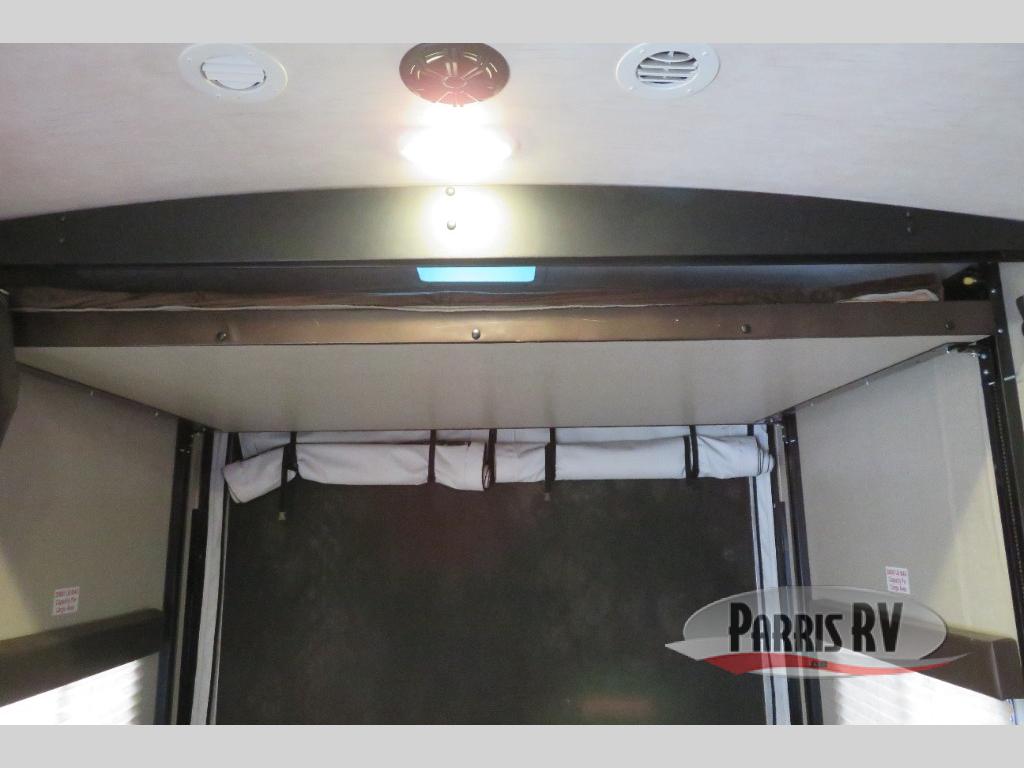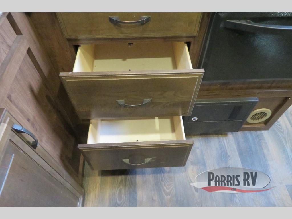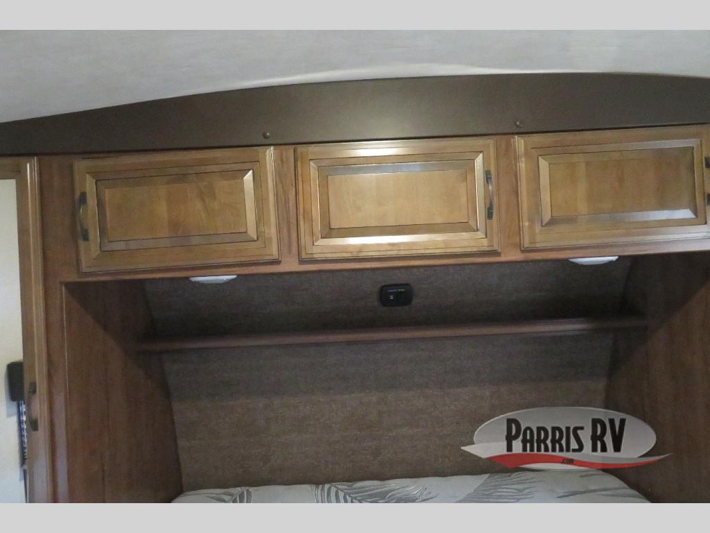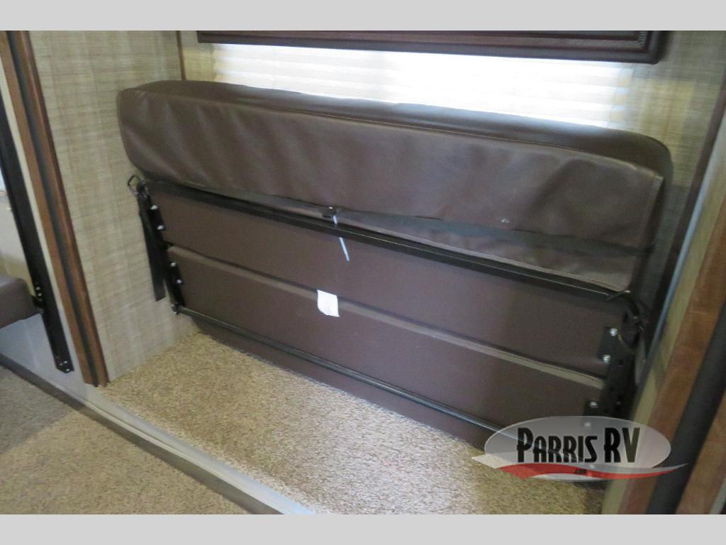 Above the rear sofas there is an electric bed which neatly stores near the ceiling when not in use. A sofa with an overhead cabinet and a table are located within the road side slide out, and two swivel rockers along the door side make for comfortable seating when you just want to kick back and reminisce about the days adventure. There are also plenty of overhead cabinets throughout the unit to keep things tucked away and organized.