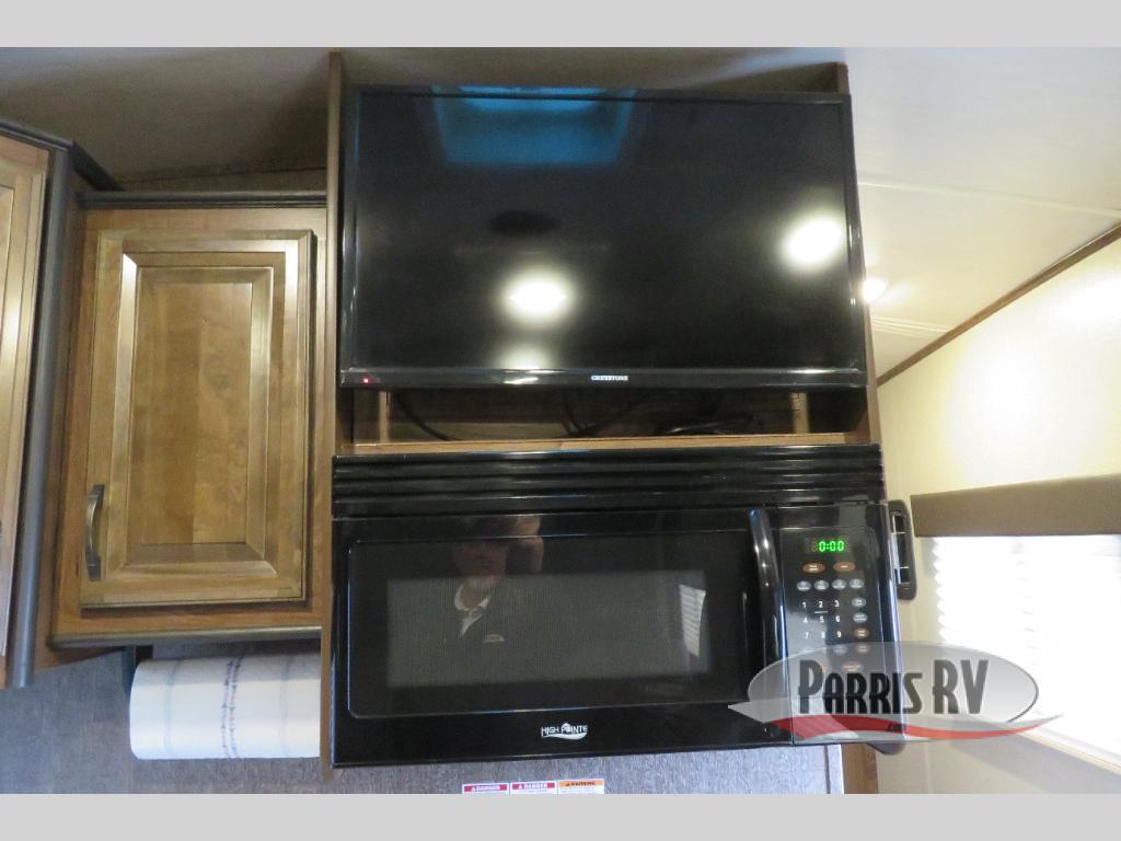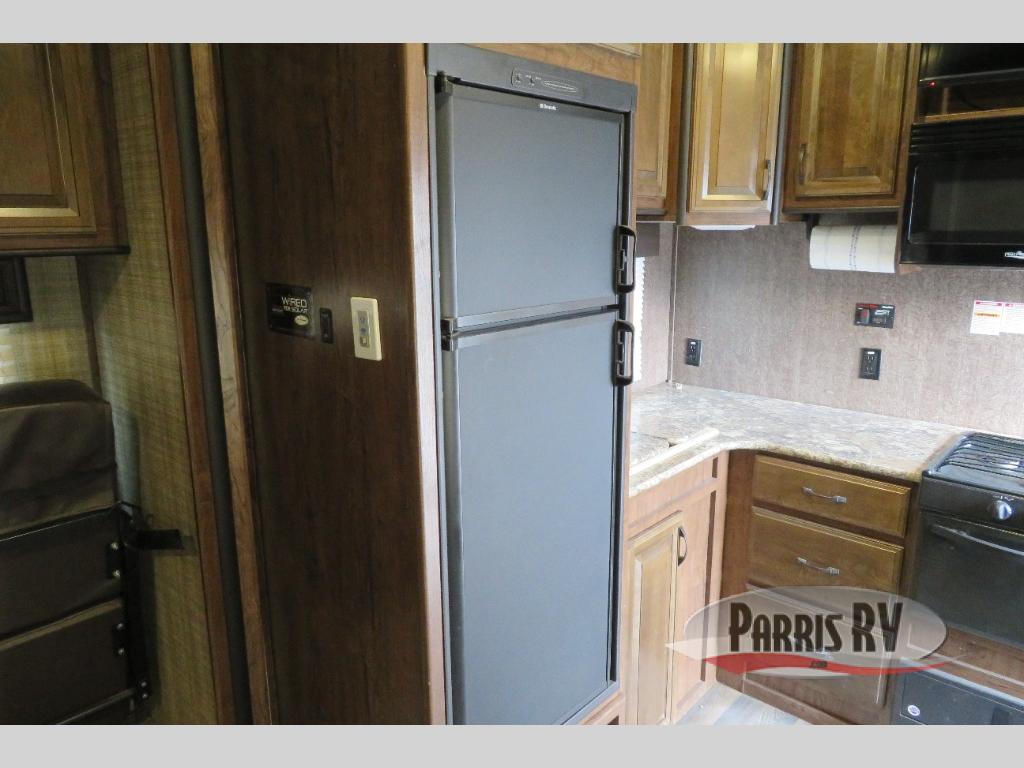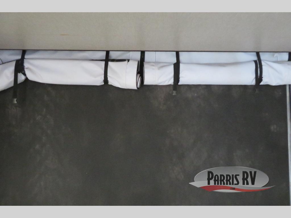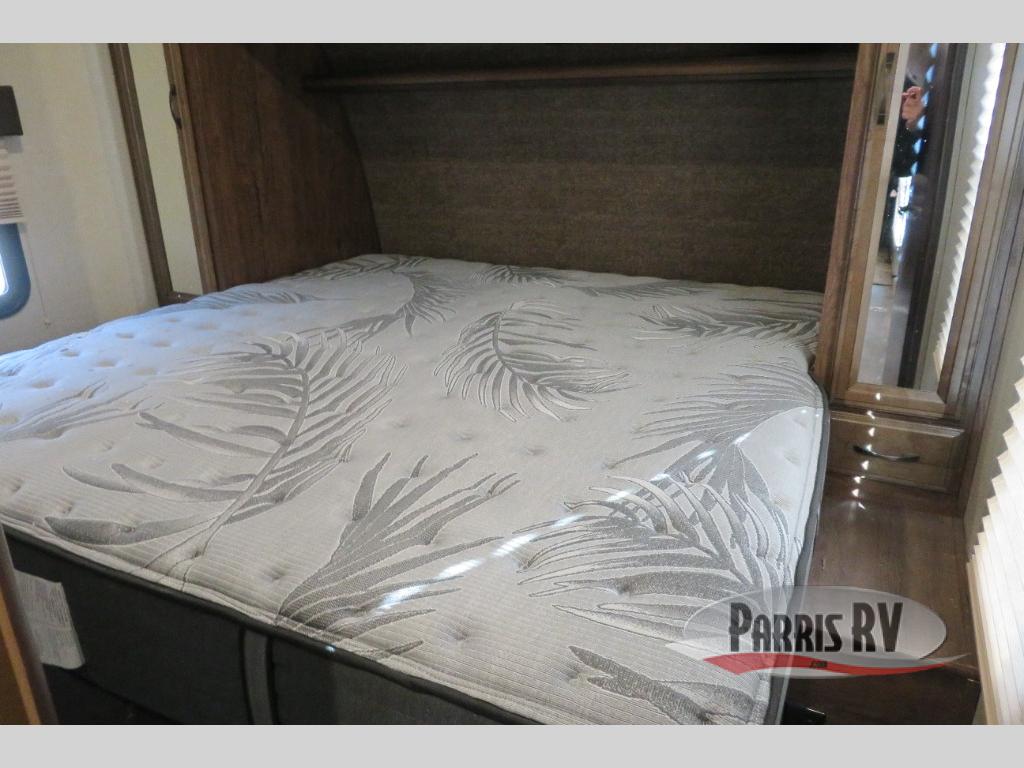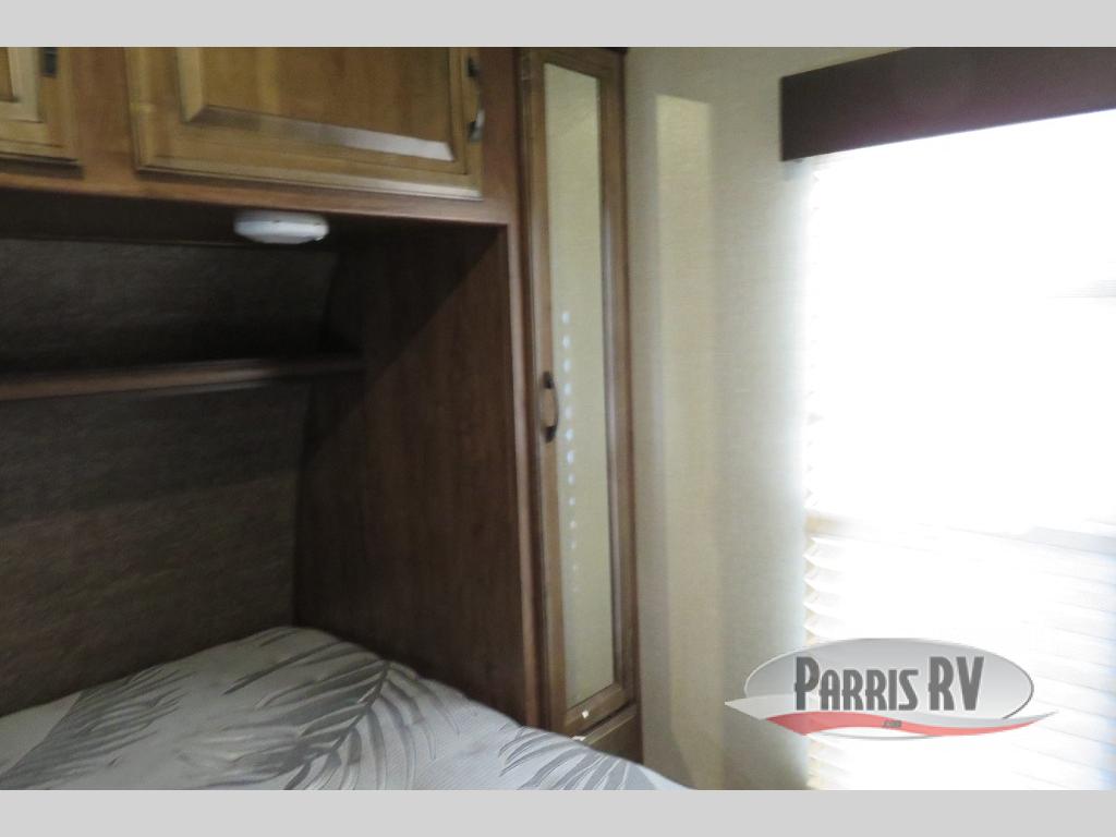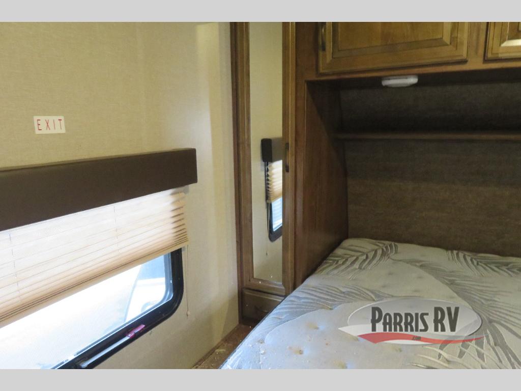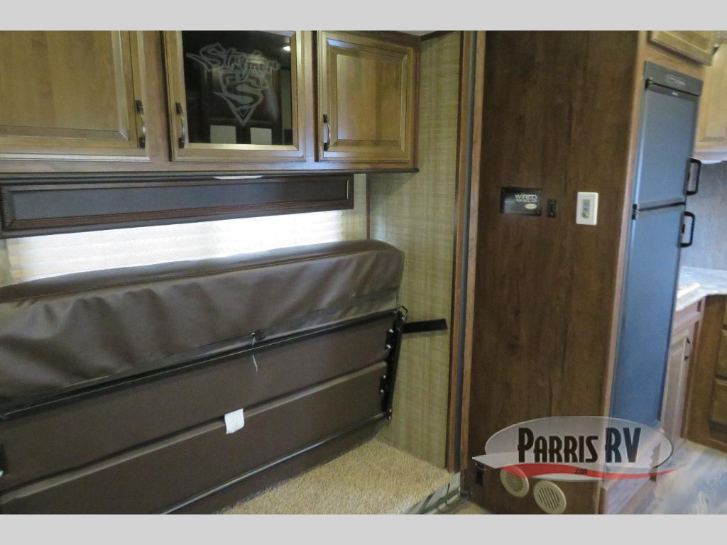 Above the rear sofas there is an electric bed which neatly stores near the ceiling when not in use. A sofa with an overhead cabinet and a table are located within the road side slide out, and two swivel rockers along the door side make for comfortable seating when you just want to kick back and reminisce about the days adventure. There are also plenty of overhead cabinets throughout the unit to keep things tucked away and organized.