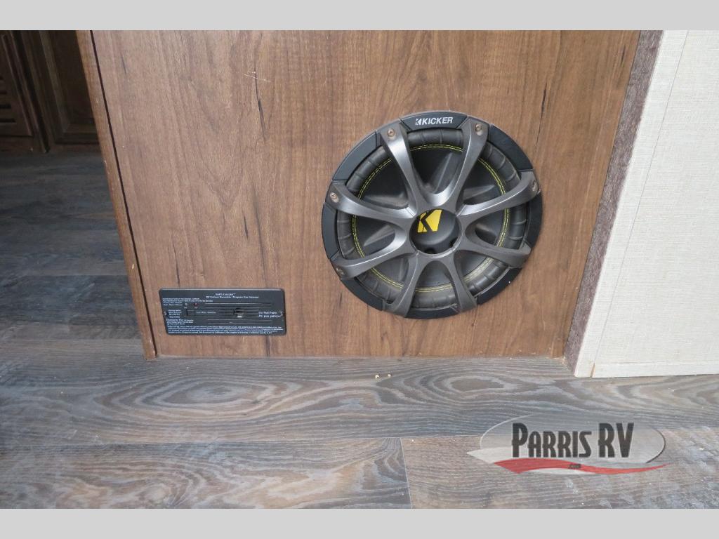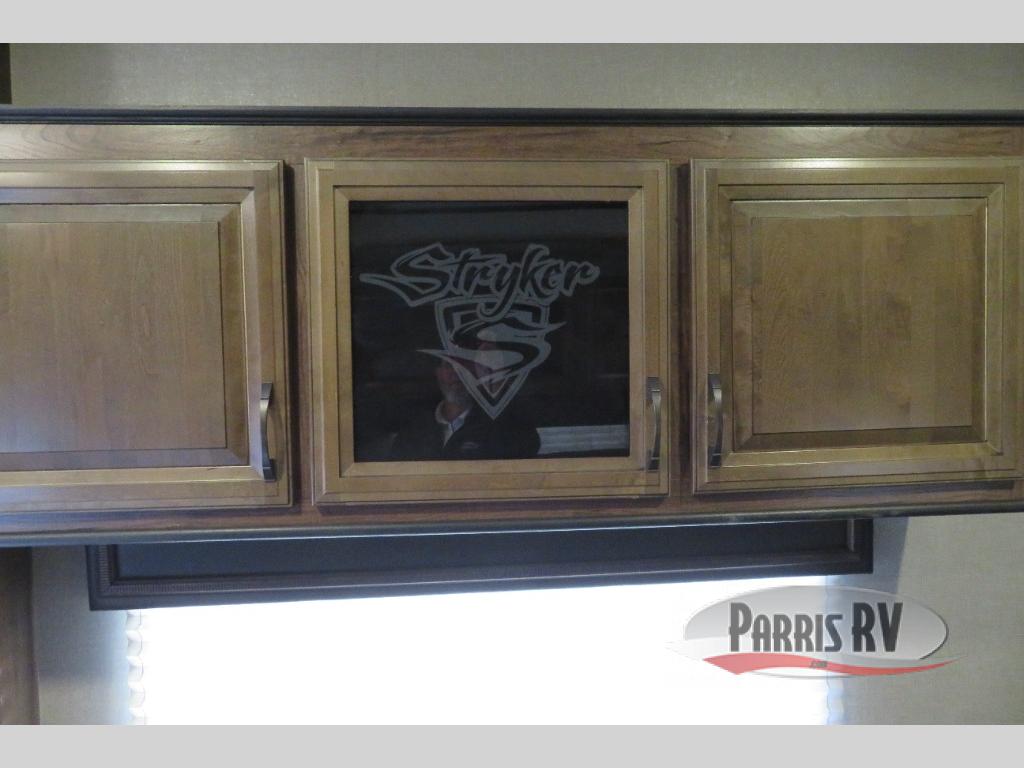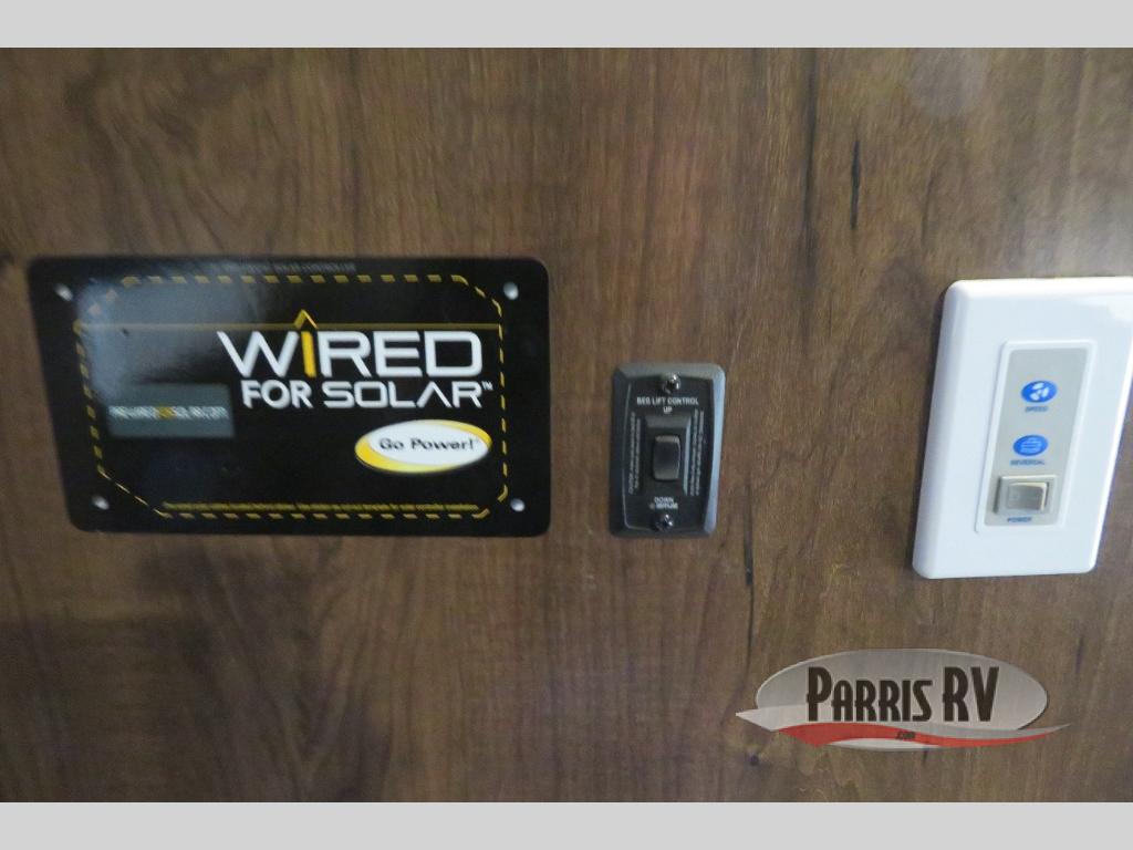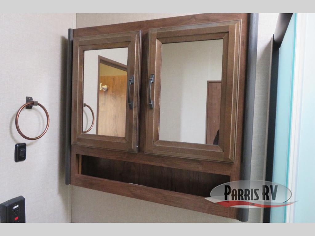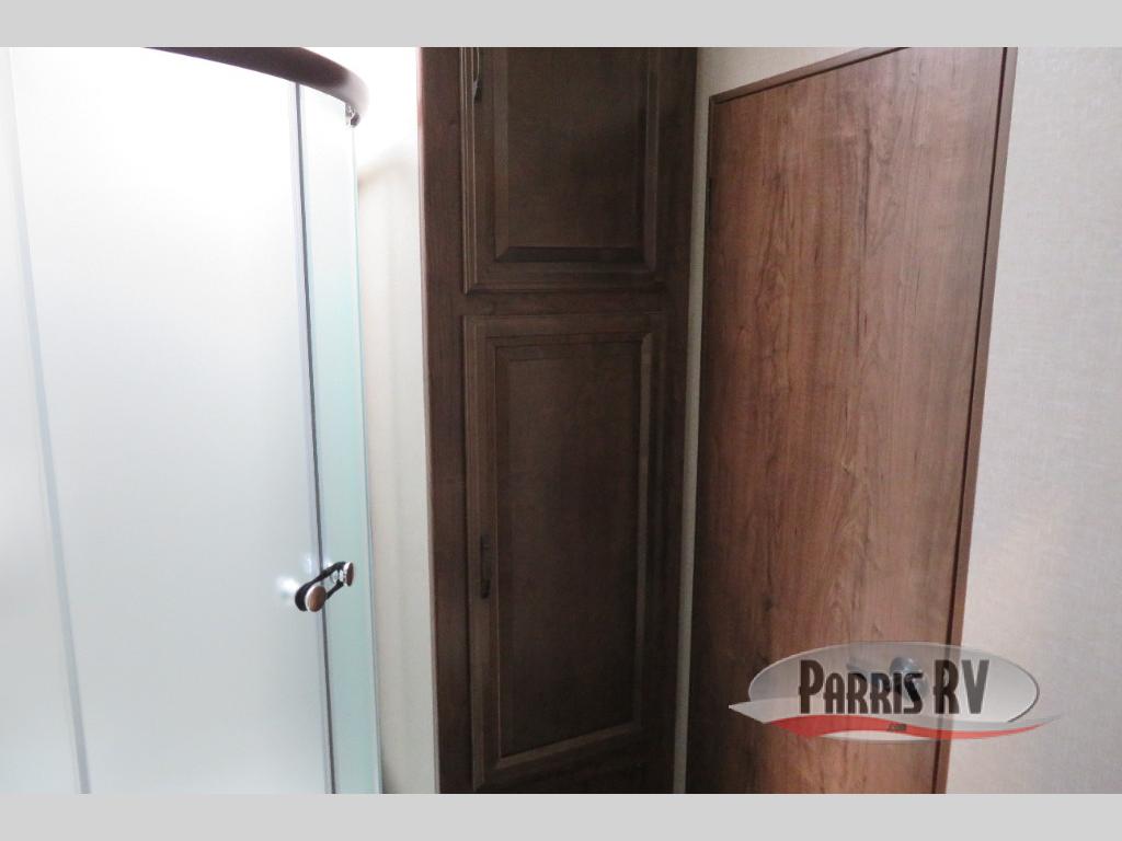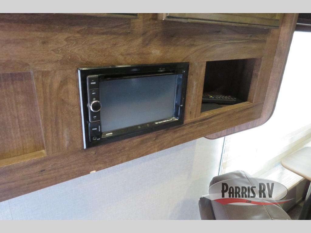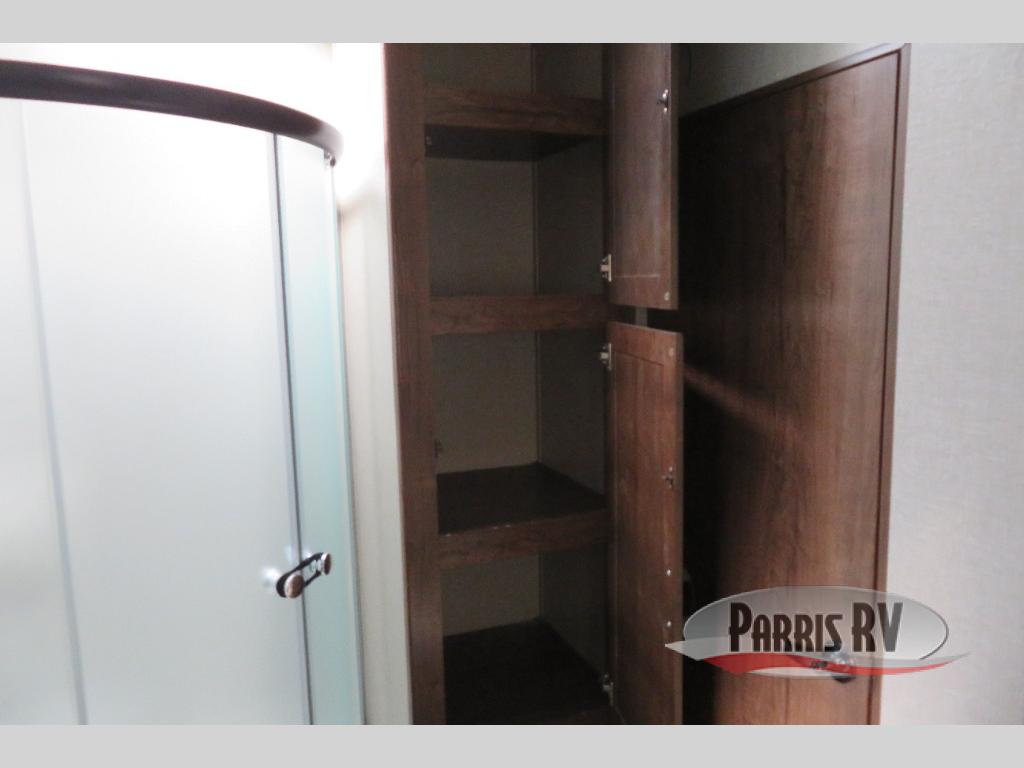 Above the rear sofas there is an electric bed which neatly stores near the ceiling when not in use. A sofa with an overhead cabinet and a table are located within the road side slide out, and two swivel rockers along the door side make for comfortable seating when you just want to kick back and reminisce about the days adventure. There are also plenty of overhead cabinets throughout the unit to keep things tucked away and organized.
