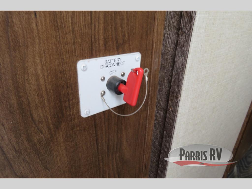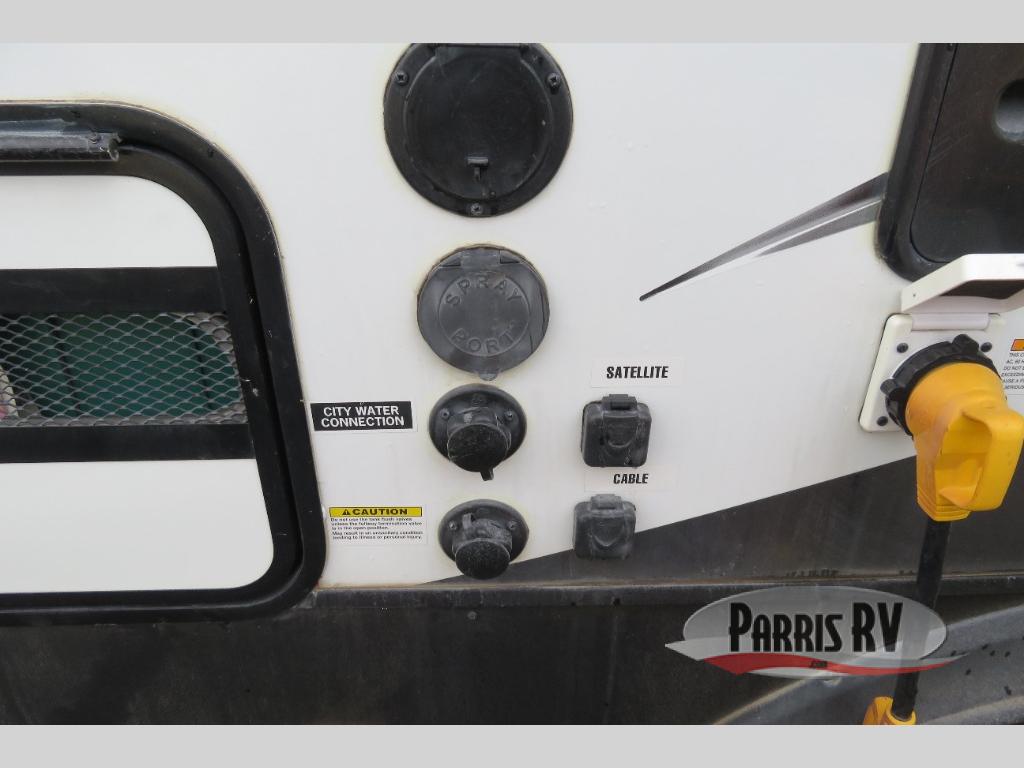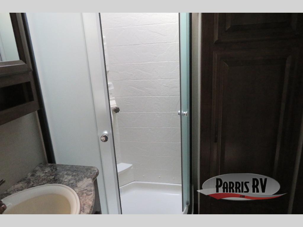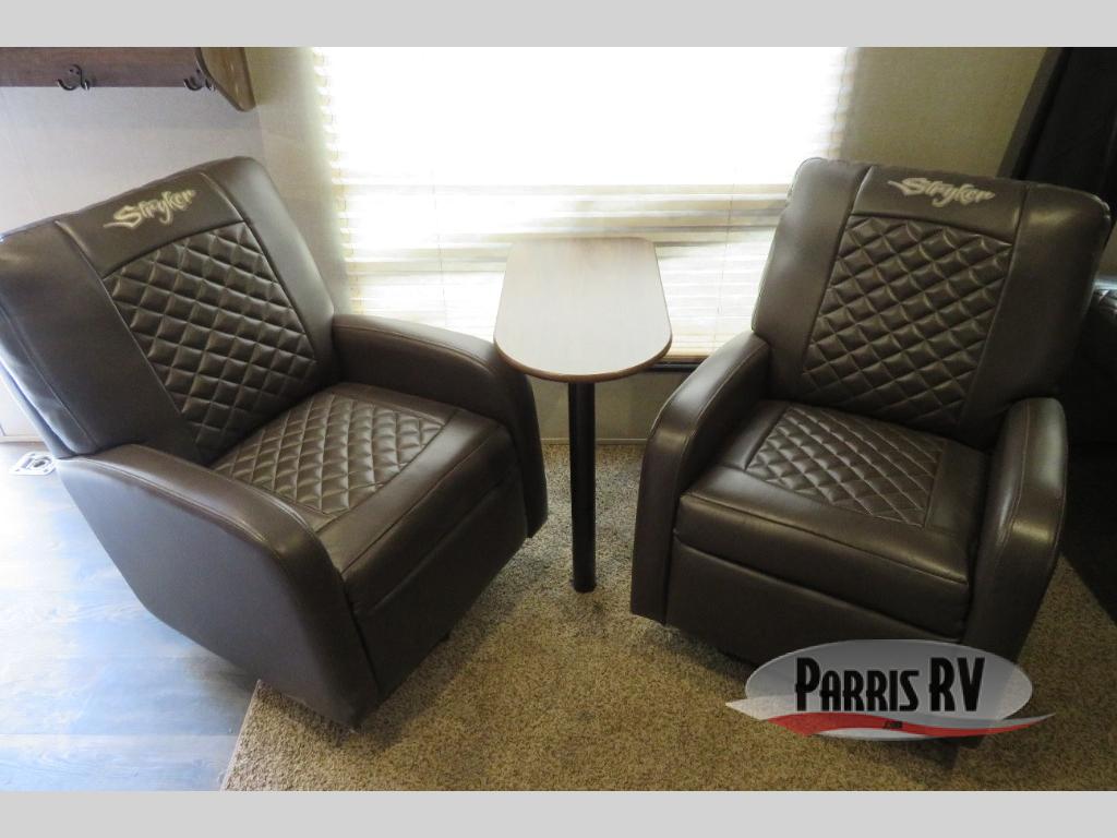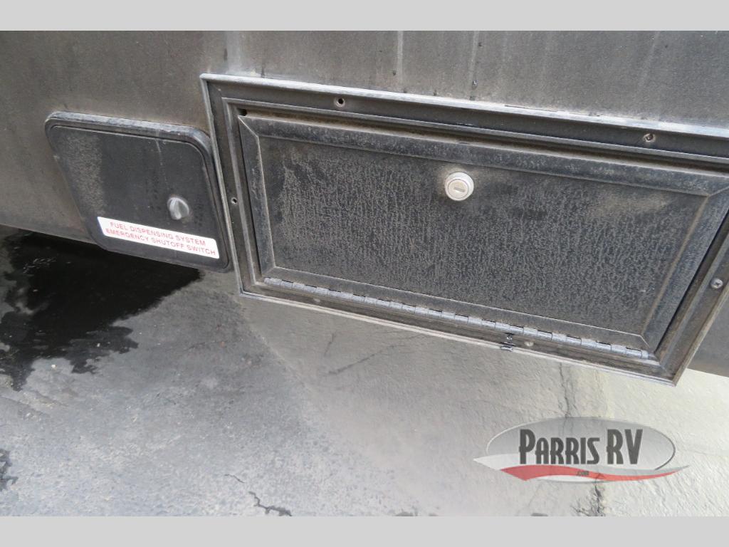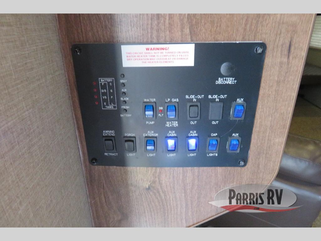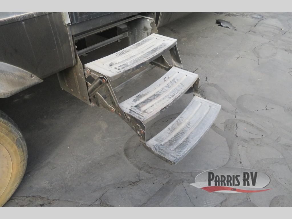 Above the rear sofas there is an electric bed which neatly stores near the ceiling when not in use. A sofa with an overhead cabinet and a table are located within the road side slide out, and two swivel rockers along the door side make for comfortable seating when you just want to kick back and reminisce about the days adventure. There are also plenty of overhead cabinets throughout the unit to keep things tucked away and organized.