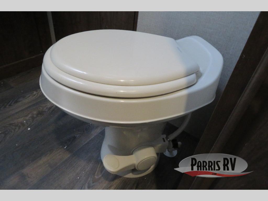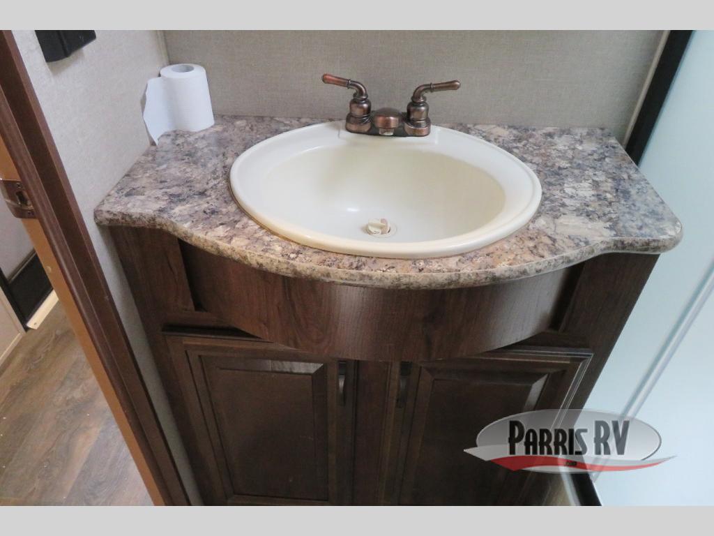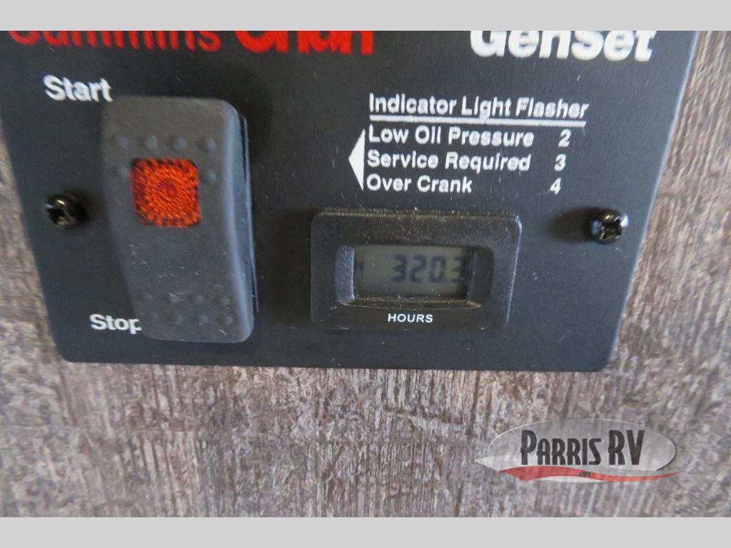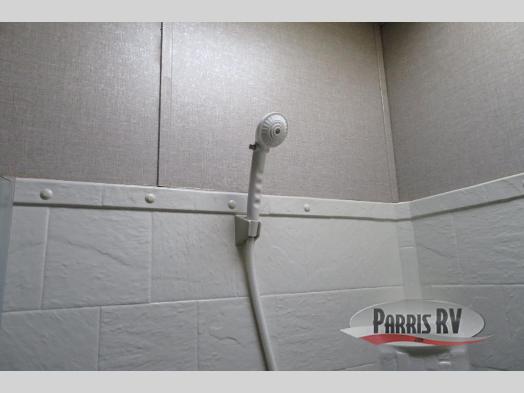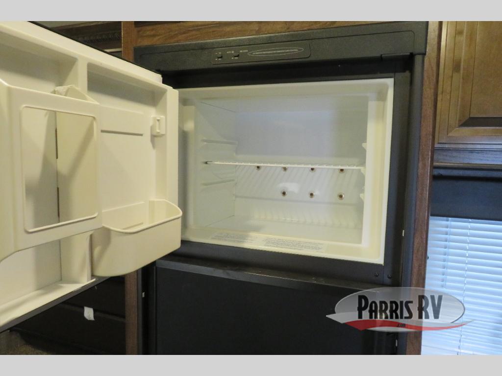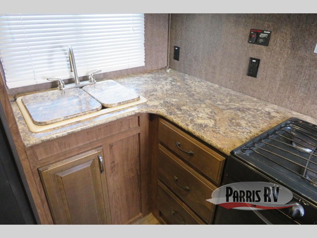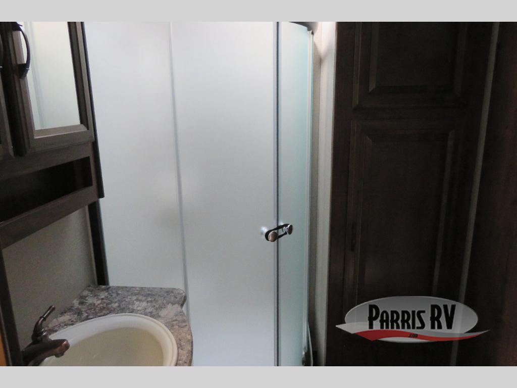 Above the rear sofas there is an electric bed which neatly stores near the ceiling when not in use. A sofa with an overhead cabinet and a table are located within the road side slide out, and two swivel rockers along the door side make for comfortable seating when you just want to kick back and reminisce about the days adventure. There are also plenty of overhead cabinets throughout the unit to keep things tucked away and organized.