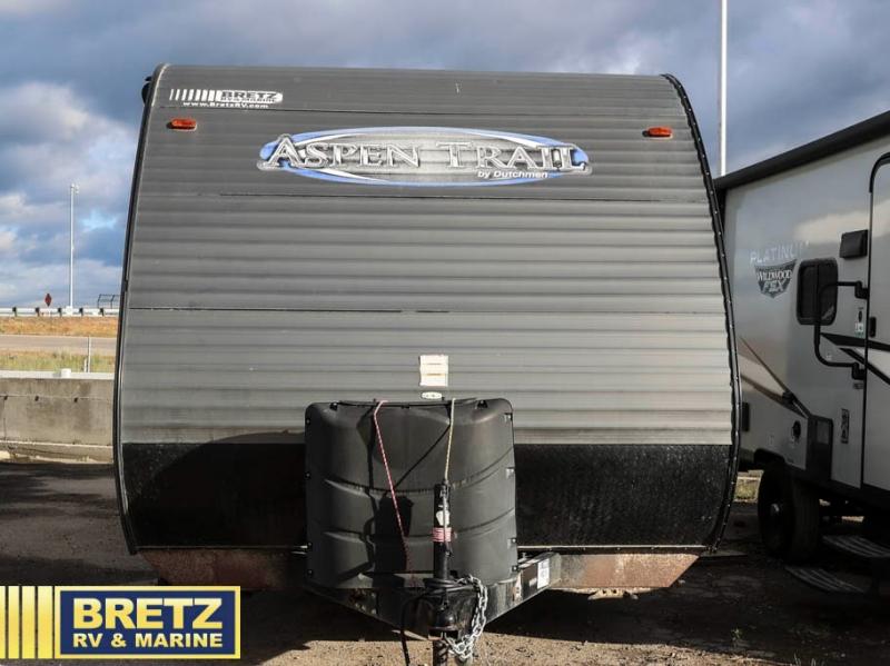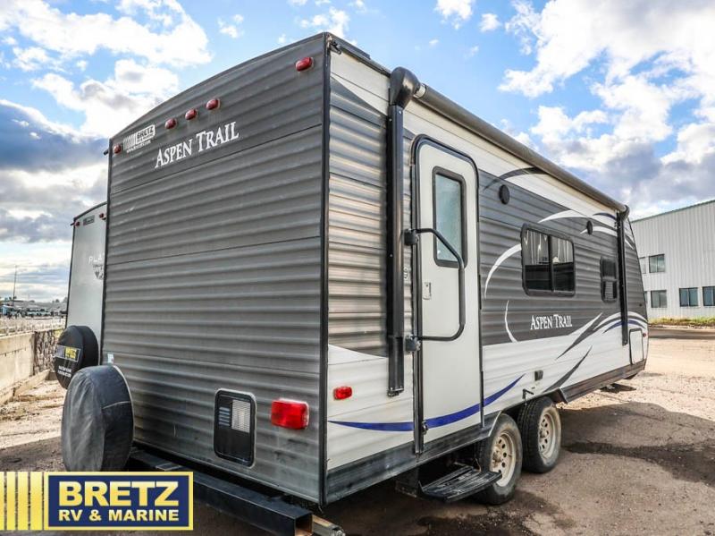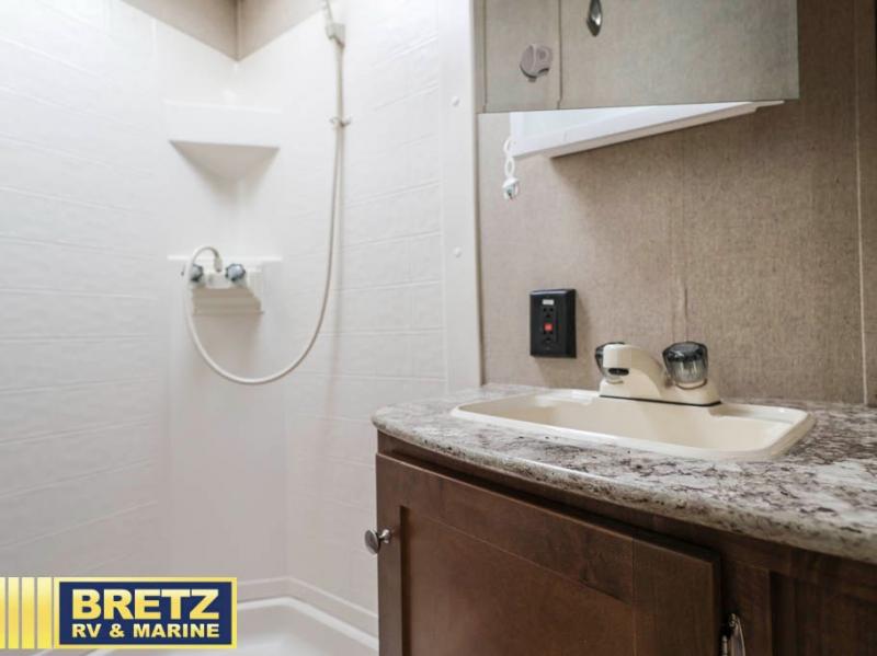 This Dutchmen RV Aspen Trail 1900RB travel trailer offers a rear corner full bathroom. It includes an angled shower with skylight, a corner vanity with sink and a toilet.