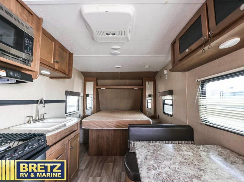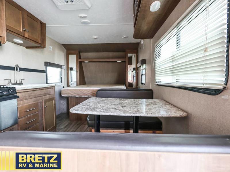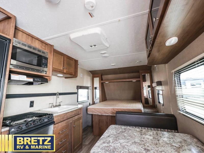The opposite side includes a booth dinette and overhead cabinets for additional storage.