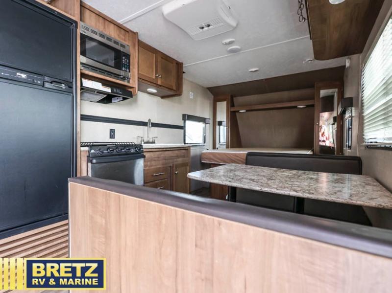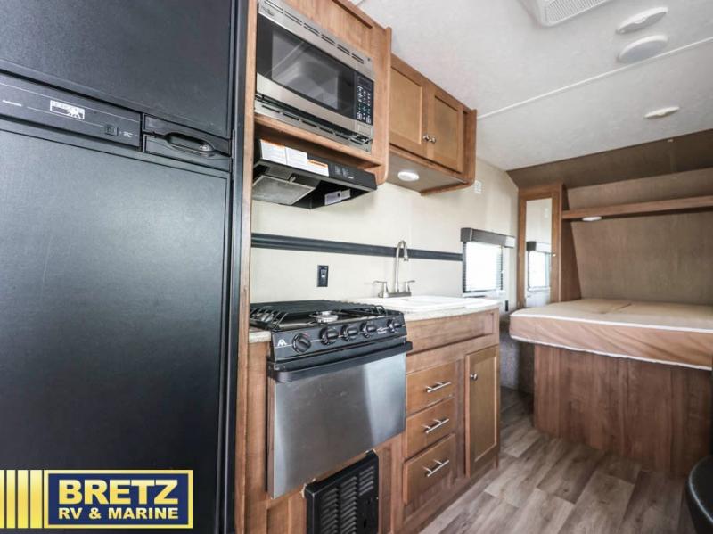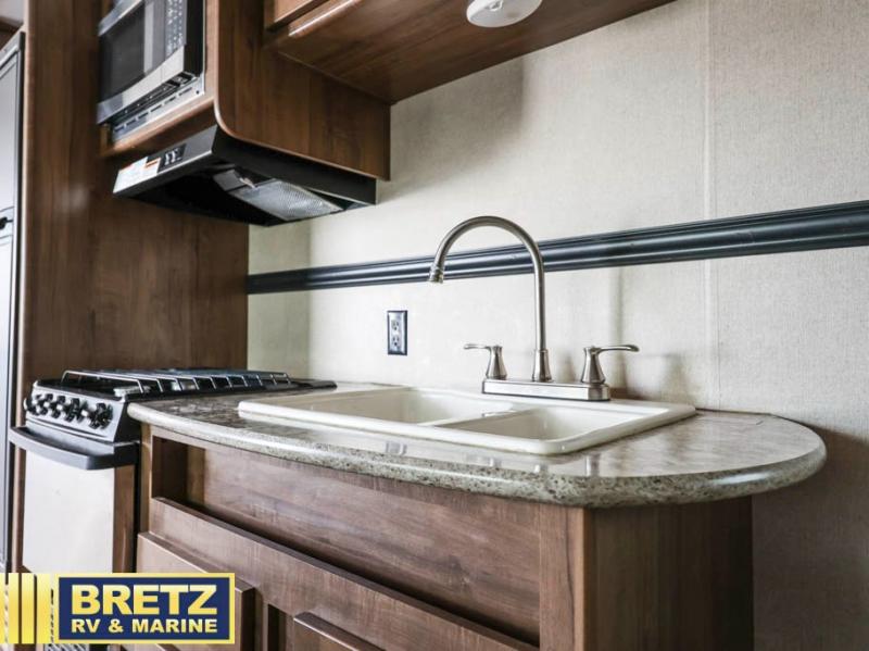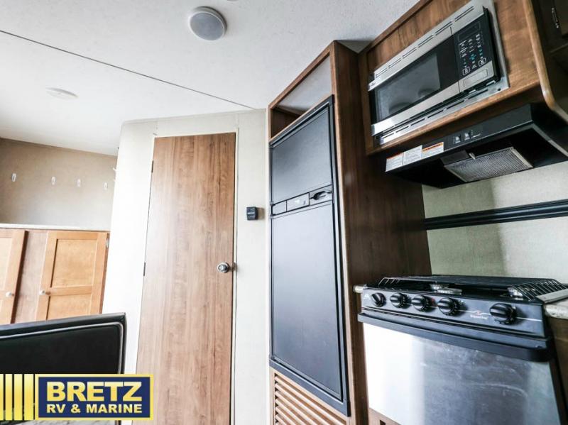 As you enter near the rear of the travel trailer, there is closet storage to your left and the bath entrance is straight ahead. As you continue around, the road side wall has the kitchen amenities. It provides a refrigerator, three burner range with microwave above, a double kitchen sink and overhead cabinets.