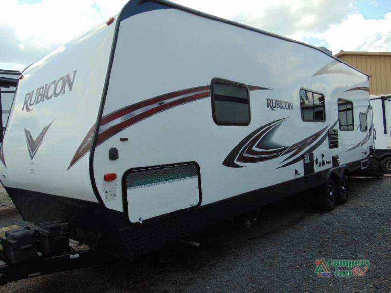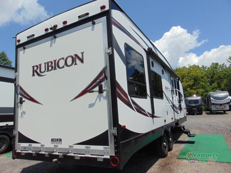 Take this Rubicon toy hauler travel trailer by Dutchmen on your next outing and enjoy every minute of your adventure both inside relaxing, and outside running the trails! Model 2905 features a private front bedroom, complete kitchen and bath accommodations, and plenty of space for a few extra friends!