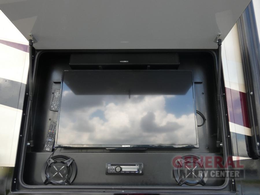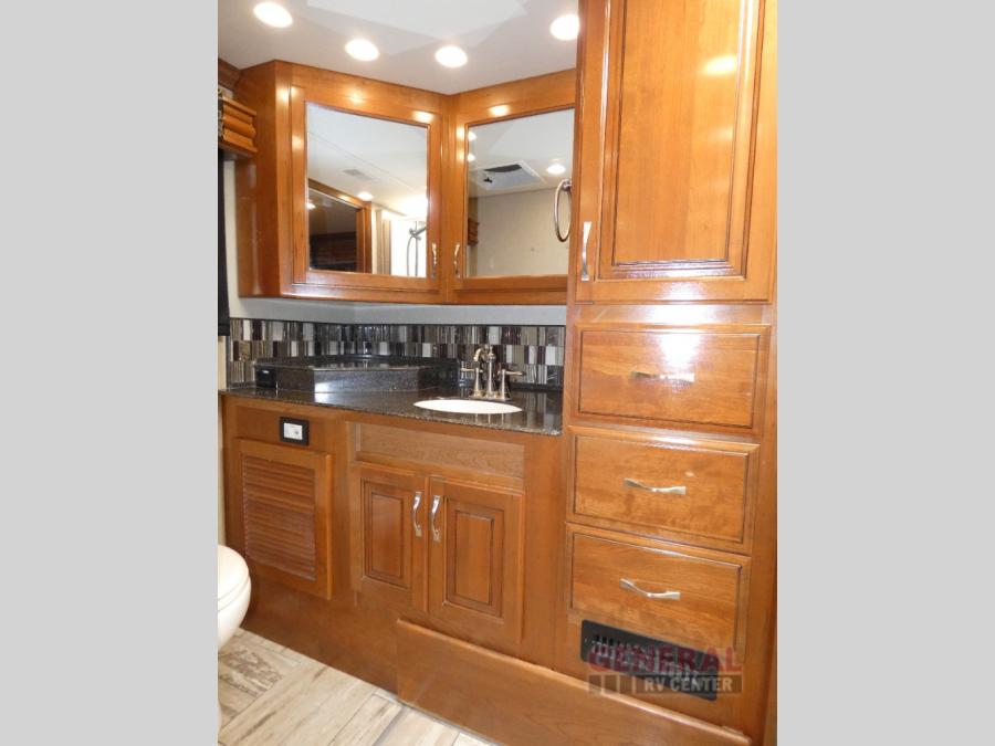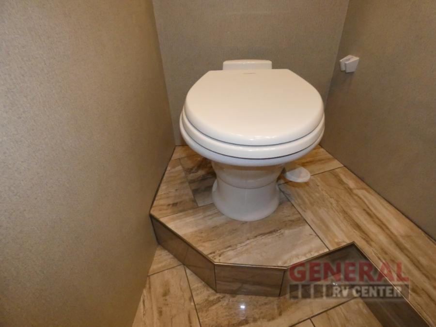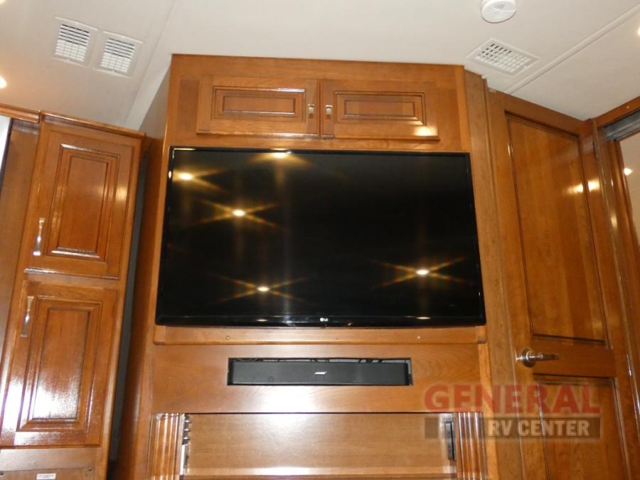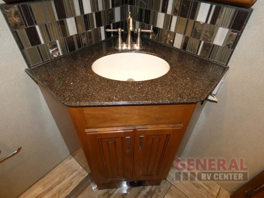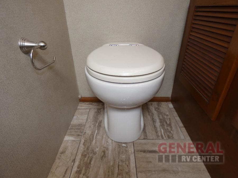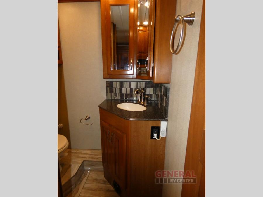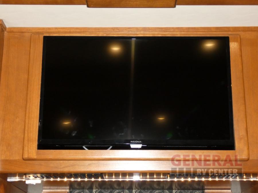Mid-coach there is a convenient half-bath including a toilet, a corner vanity with sink, plus overhead storage. Within the middle of the full slide there is seating so you can relax during the daytime hours, and even take in a little television with a 43" LED TV along the angled bathroom wall. There is a storage cabinet next to the sofa for extra linens and other items.