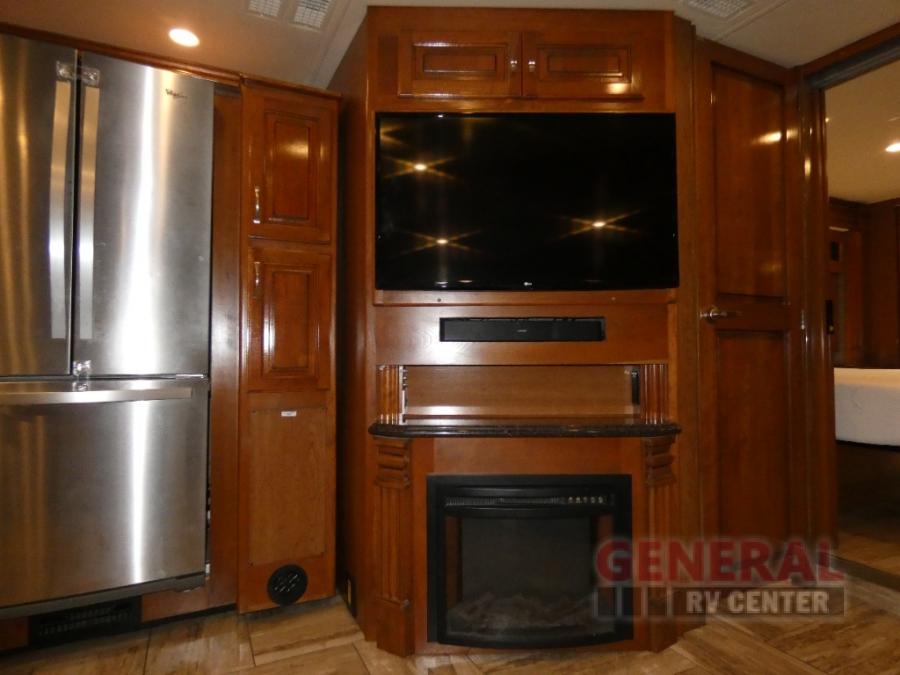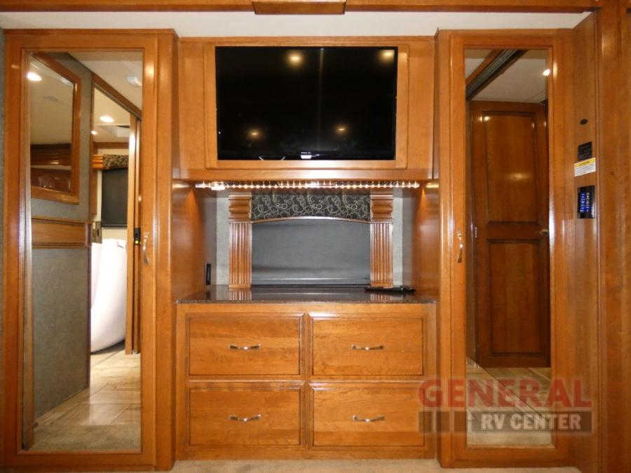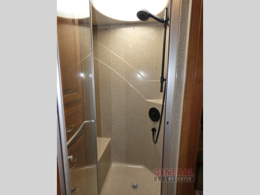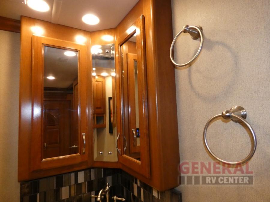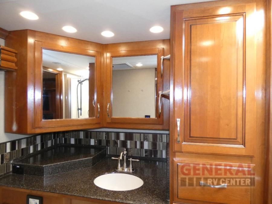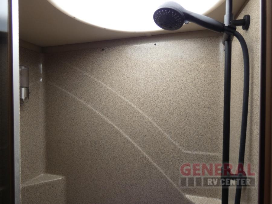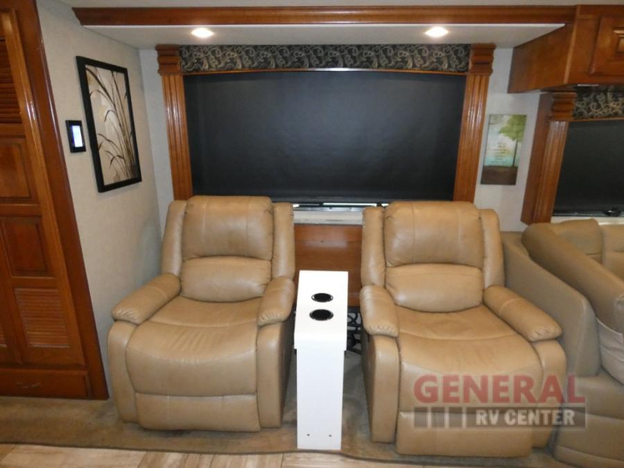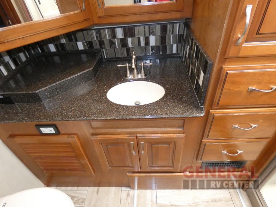 Mid-coach there is a convenient half-bath including a toilet, a corner vanity with sink, plus overhead storage. Within the middle of the full slide there is seating so you can relax during the daytime hours, and even take in a little television with a 43" LED TV along the angled bathroom wall. There is a storage cabinet next to the sofa for extra linens and other items.