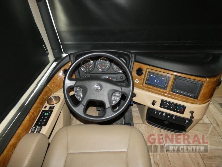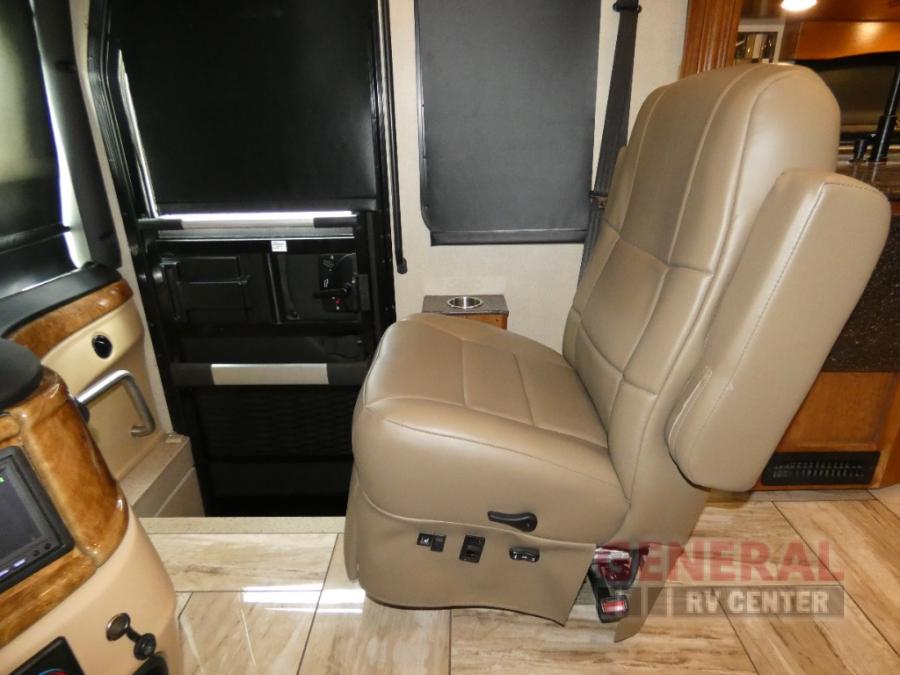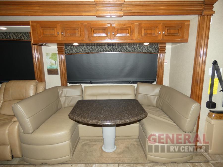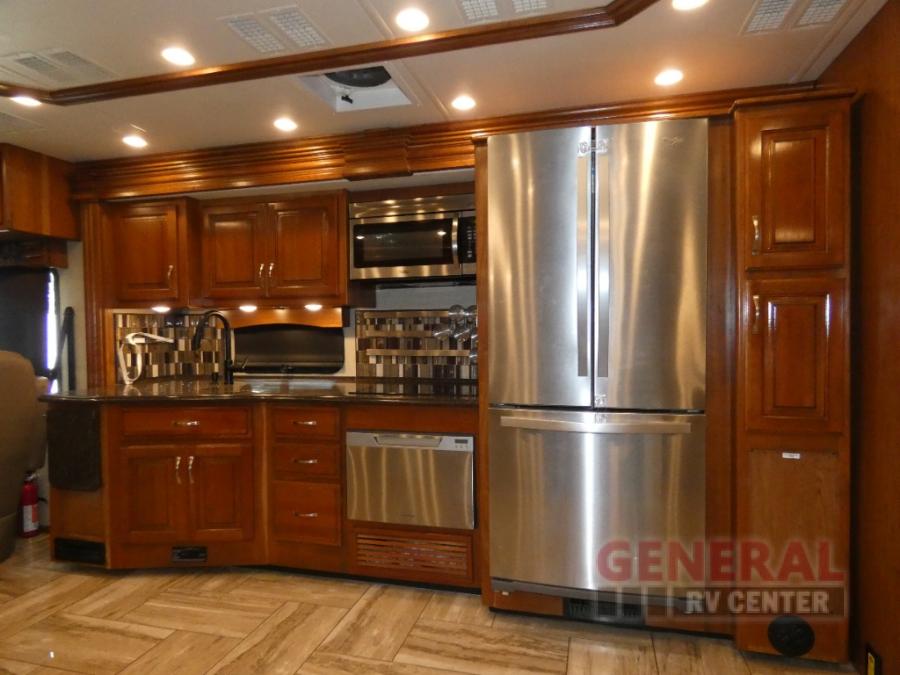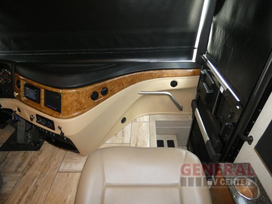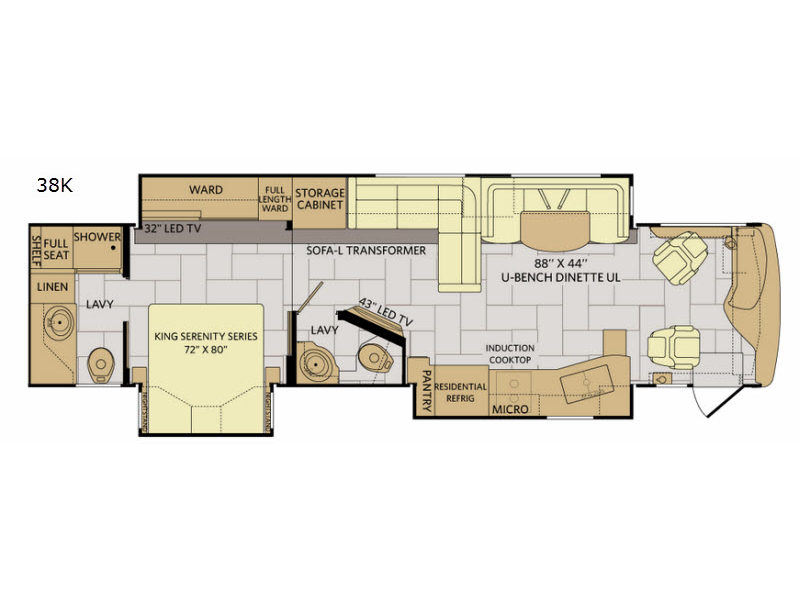 Step inside and take a look back at all of the convenient features that would make any journey enjoyable. Along the curb side just behind the passenger seat there is a slide out kitchen area that features a pull-out counter, a double sink, a two burner induction cook-top with overhead microwave oven, and a residential refrigerator. There is also a pantry for all of your dry and canned goods. Opposite in the front of the full wall slide along the driver's side enjoy a 88" x 44" u-shaped dinette with storage. Here you can enjoy your meals, and with the swivel captain's chairs turned toward the back of the coach you have a nice gathering spot up front.