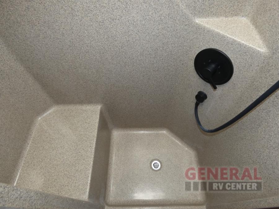 The rear master bedroom and bath offer a spacious retreat thanks to the slide out king bed along the curb side, and more roominess due to the bedroom being within the end of the full wall slide as well. You will find a full length wardrobe, more clothing storage, plus a 32" LED TV along the full wall slide. The king Serenity Series bed features nightstands on either side, plus a bit of overhead storage too.